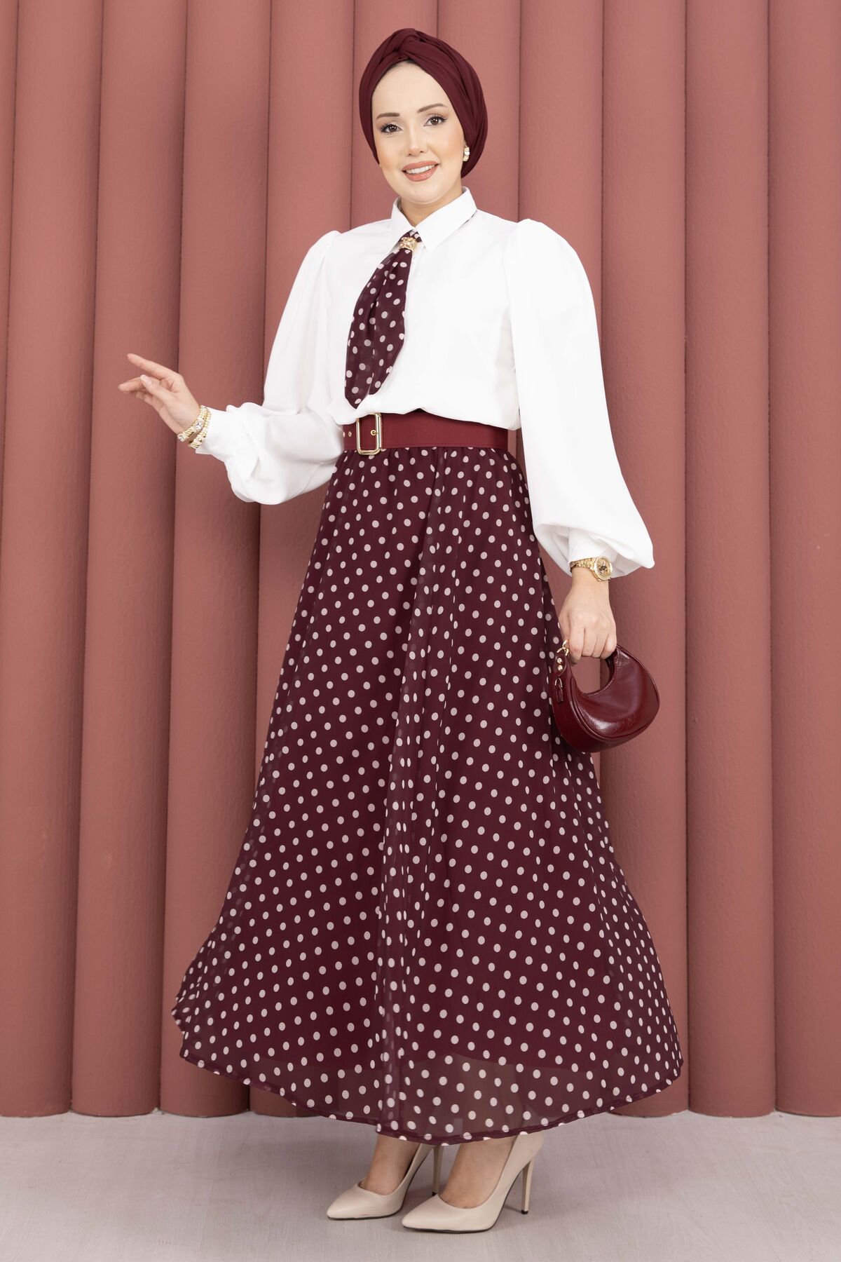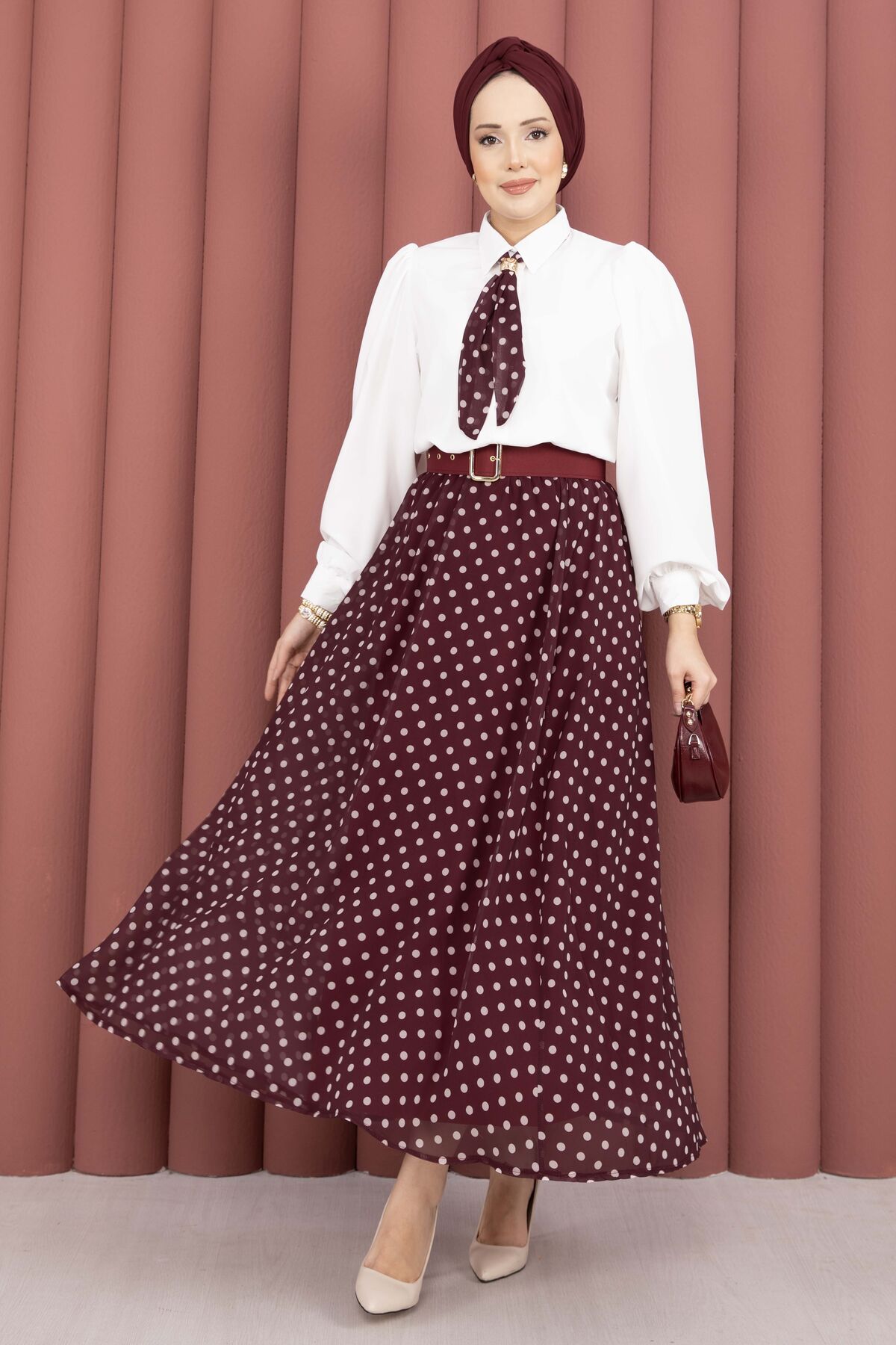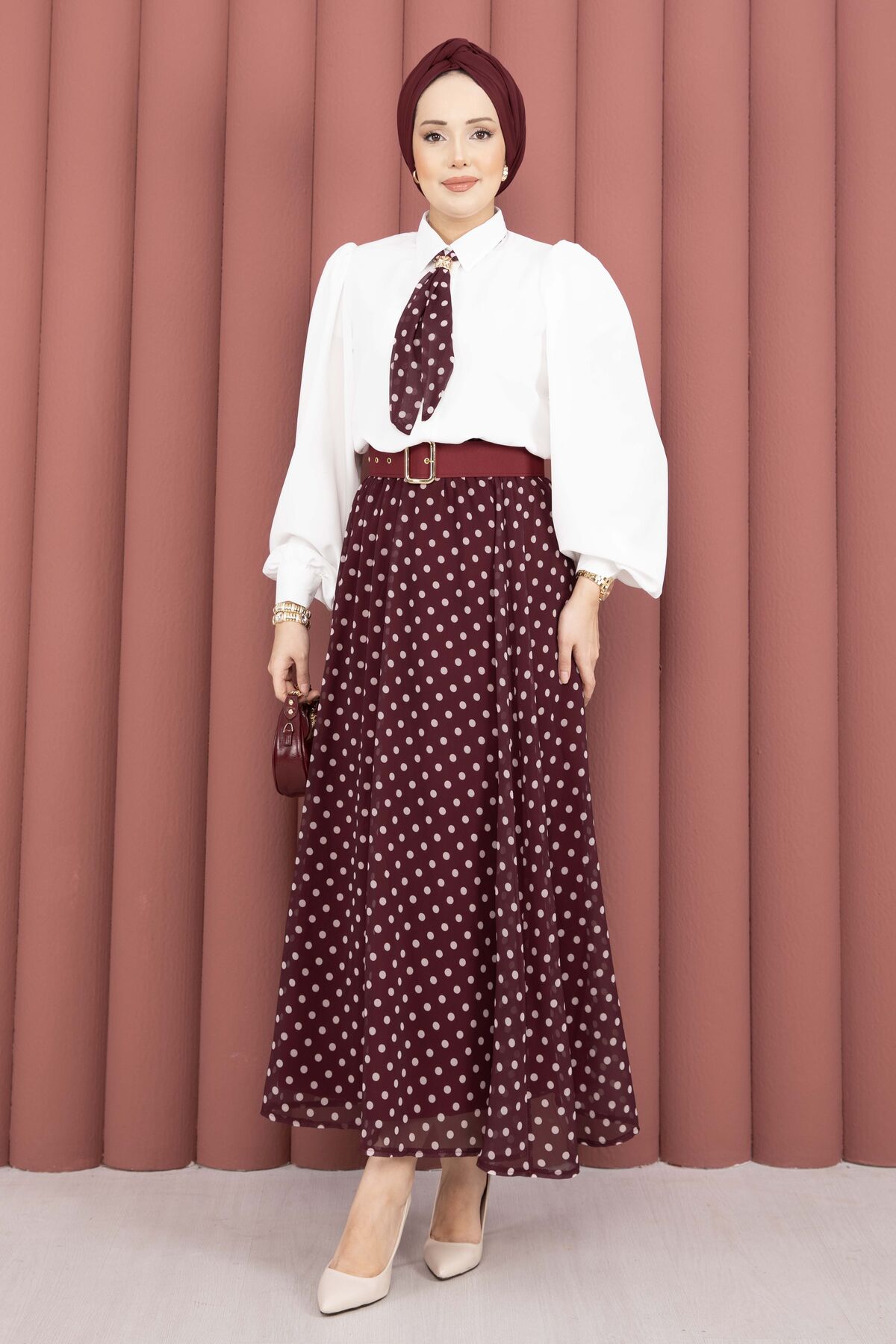 Fularlı Gömlek & Puantiyeli Kemerli Etek Takım
