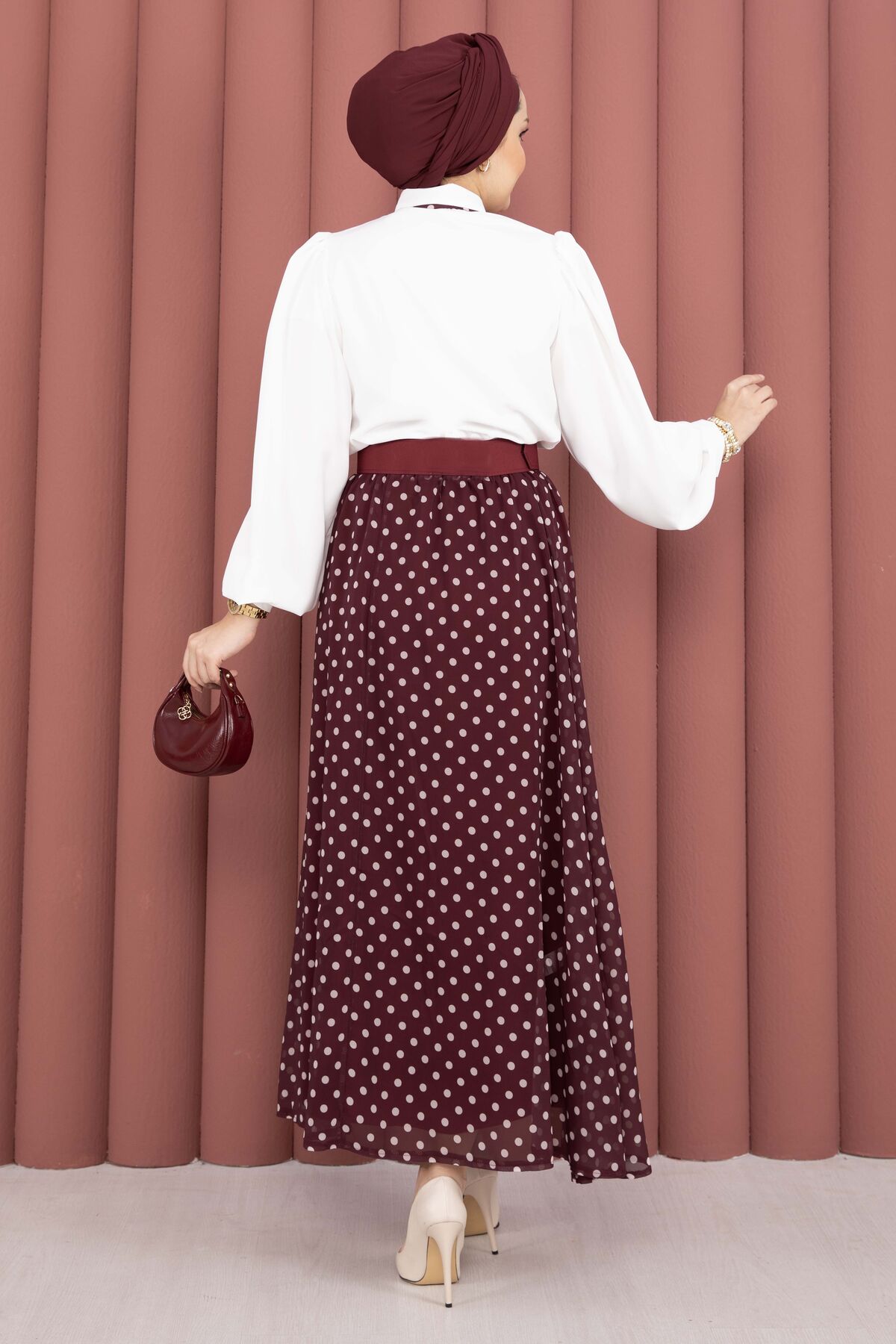 Nostaljik ve zarif tasarımıyla öne çıkan bu takım, puantiyeli etek ve fular detaylı gömlek kombininden oluşur. Gömlek yakasındaki fular, gold renkli halka aksesuarından geçirilerek kullanılır ve şık bir görünüm sağlar.