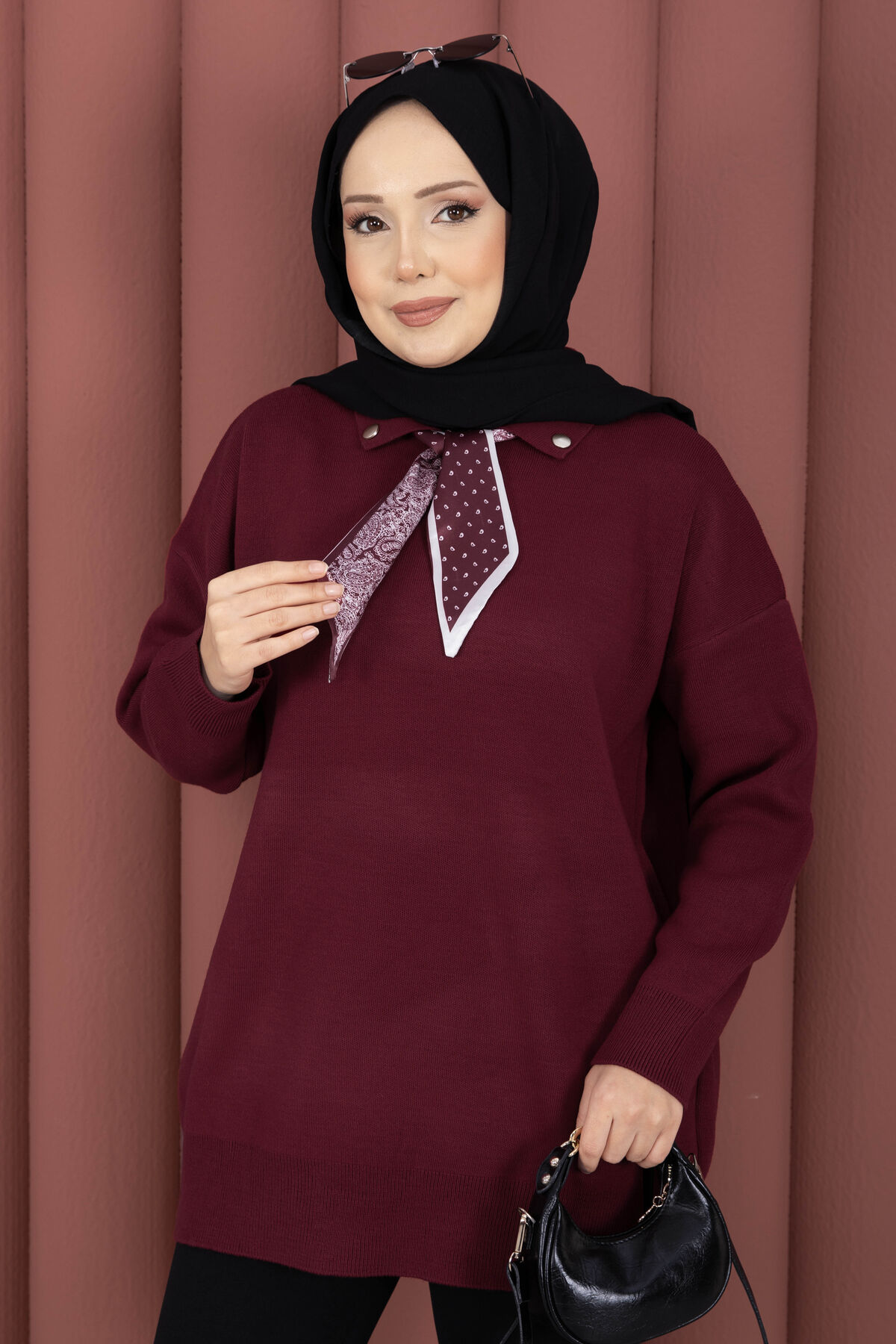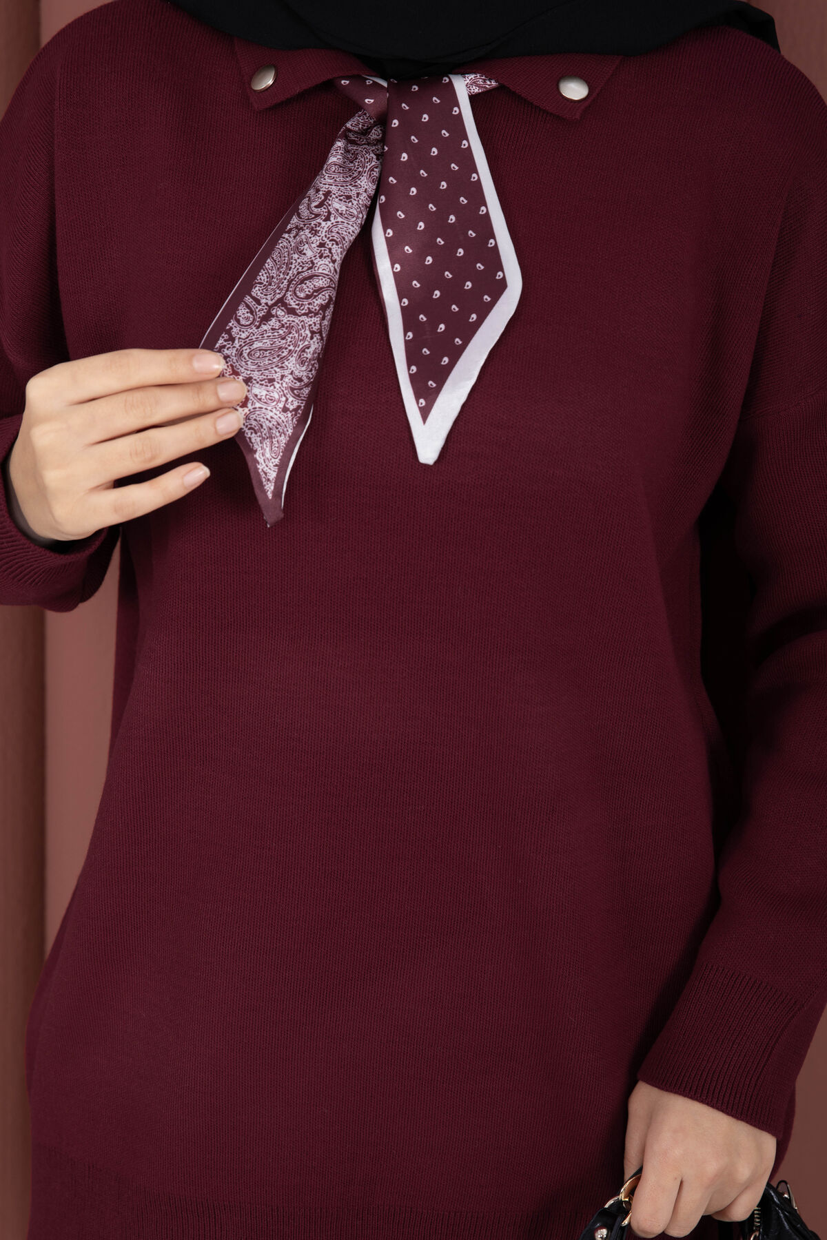 Fularlı Polo Yaka Triko Kazak Bordo
