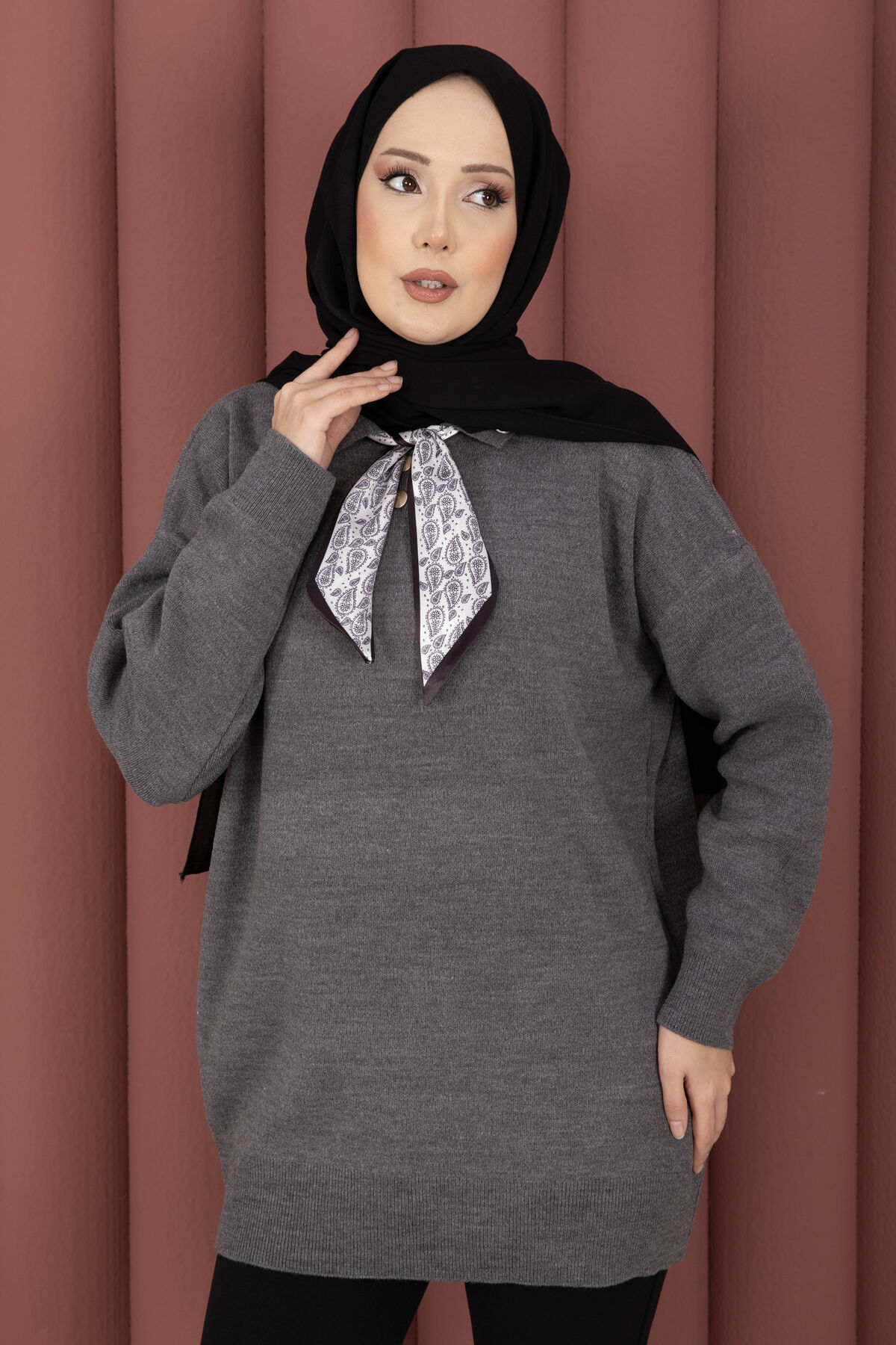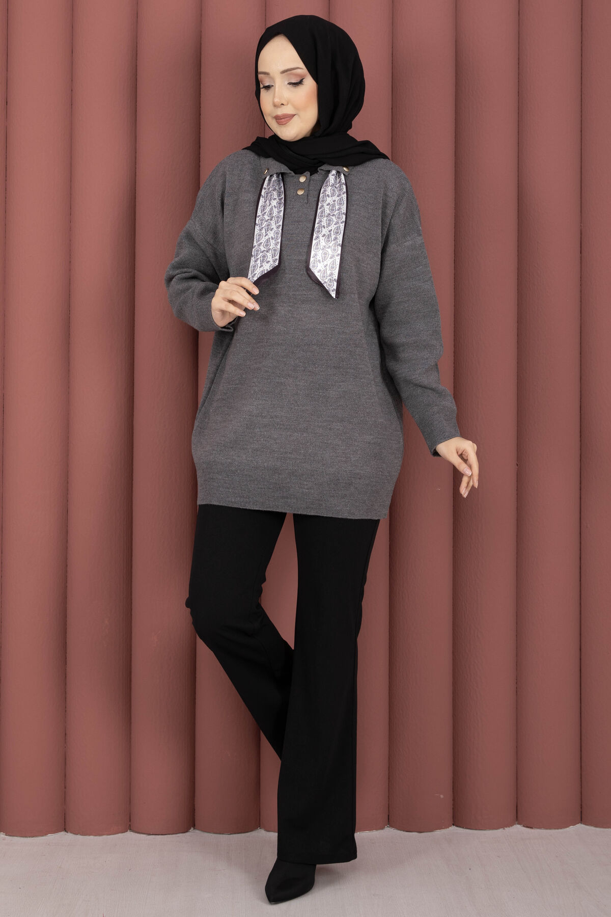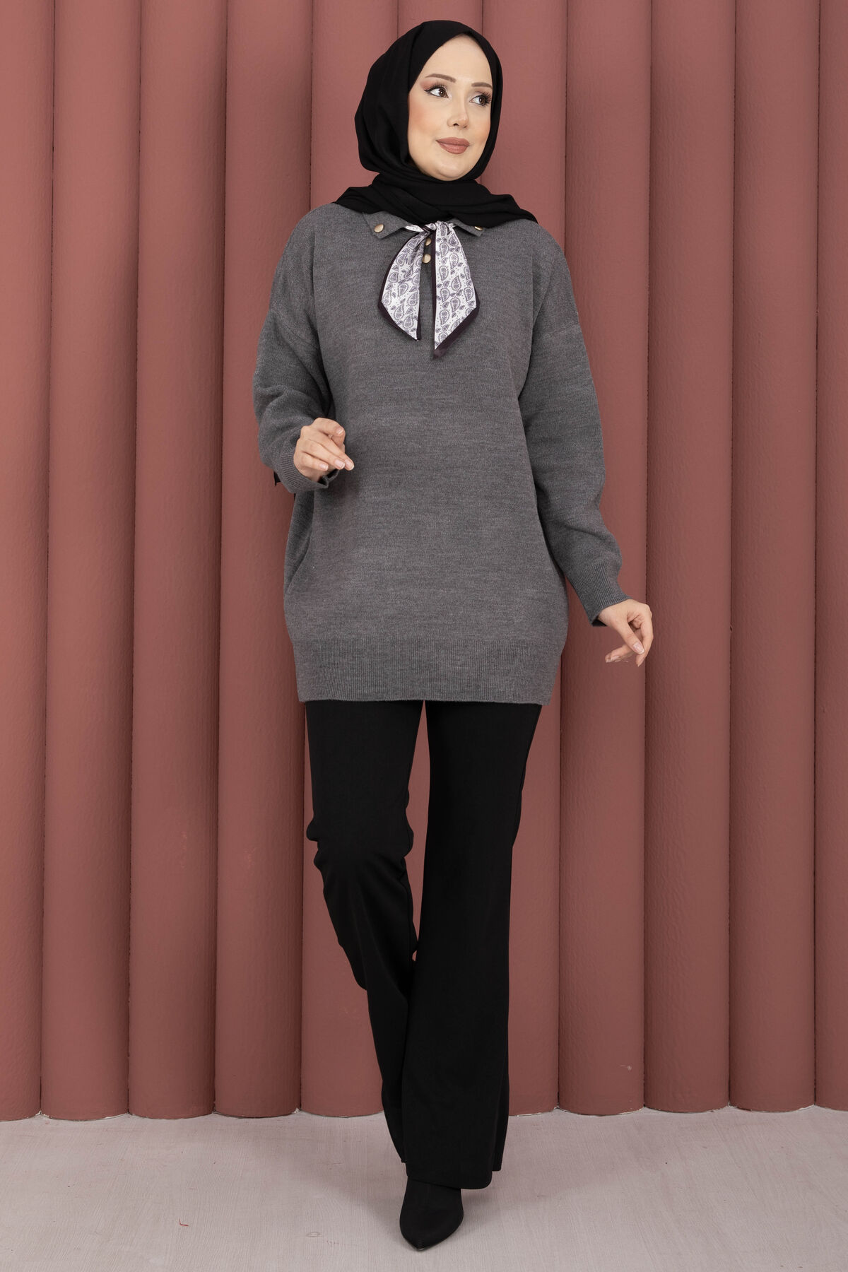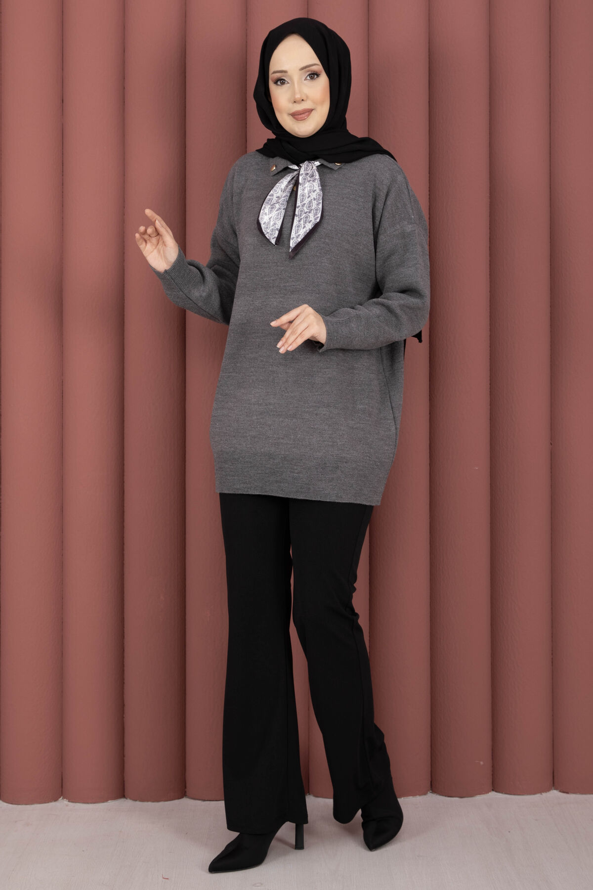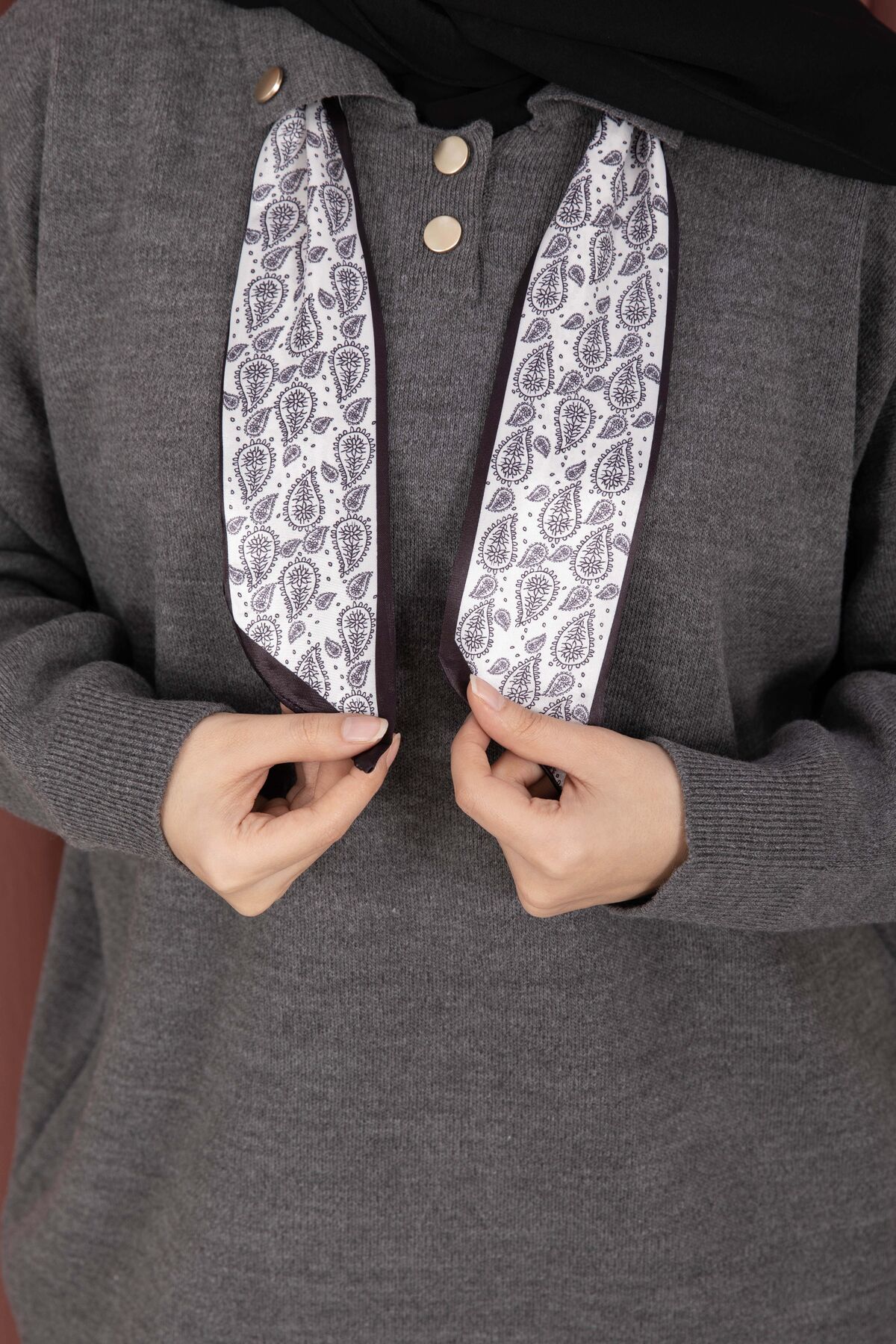 Fularlı Polo Yaka Triko Kazak Gri