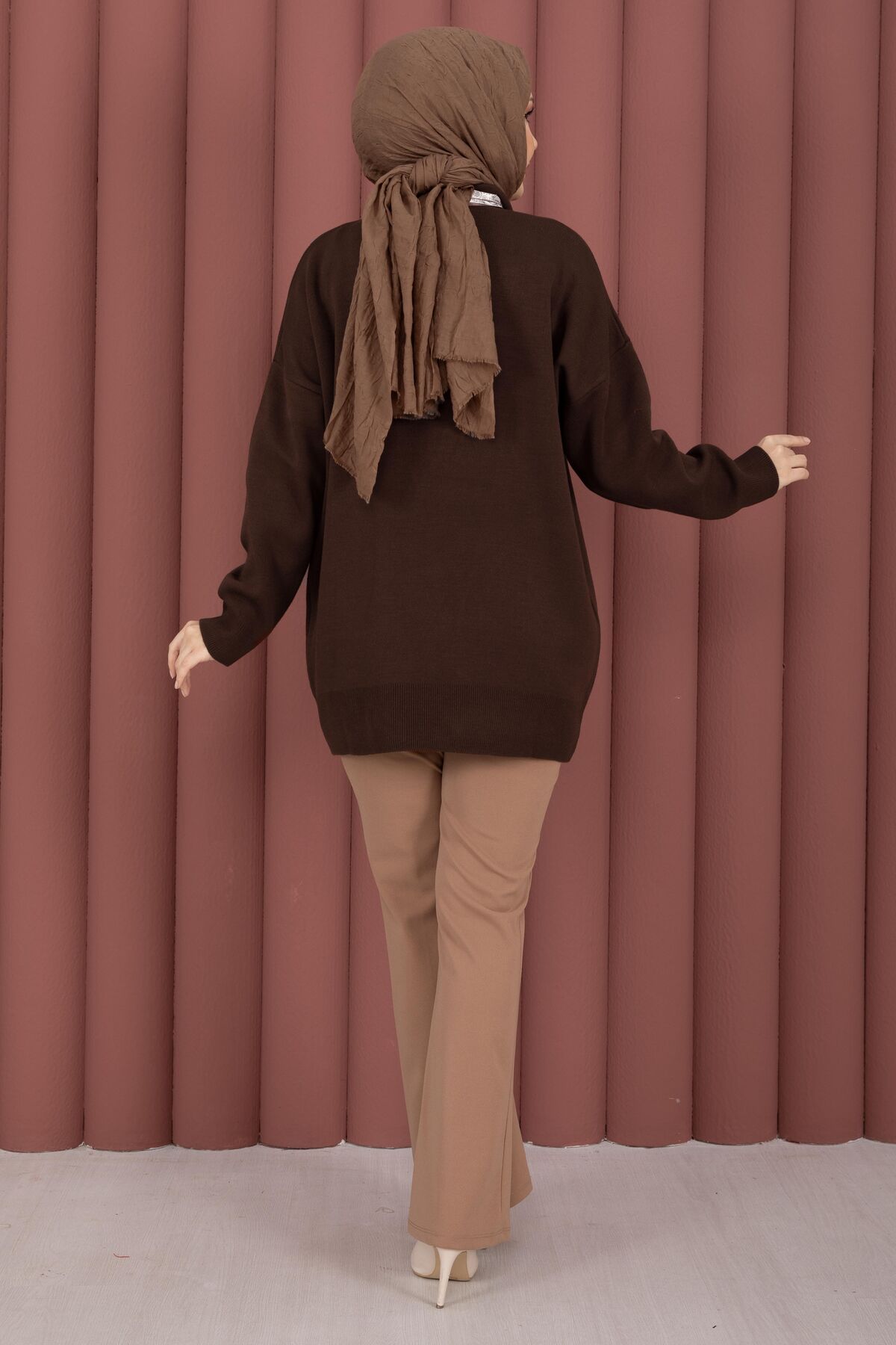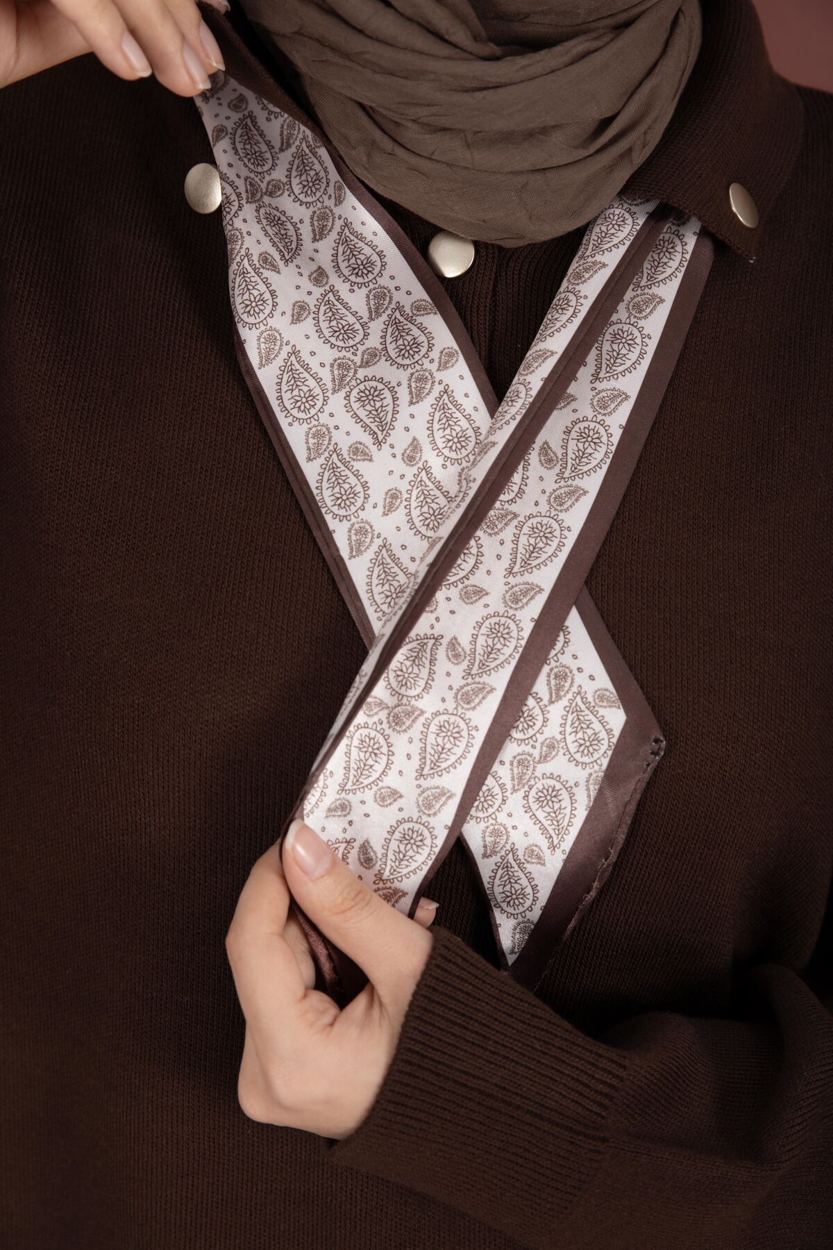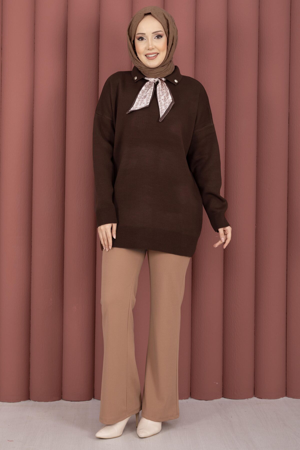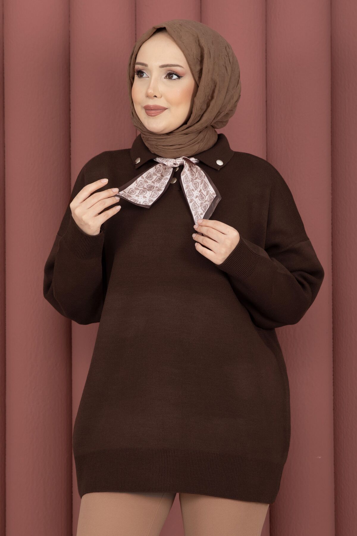 Fularlı Polo Yaka Triko Kazak Kahve