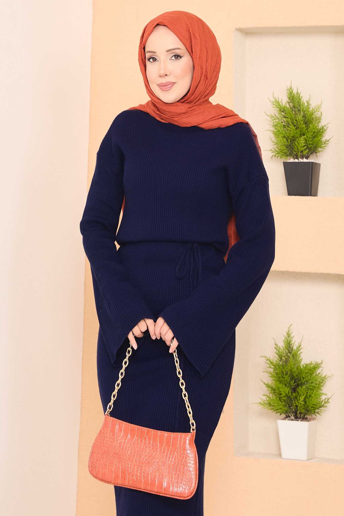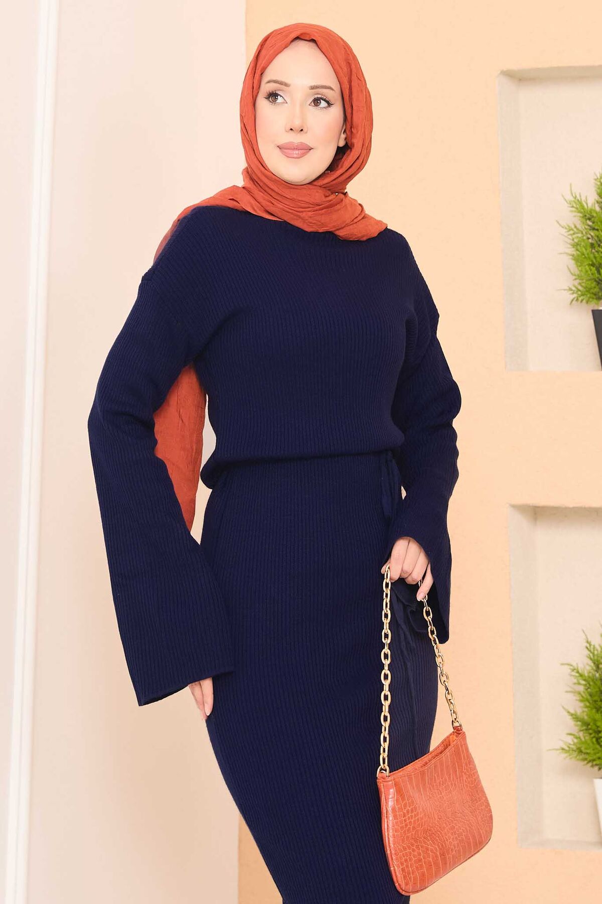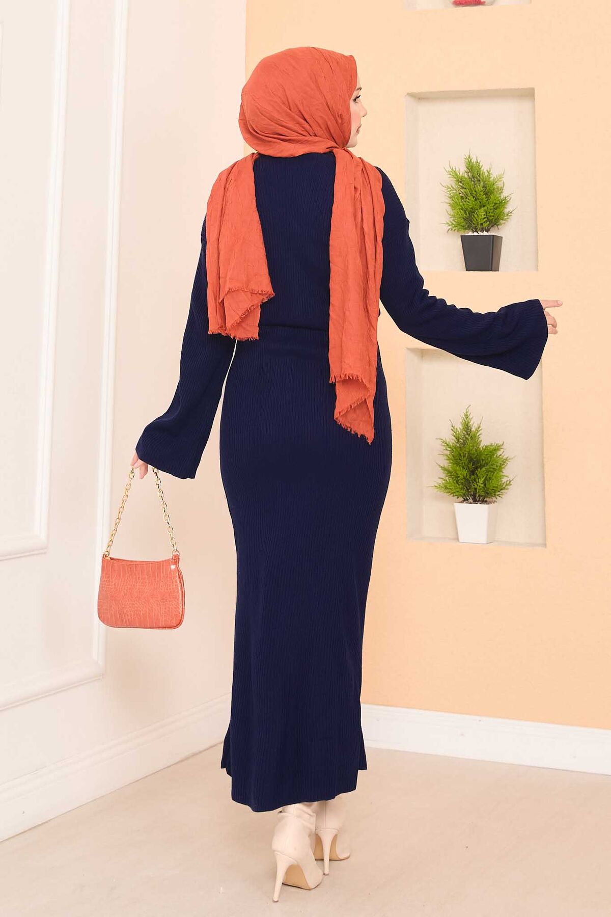 Genişkol FitilliTesettür Triko Elbise Lacivert