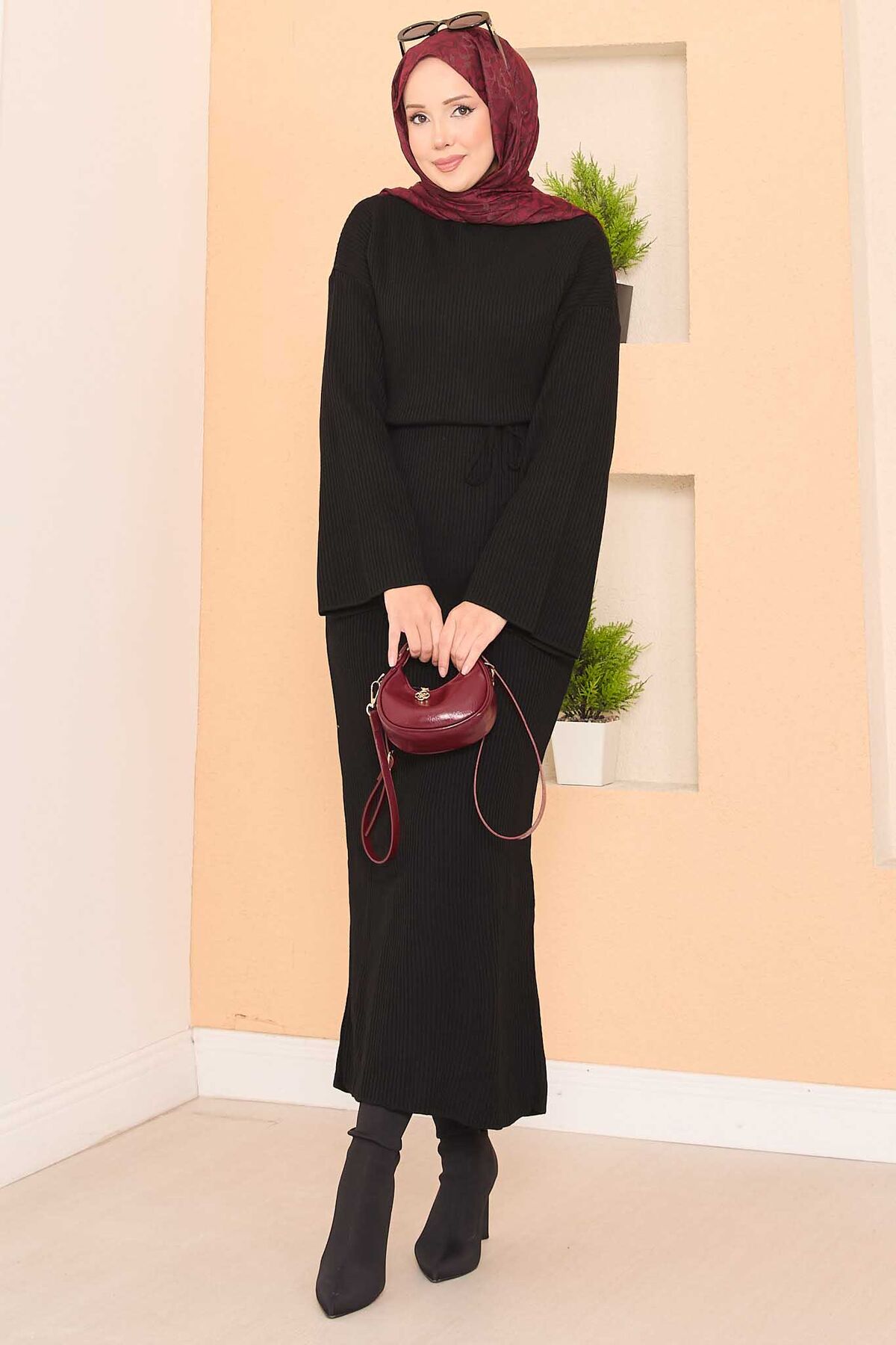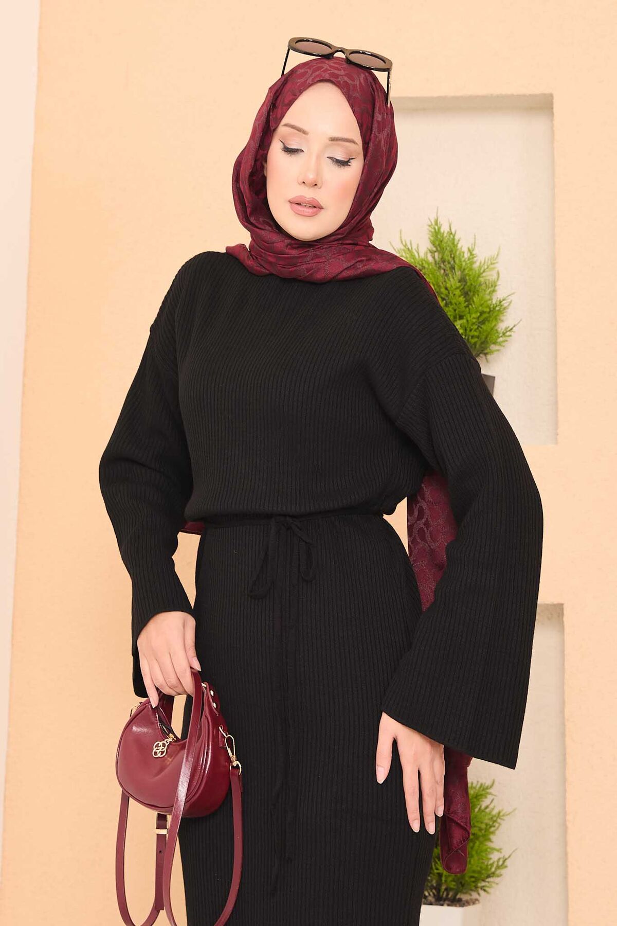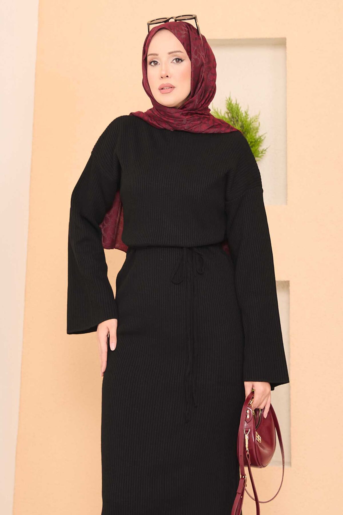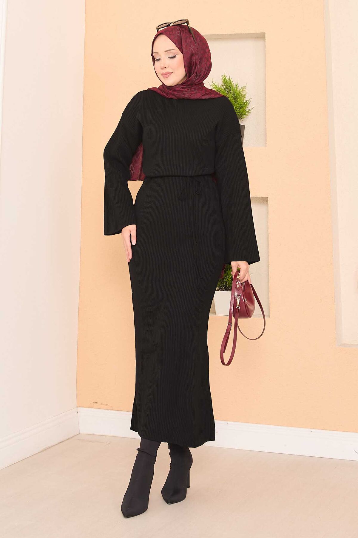 Genişkol FitilliTesettür Triko Elbise Siyah