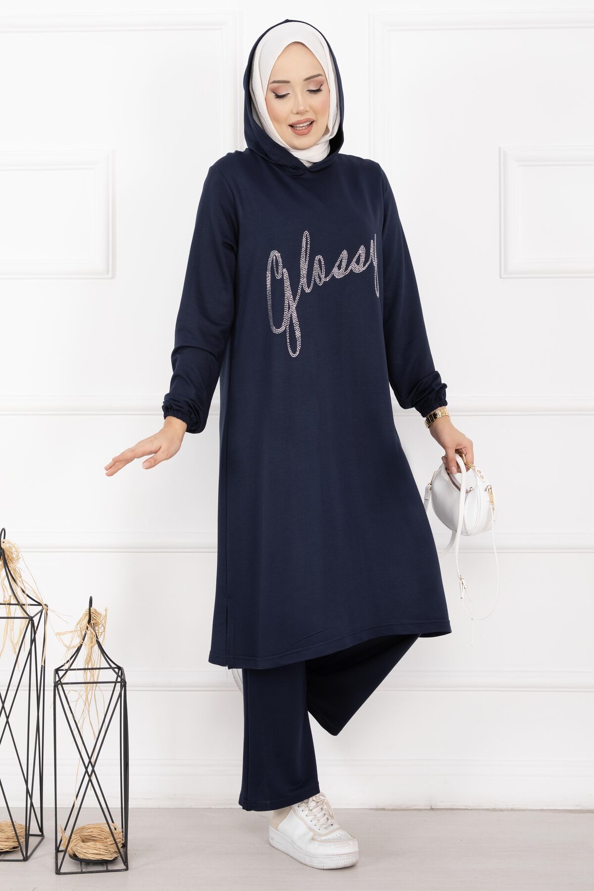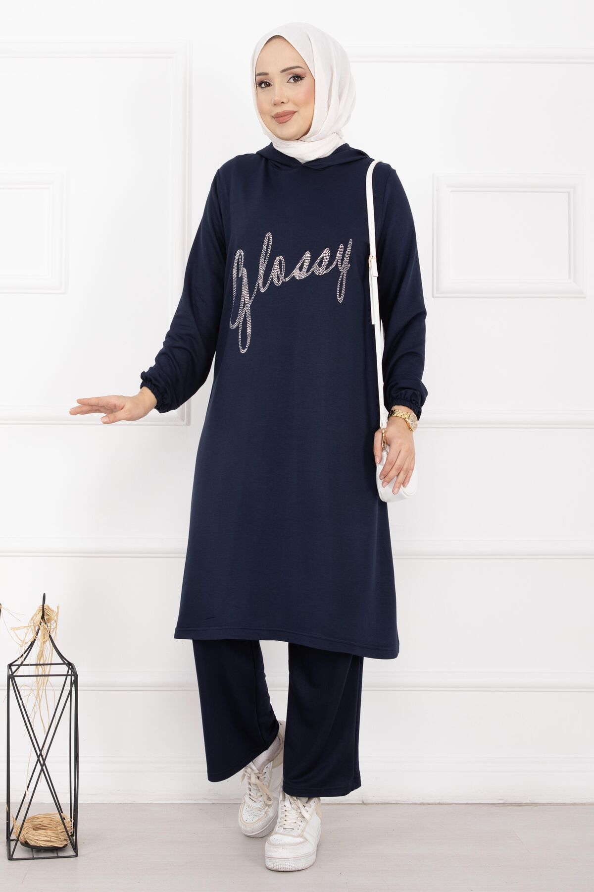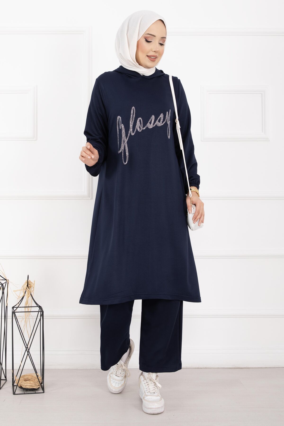 Glossy Taş Detaylı Kapüşonlu Tesettür Takım Lacivert