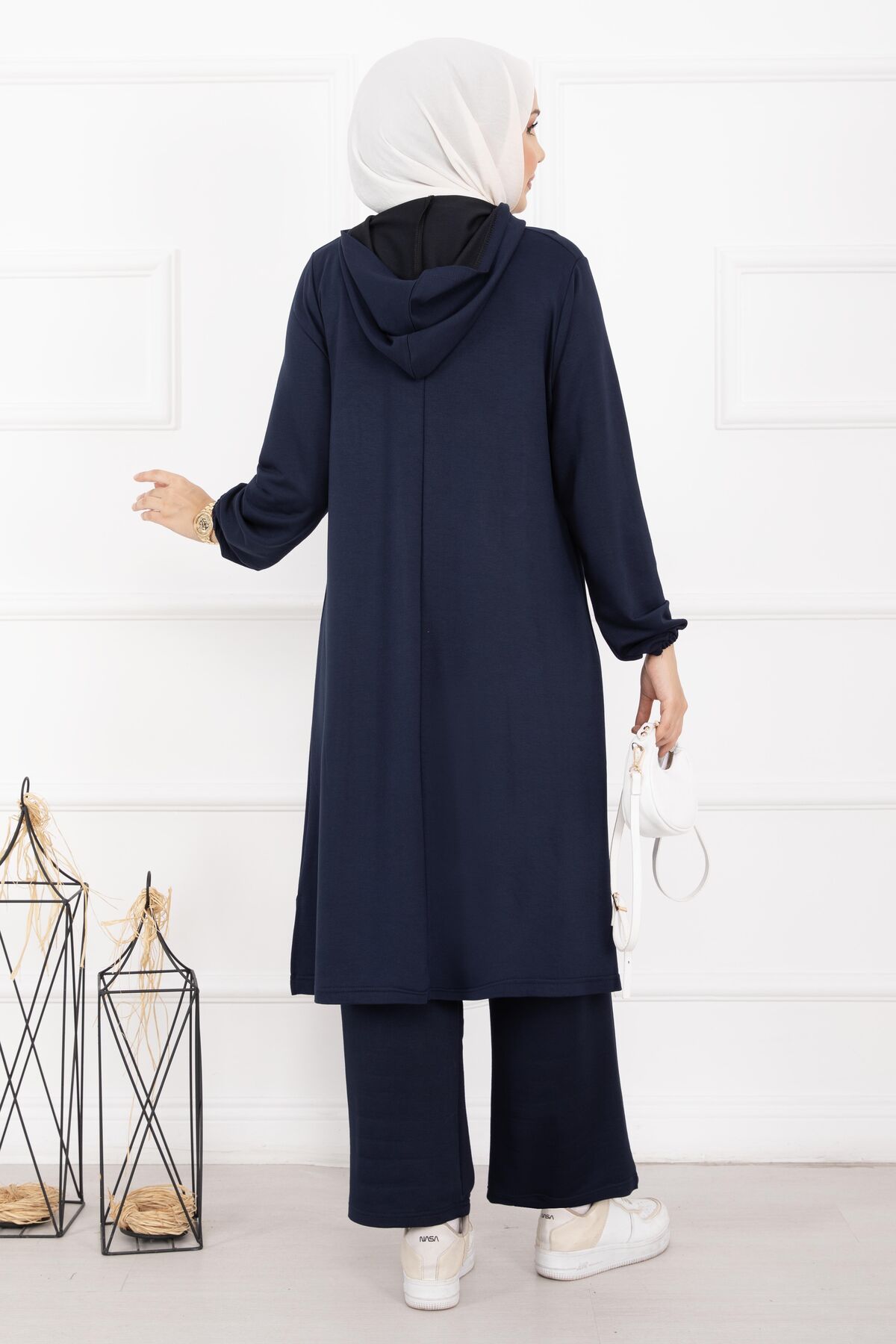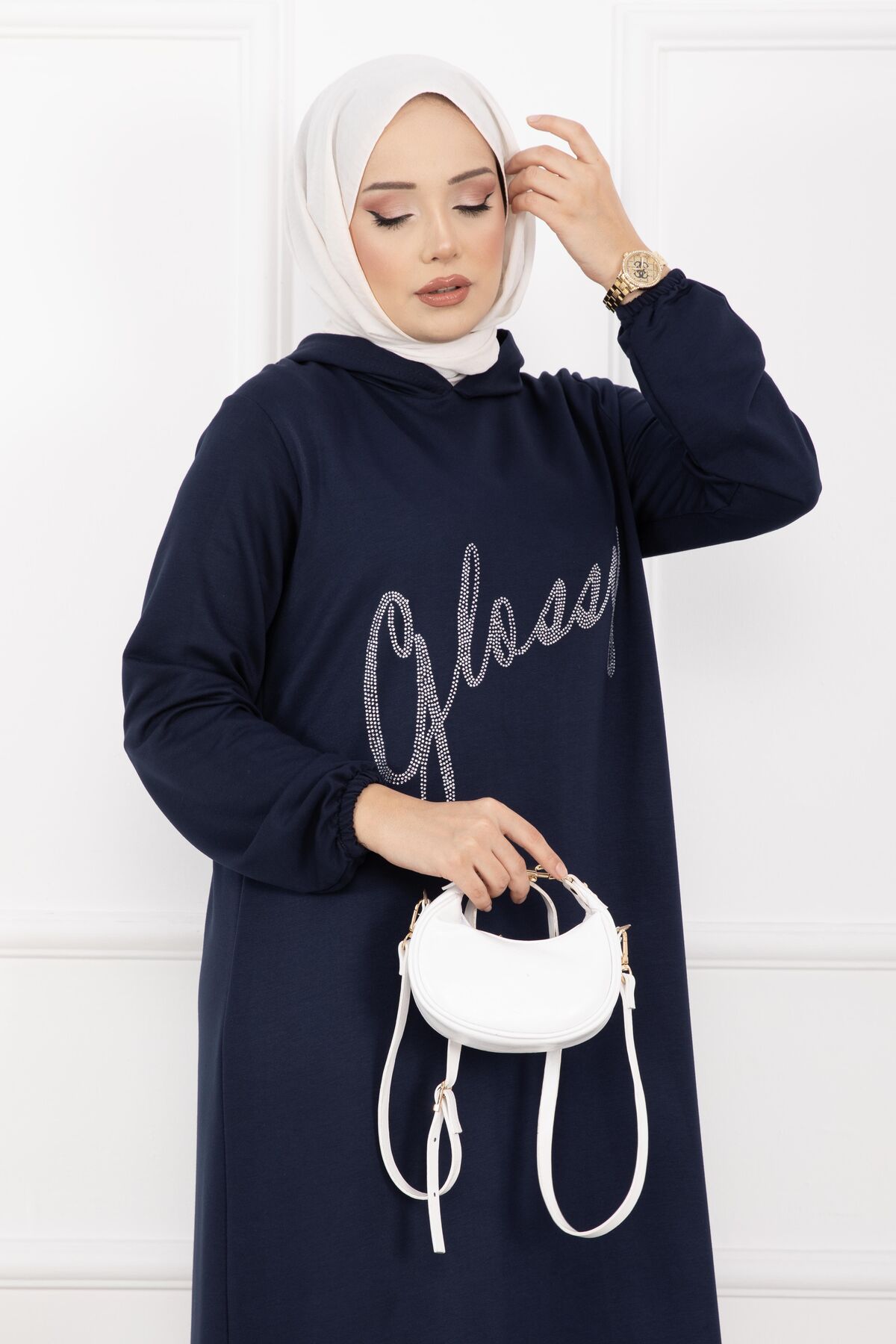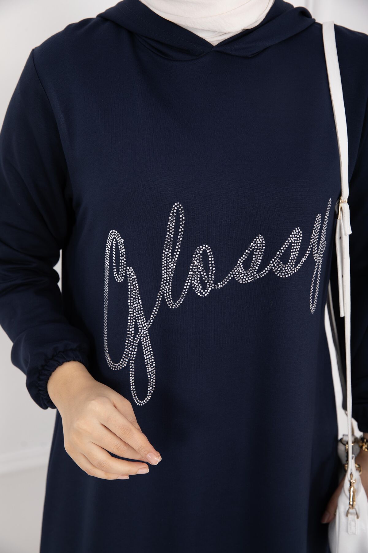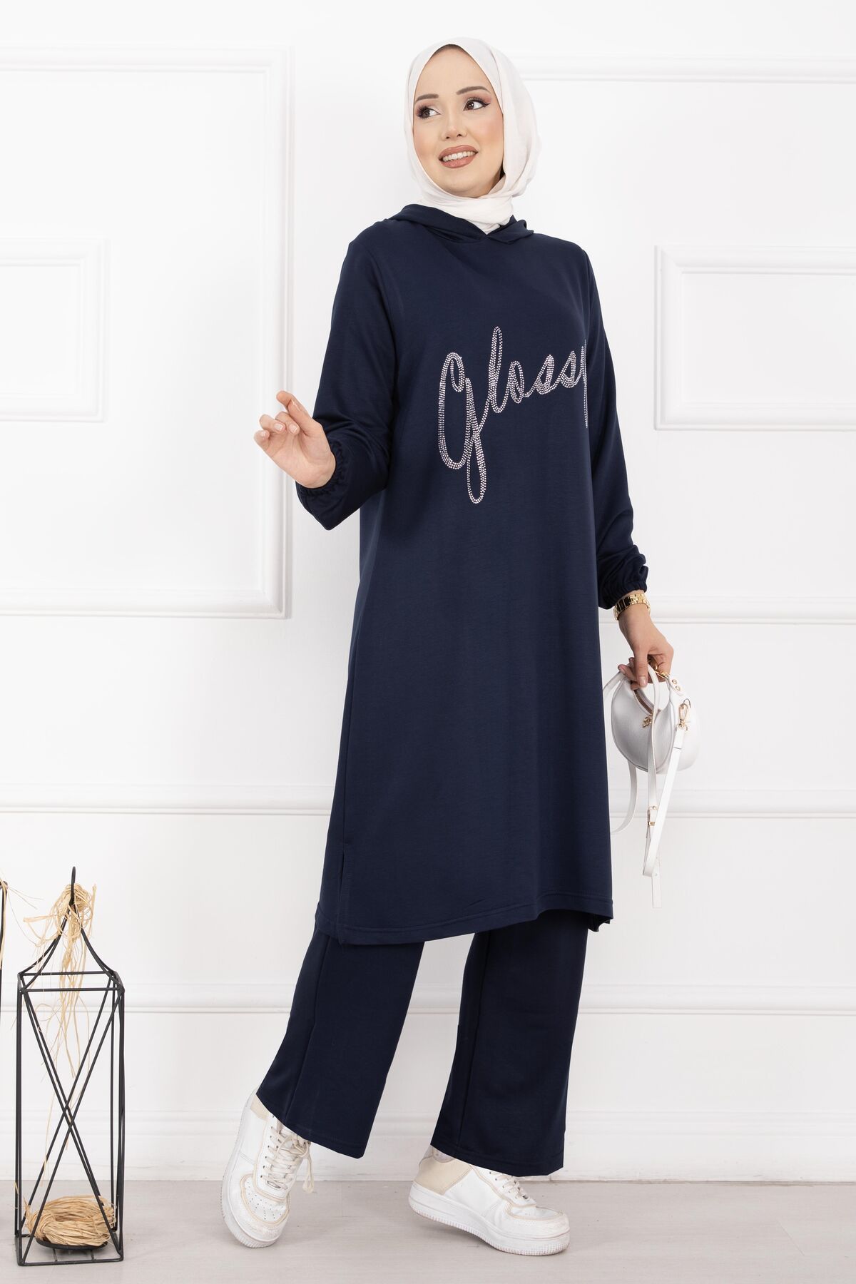 Glossy Taş Detaylı Kapüşonlu Tesettür Takım Lacivert
