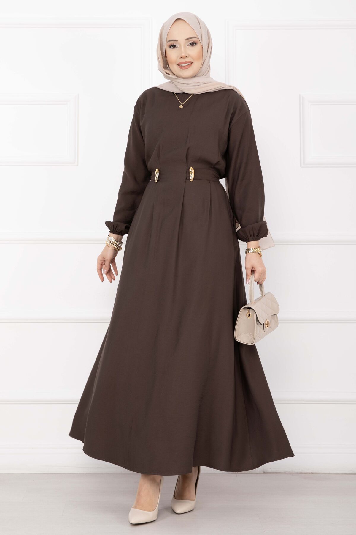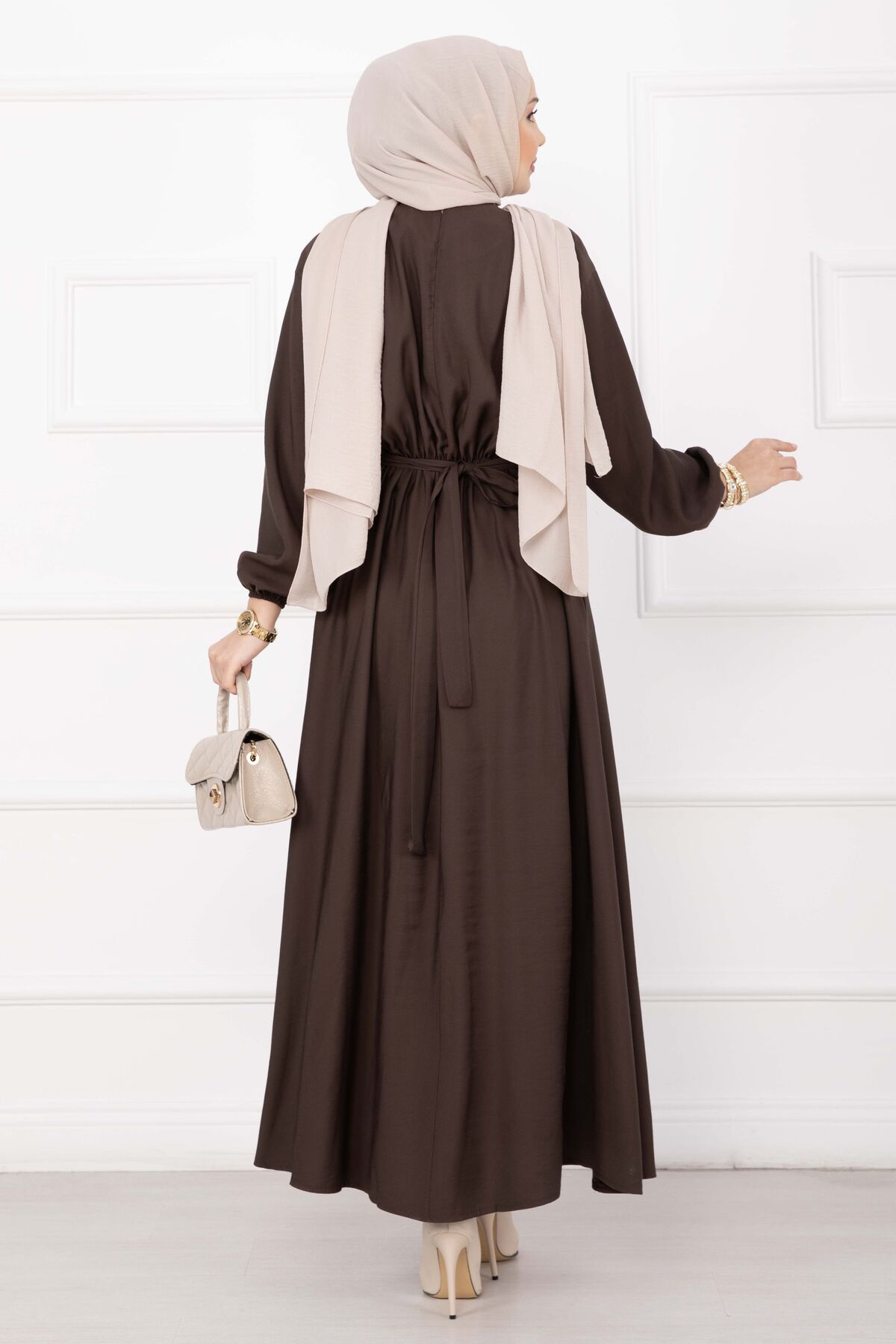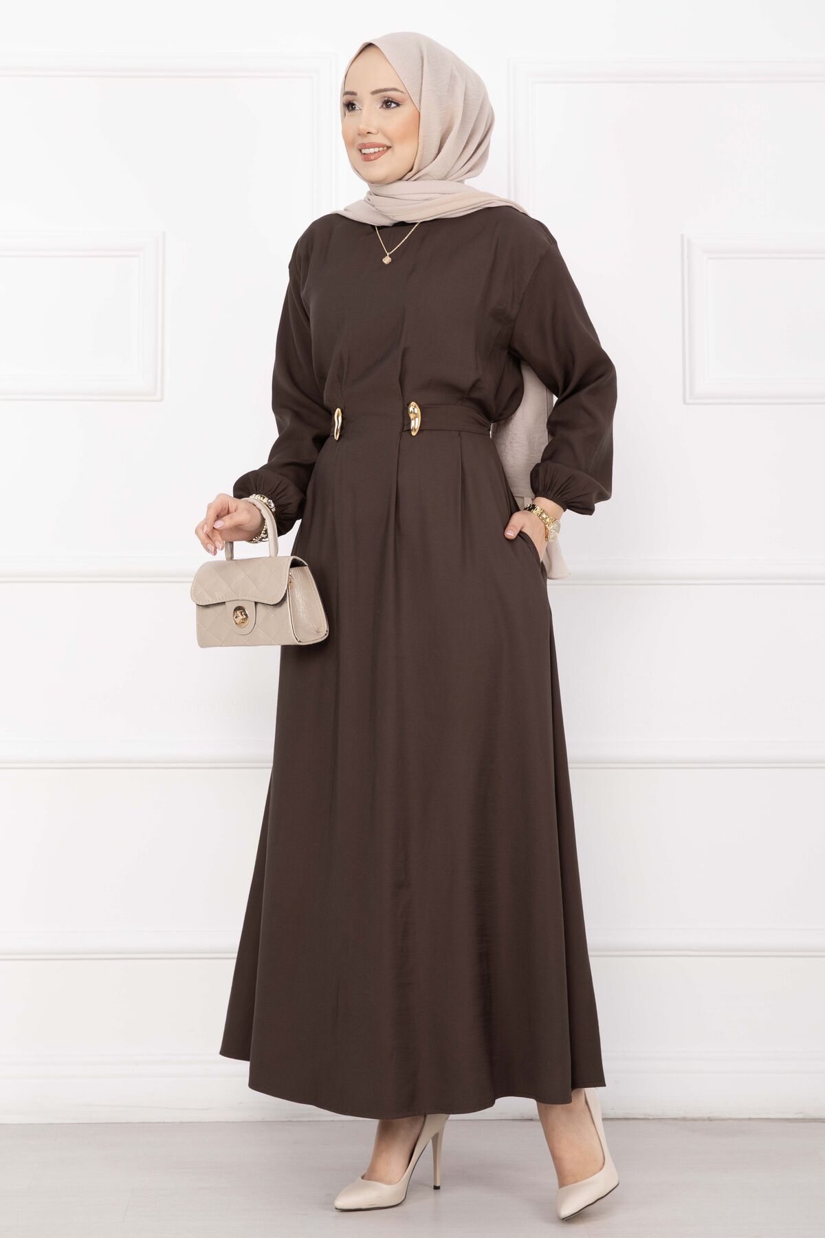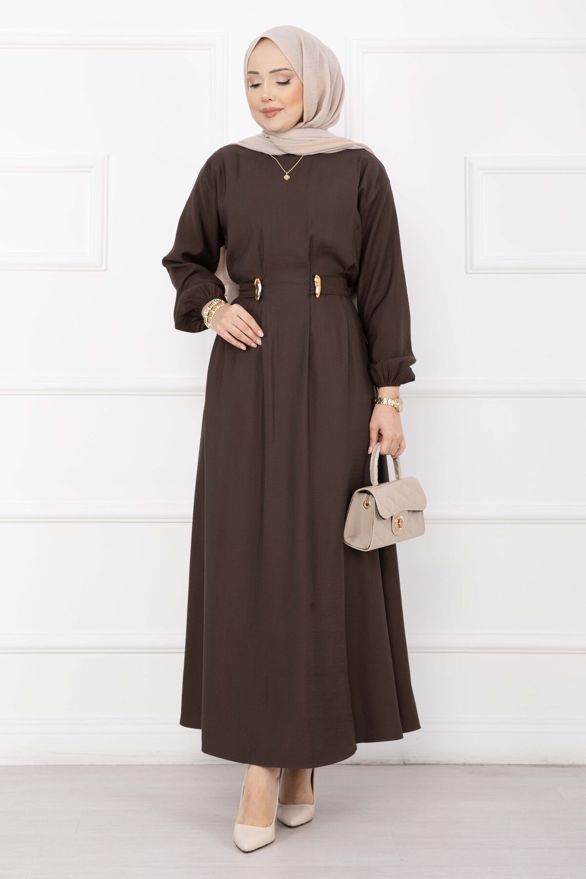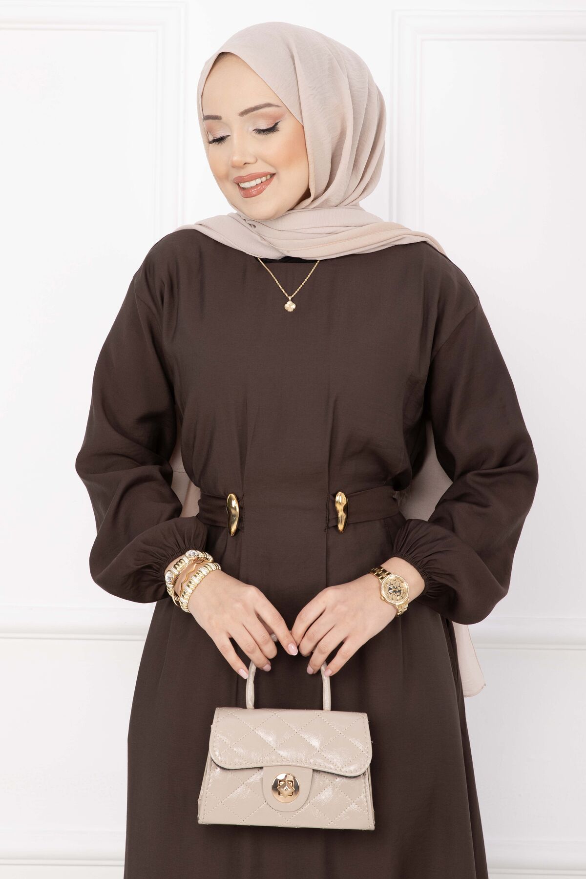 Gold Broş Bel Detaylı Tesettür Elbise Kahve