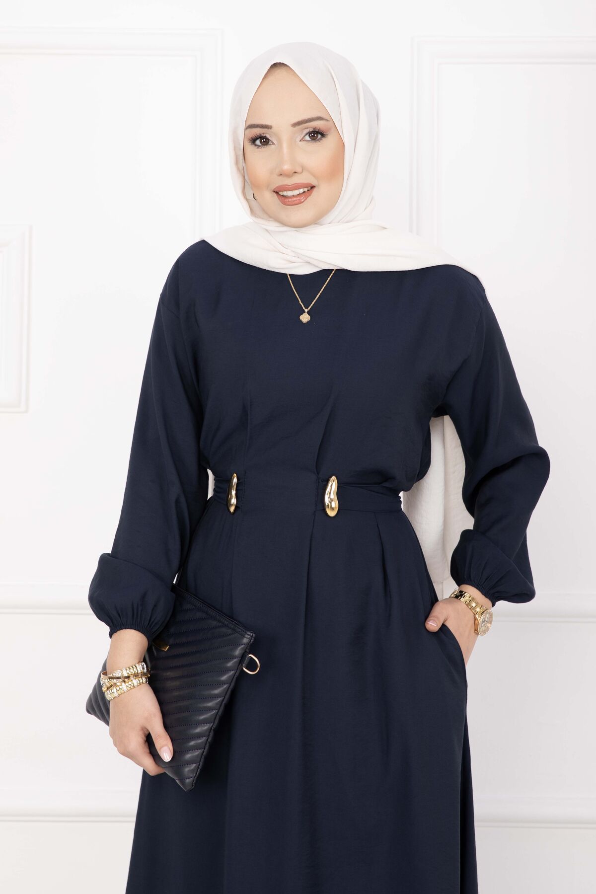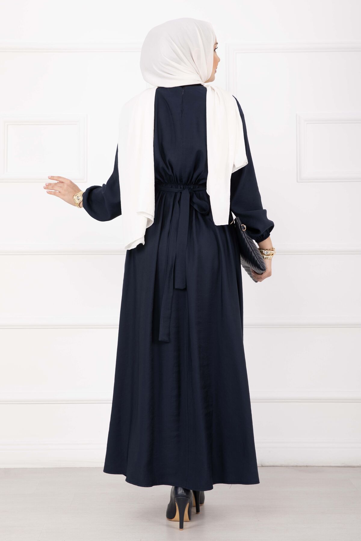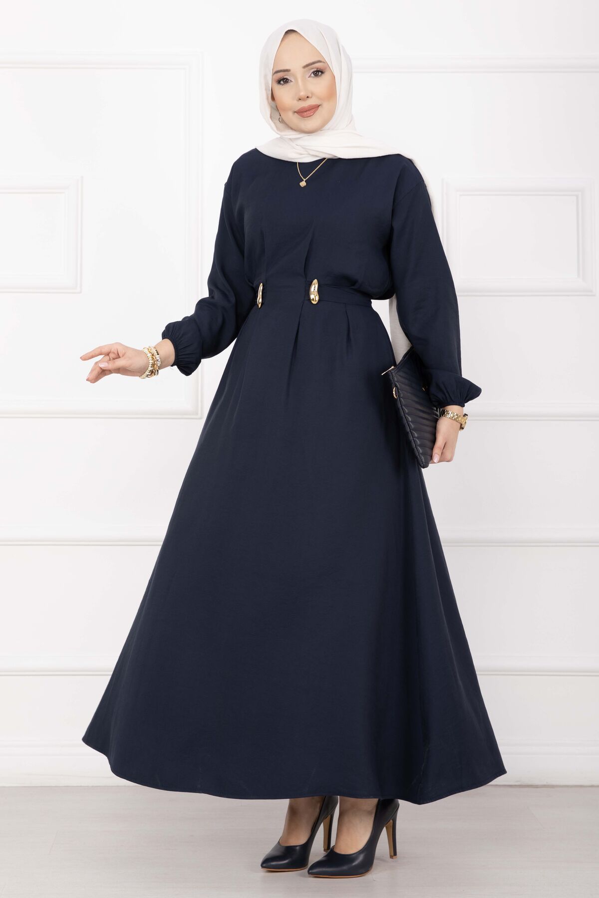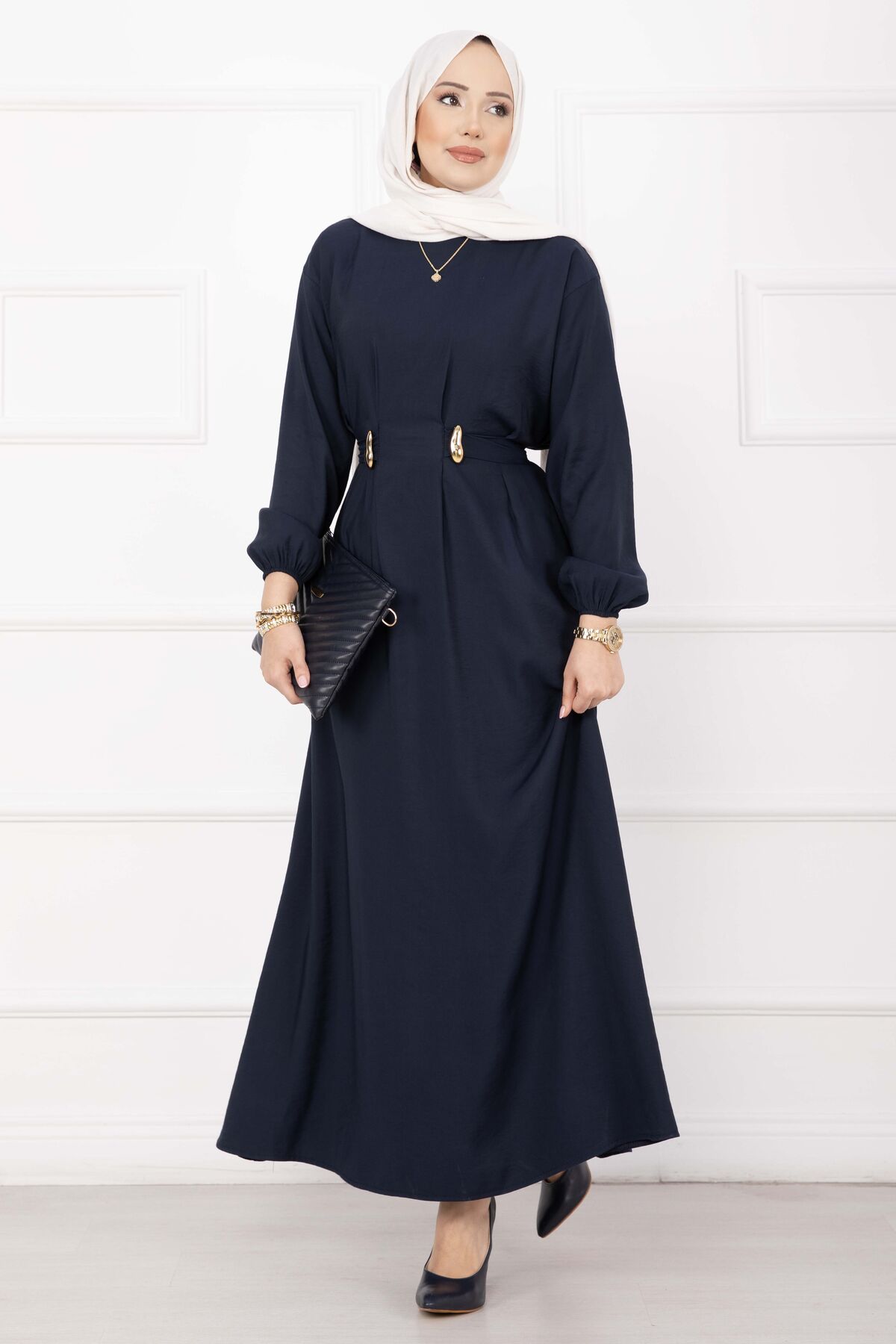 Gold Broş Bel Detaylı Tesettür Elbise Lacivert