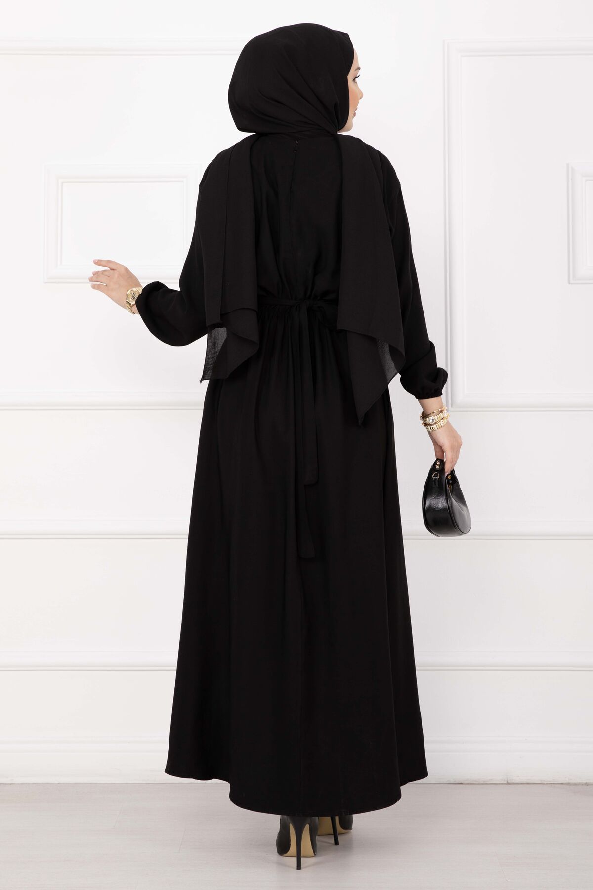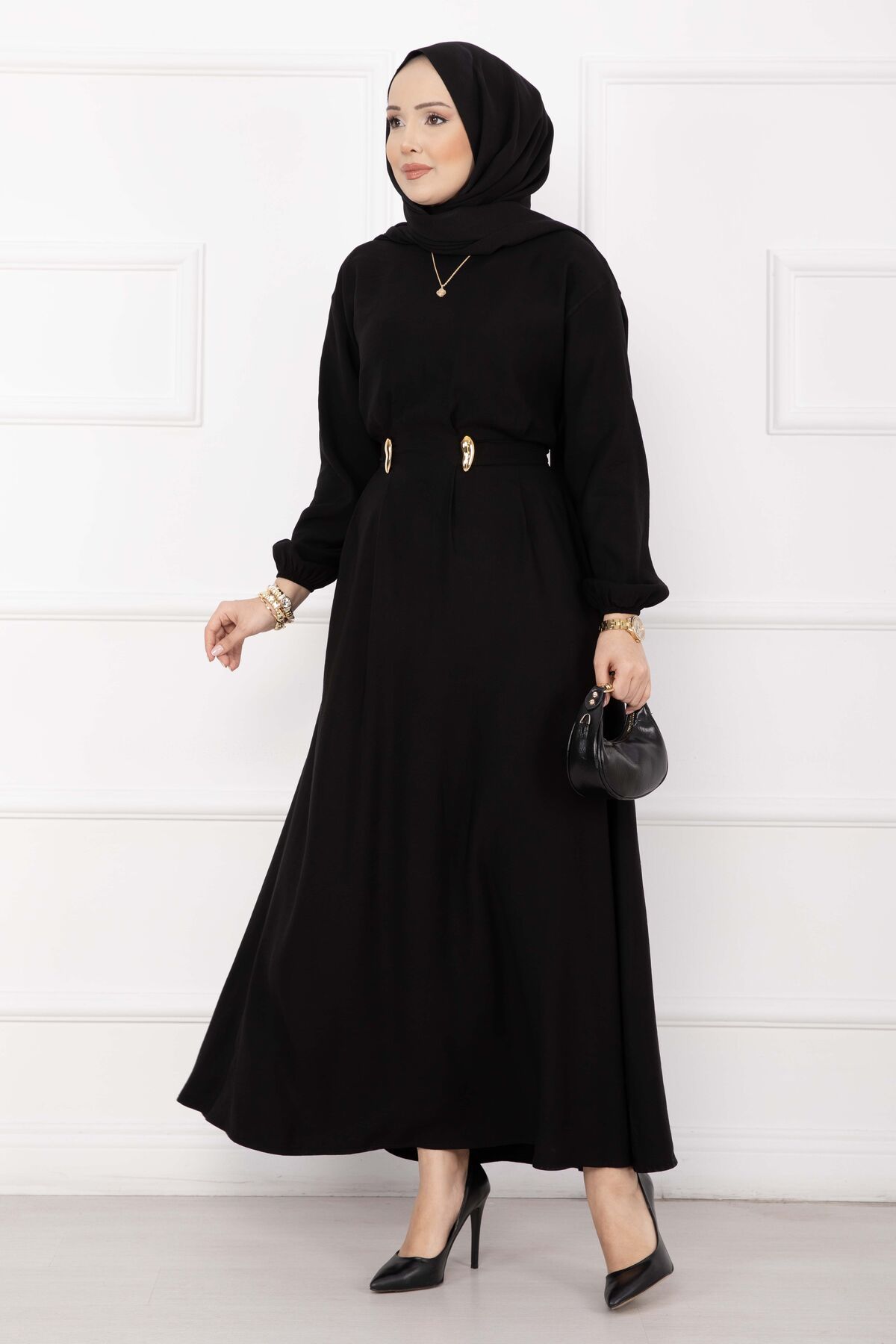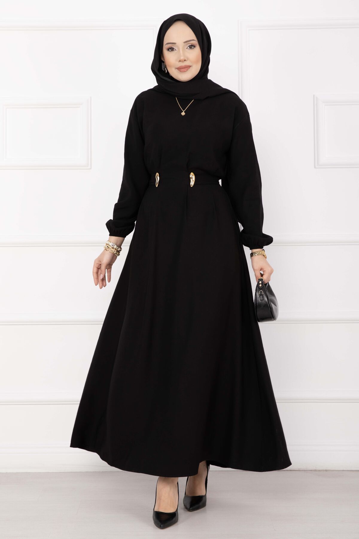 Gold Broş Bel Detaylı Tesettür Elbise Siyah