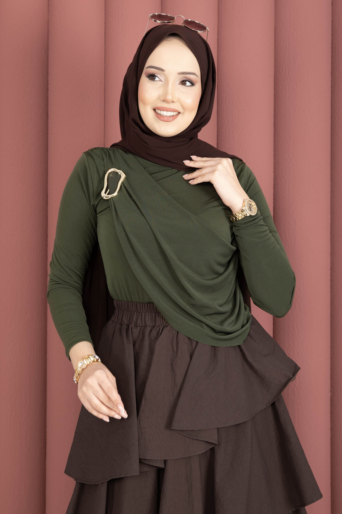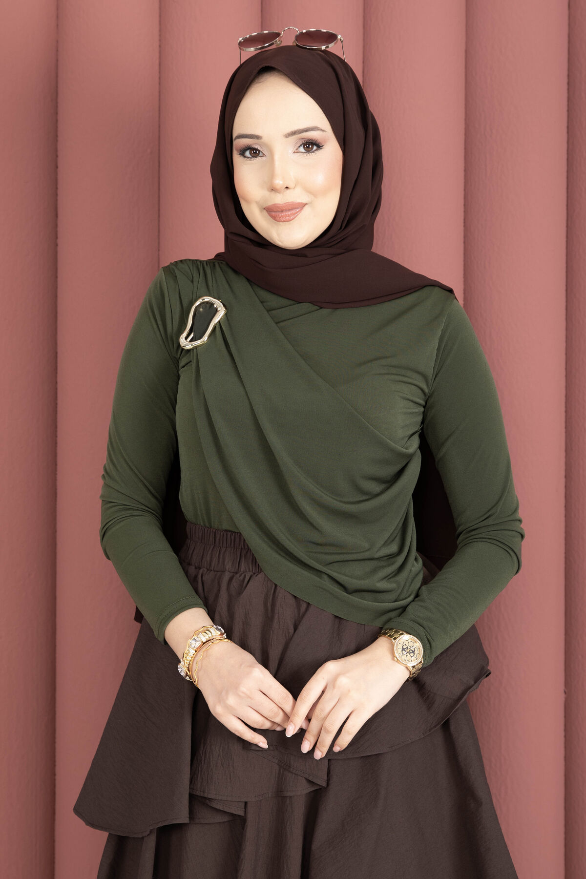 Gold Broş Detaylı Sandy Body Haki