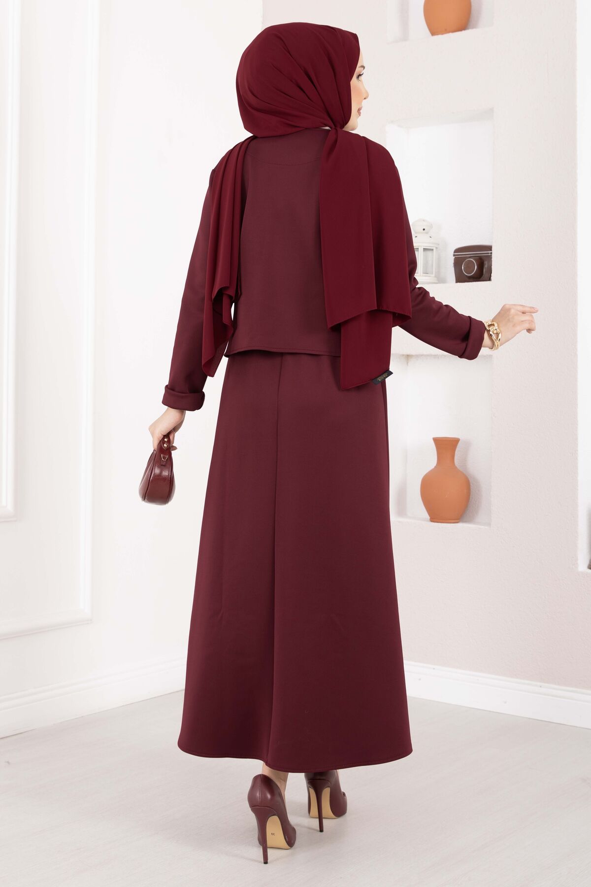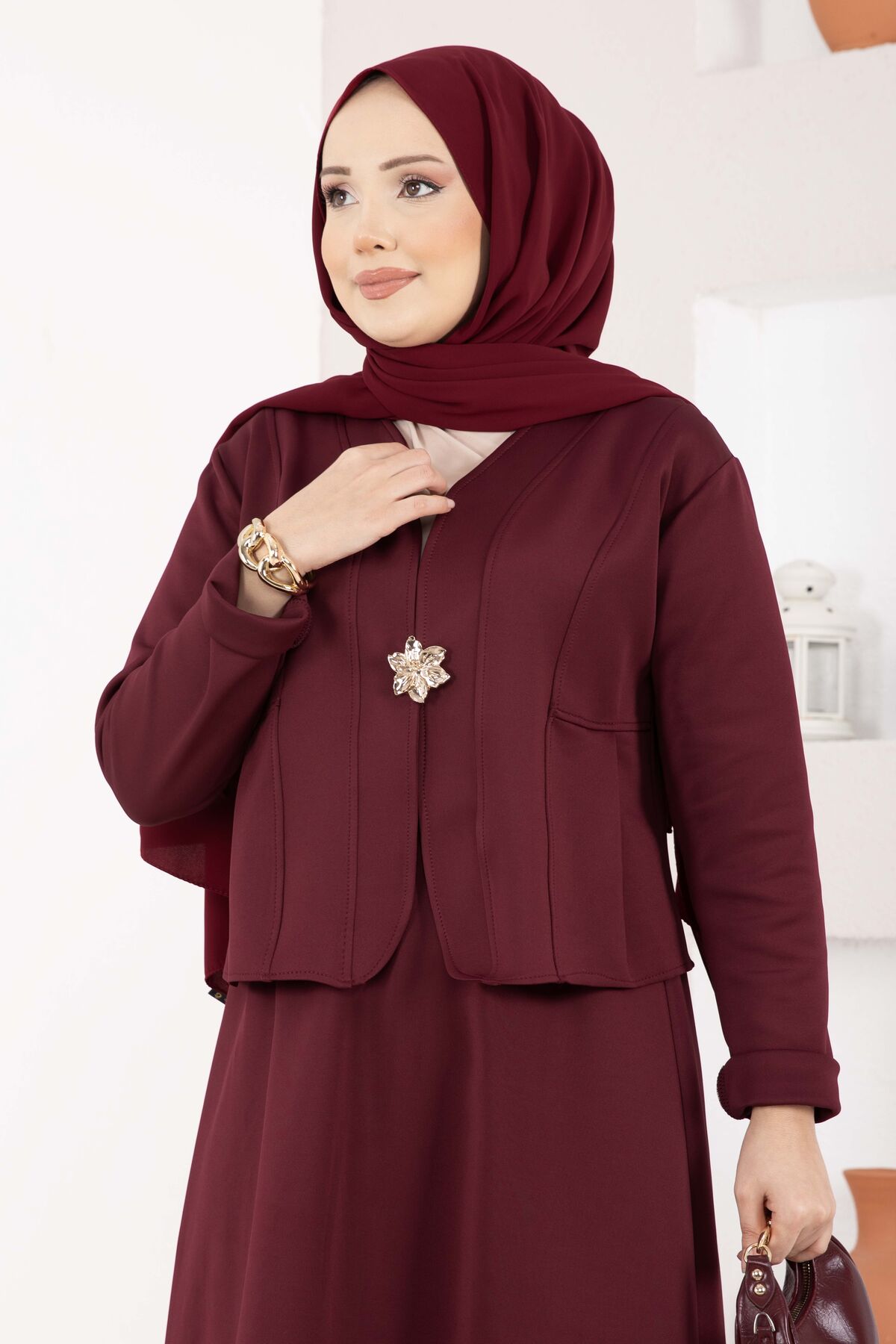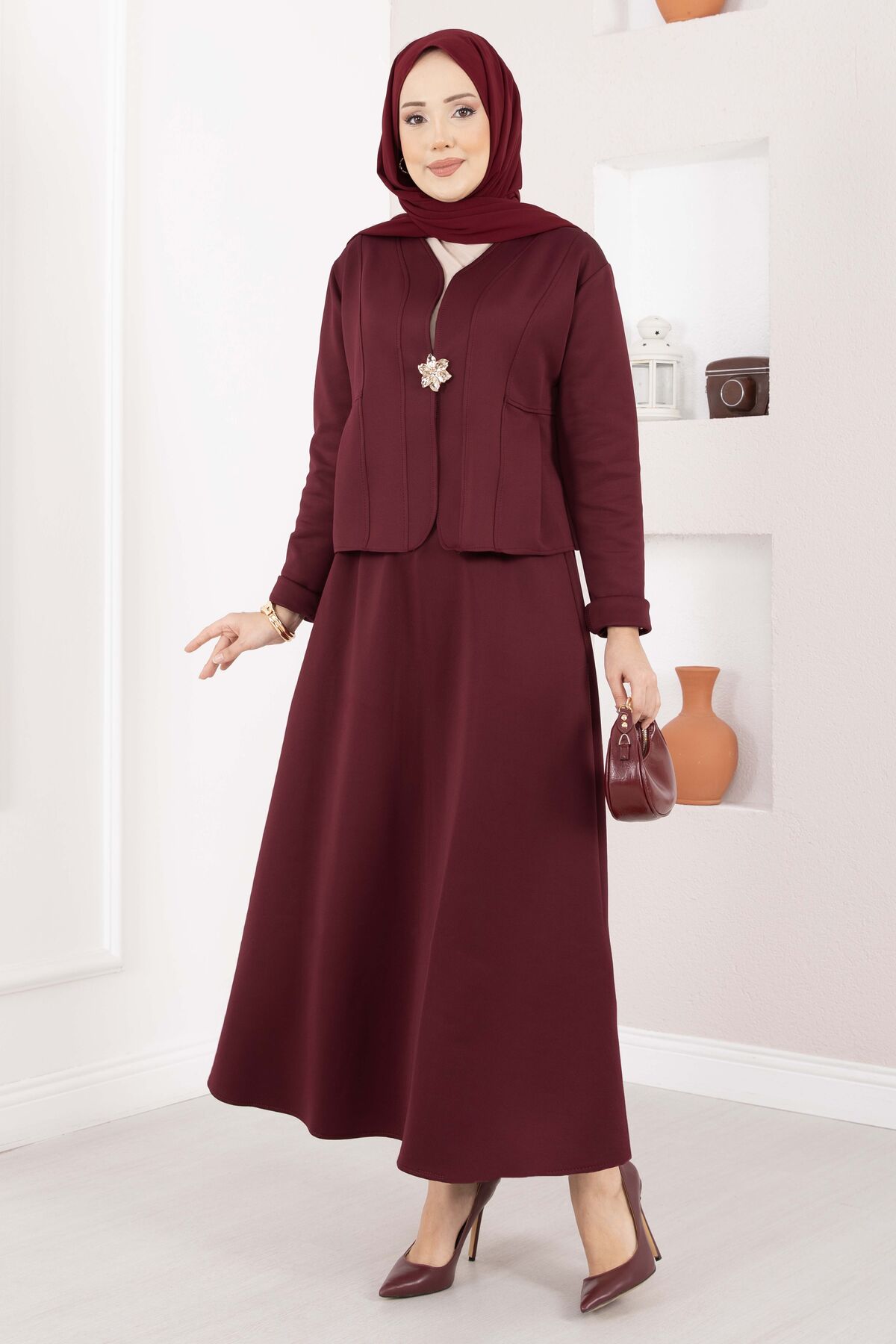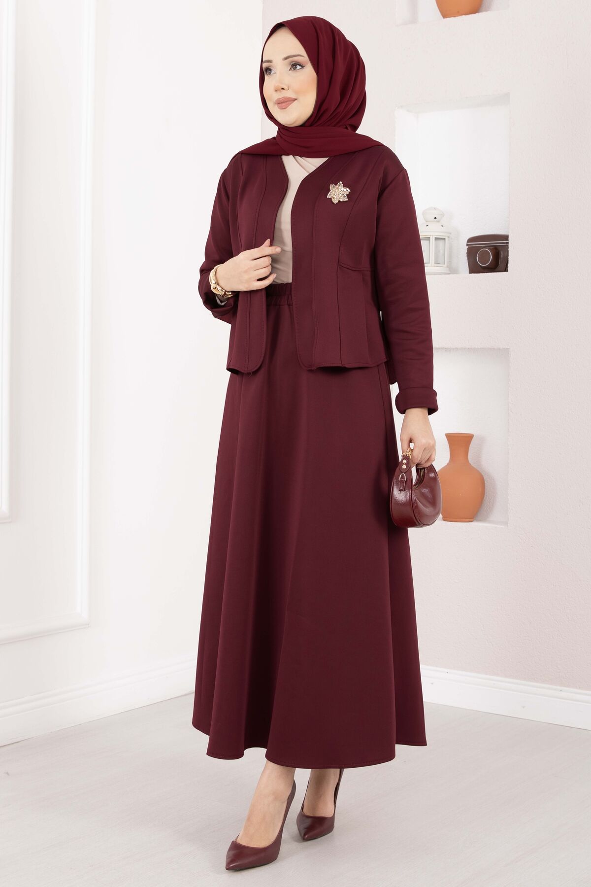 Gold Broşlu Ceket Etek İkili Takım Bordo