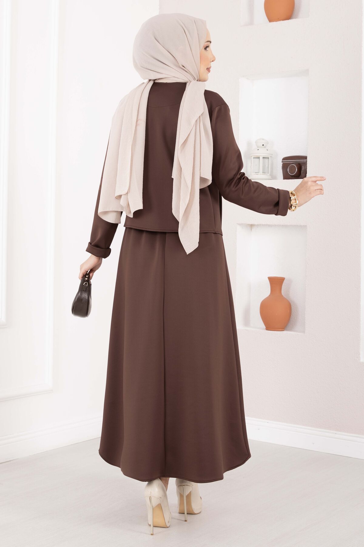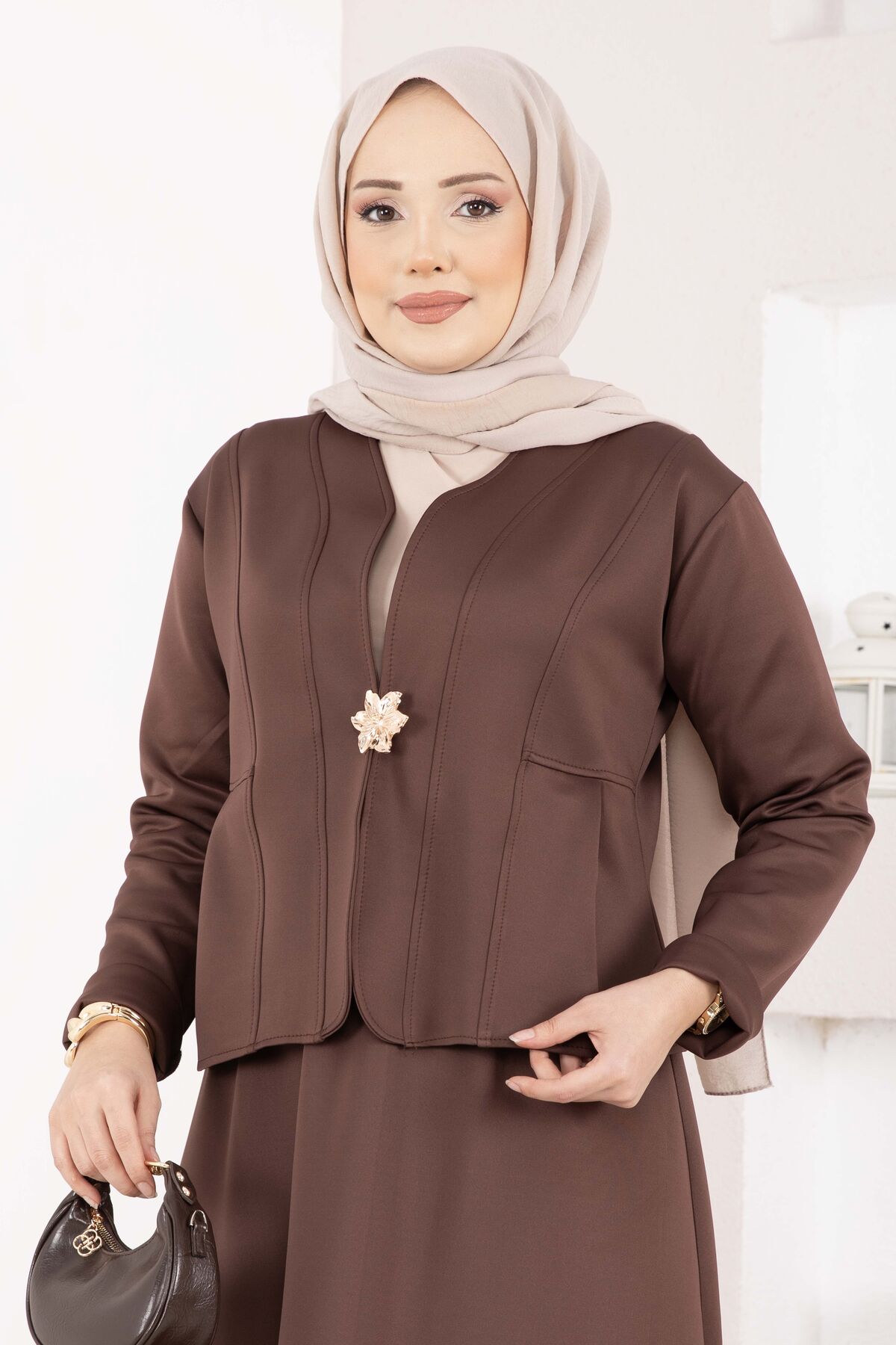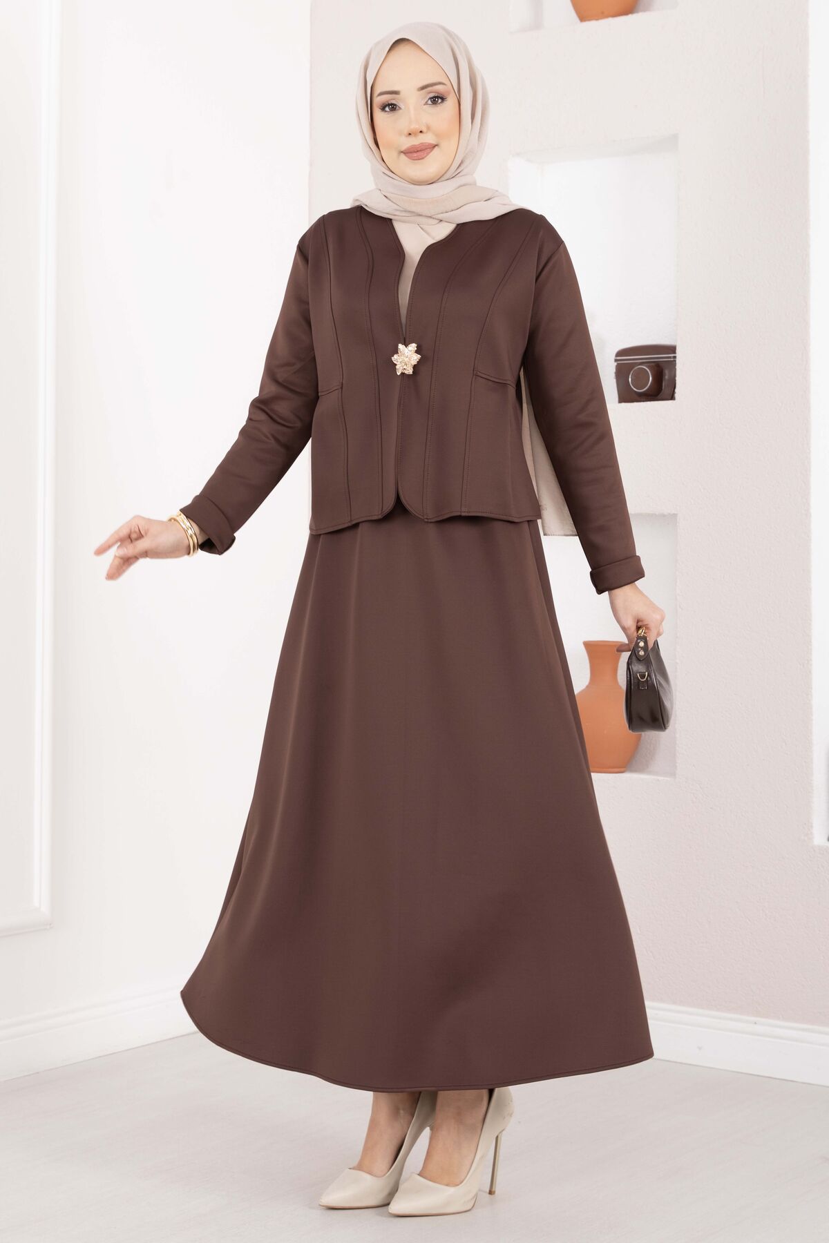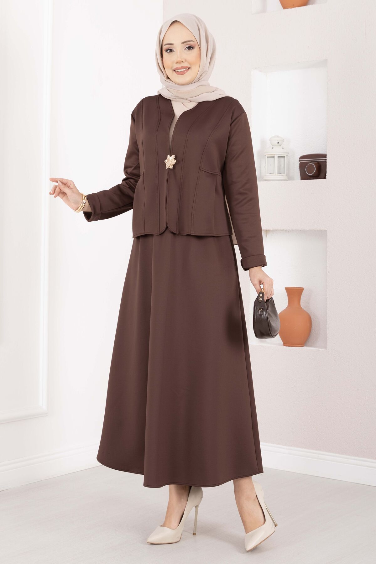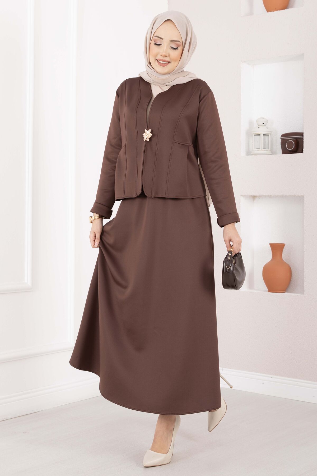 Gold Broşlu Ceket Etek İkili Takım Kahve
