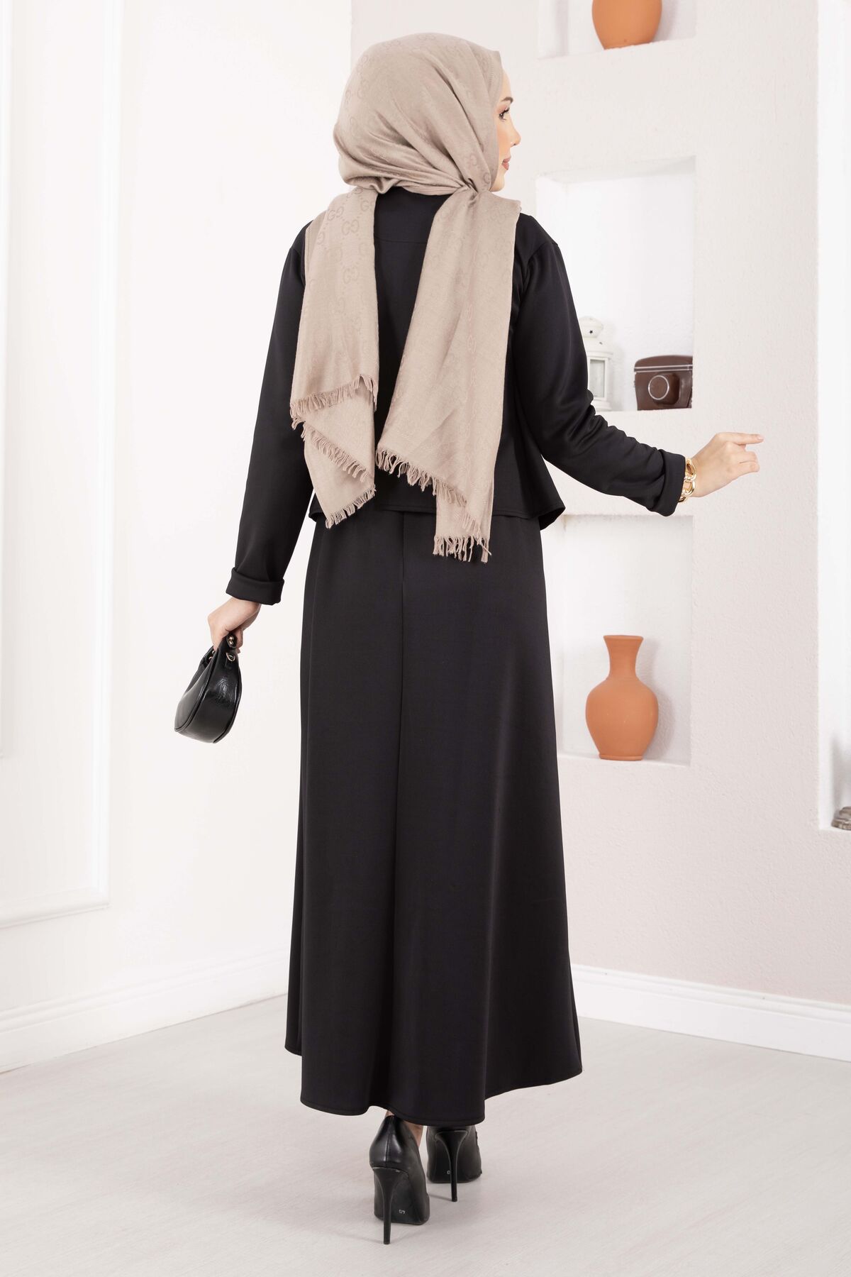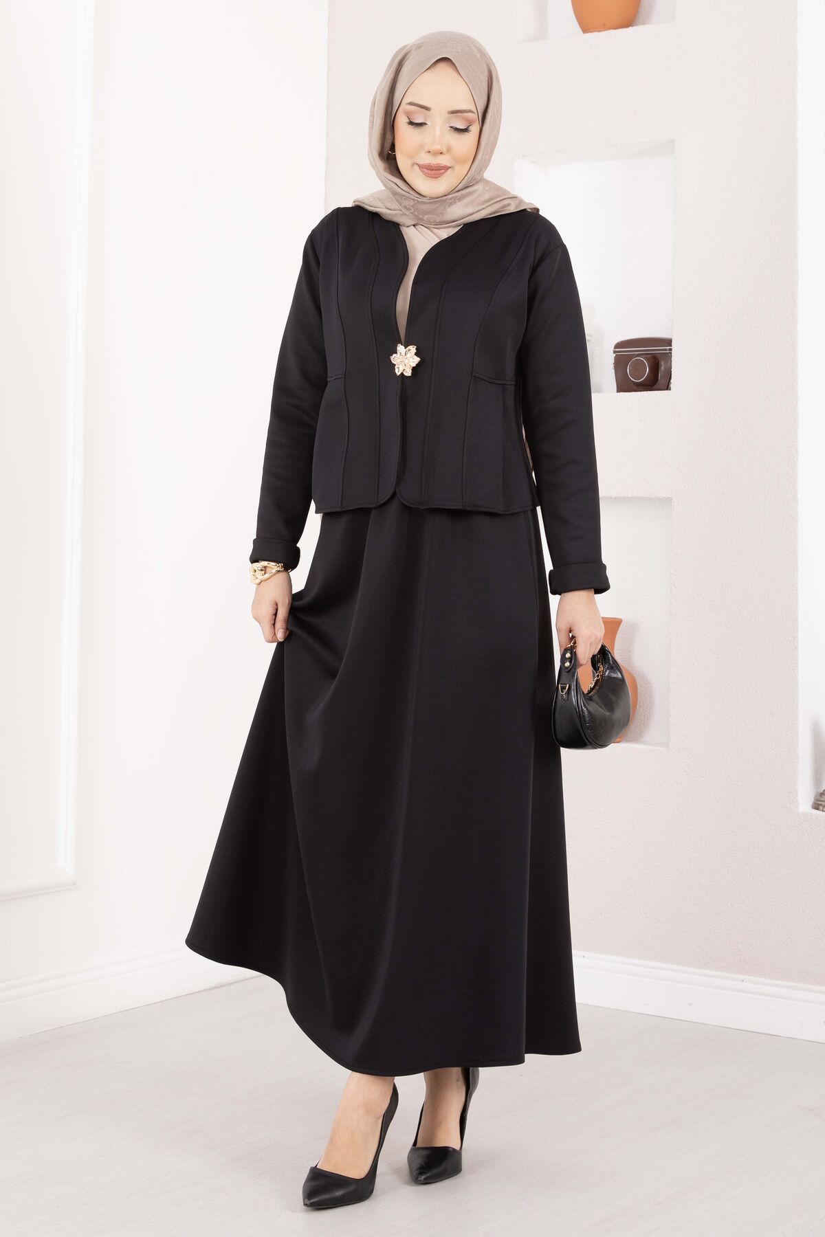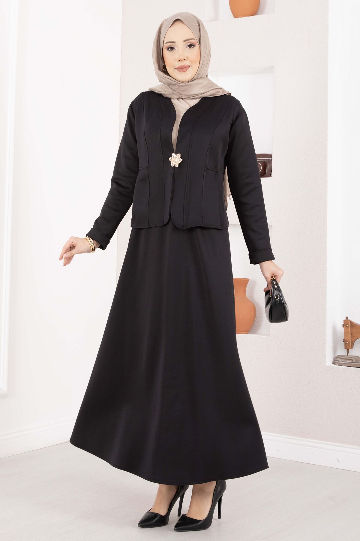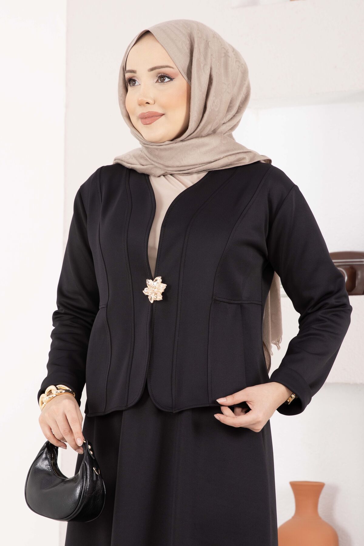 Gold Broşlu Ceket Etek İkili Takım Siyah