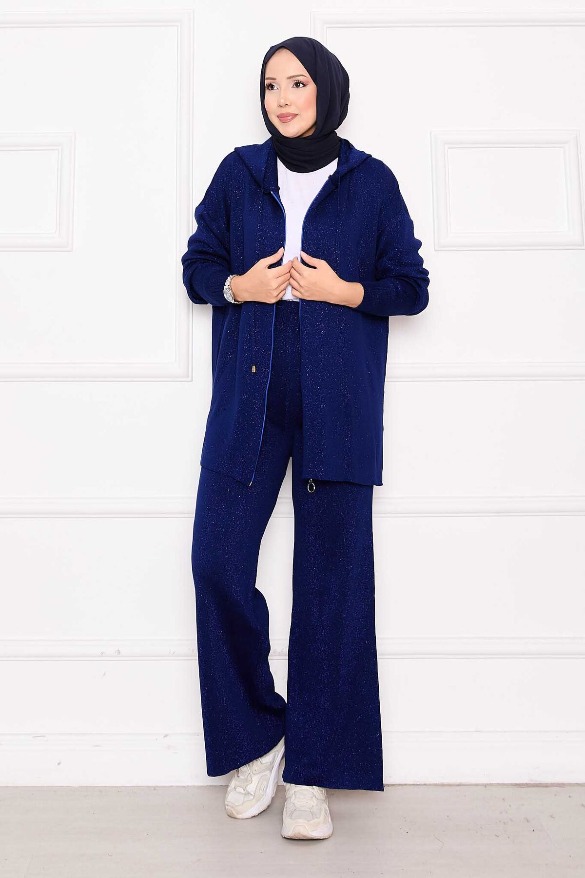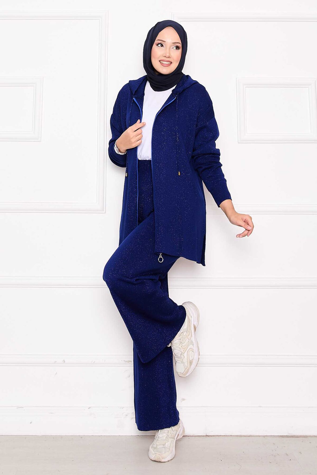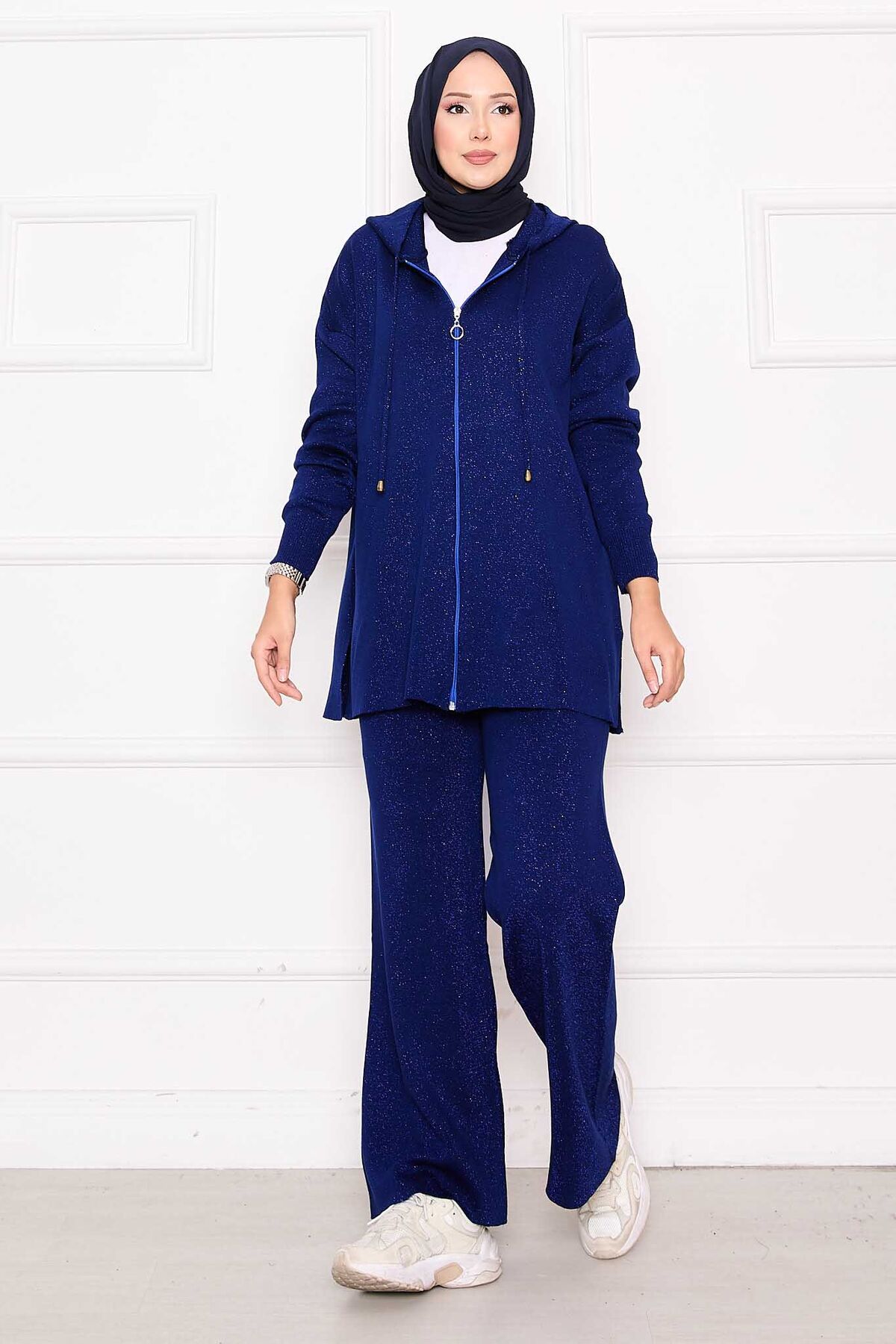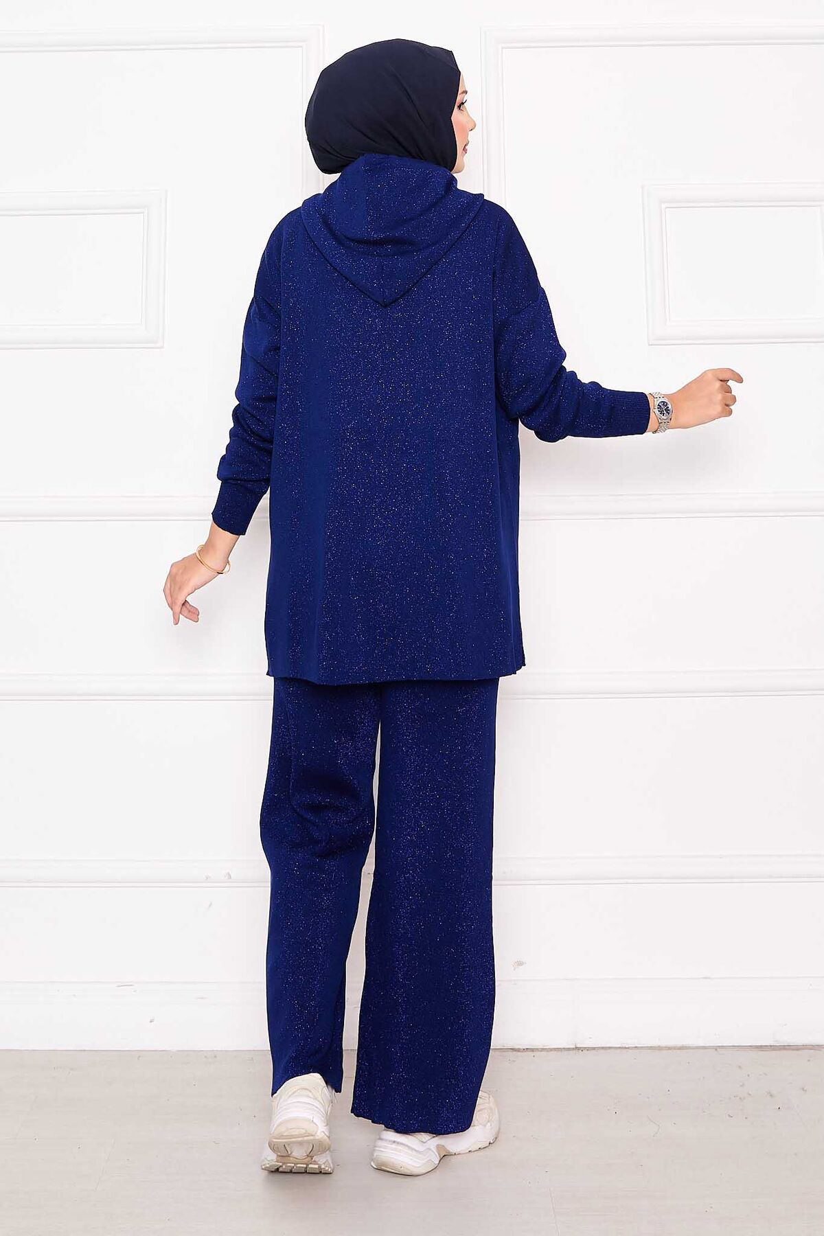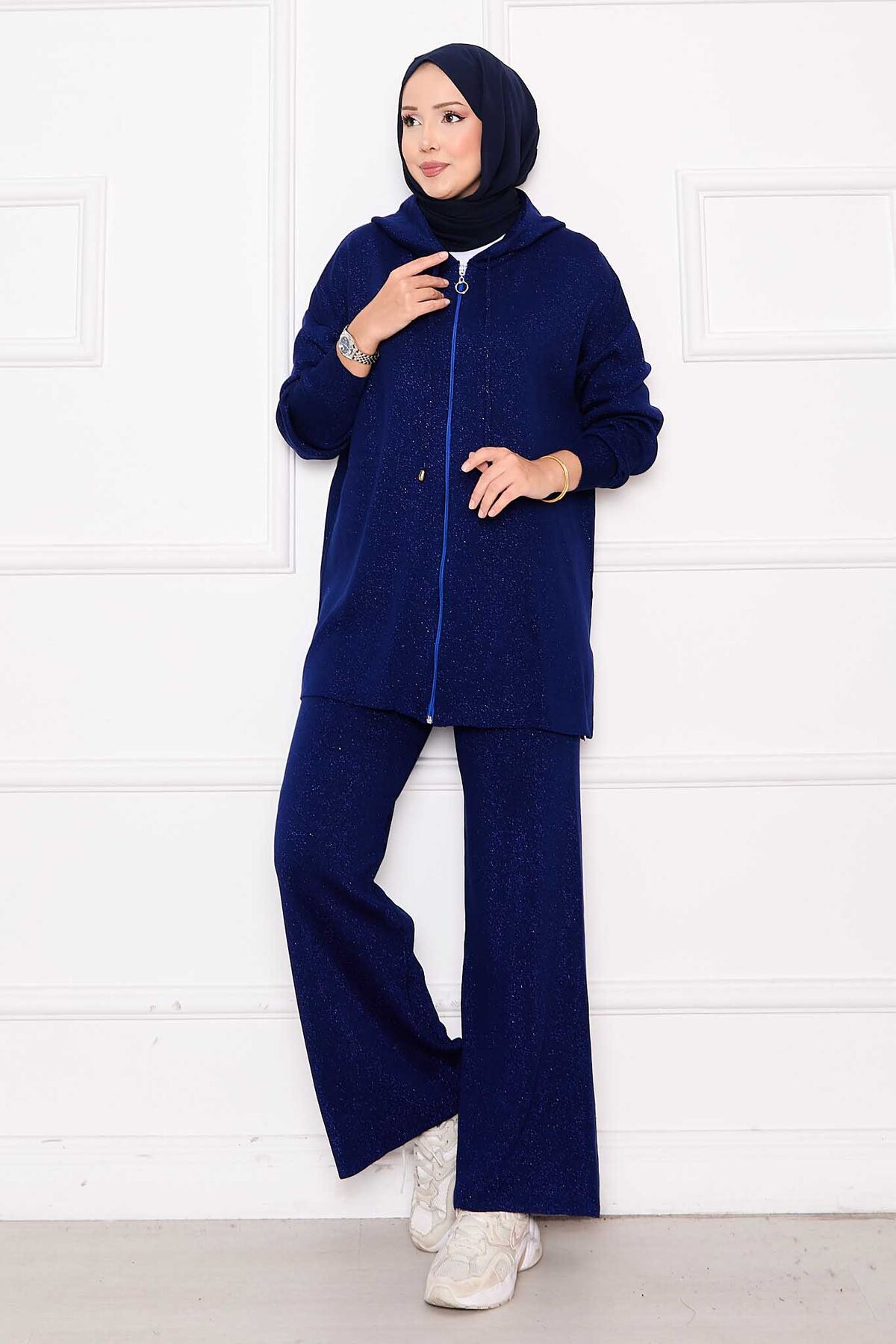 Gold Işıltılı Fermuarlı Kapüşonlu Triko İkili Takım Lacivert