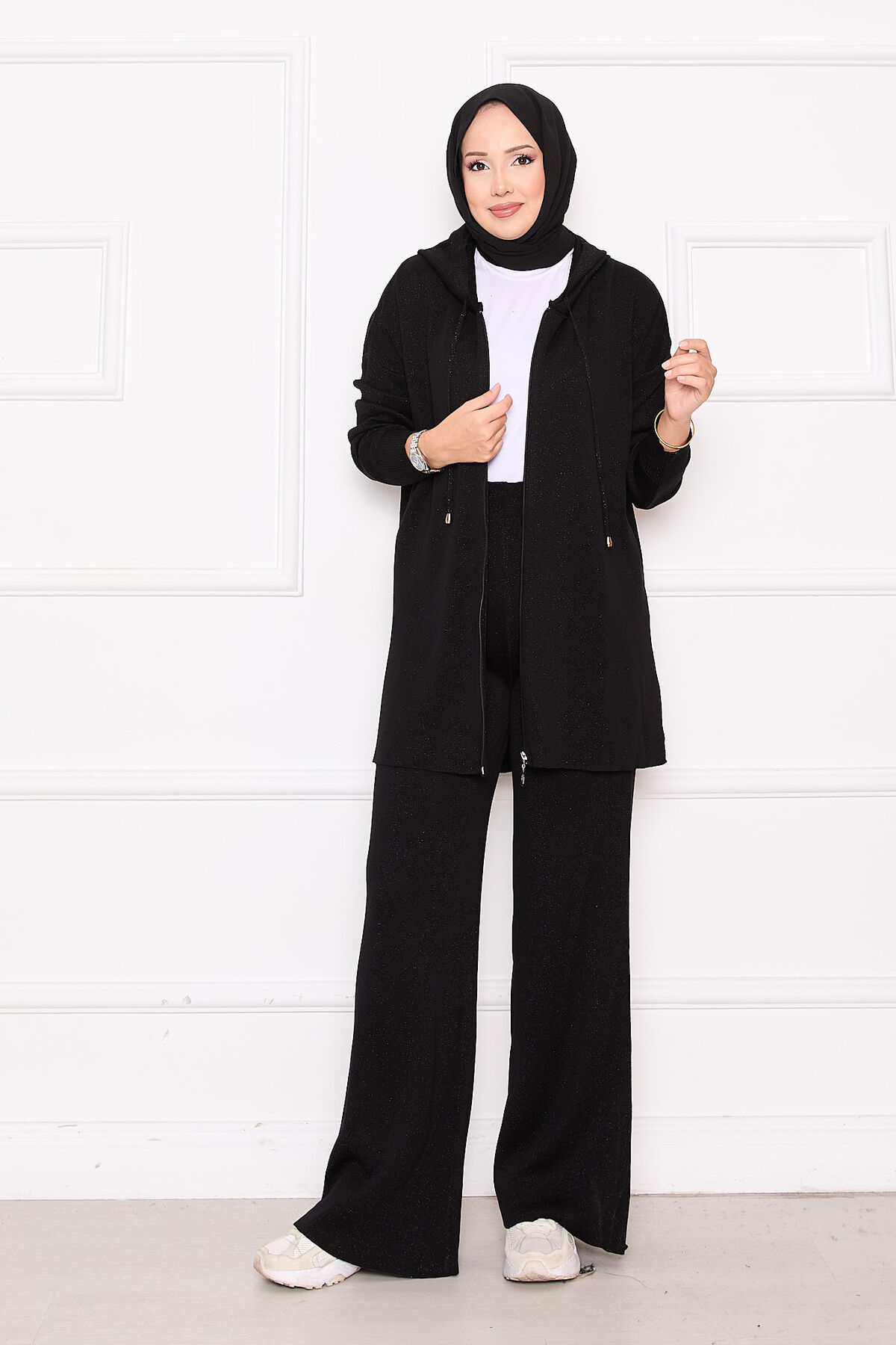 Gold Işıltılı Fermuarlı Kapüşonlu Triko İkili Takım Siyah