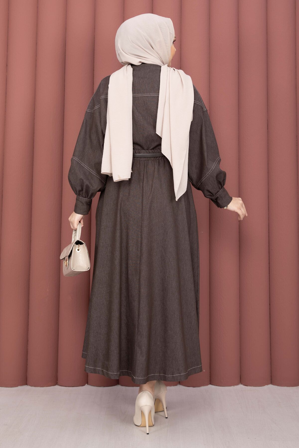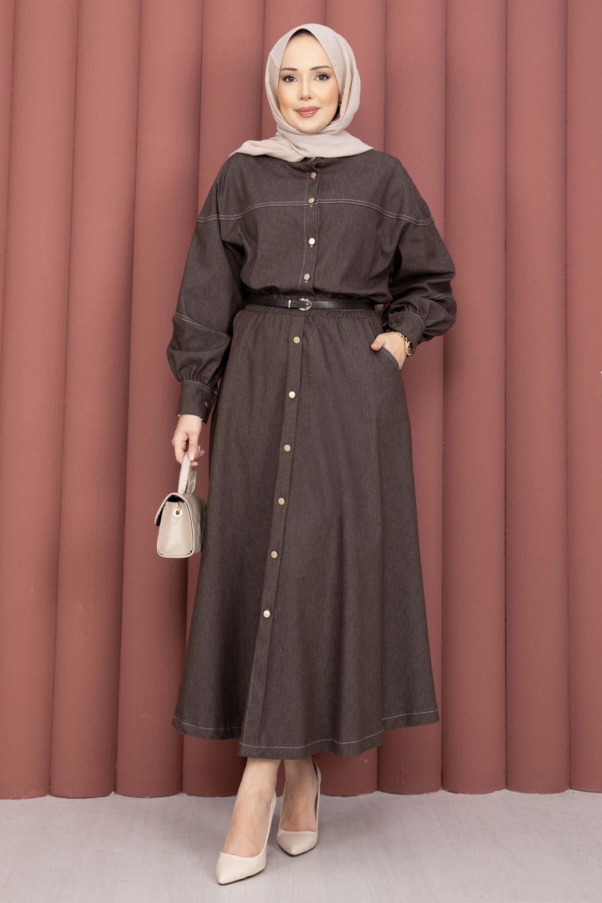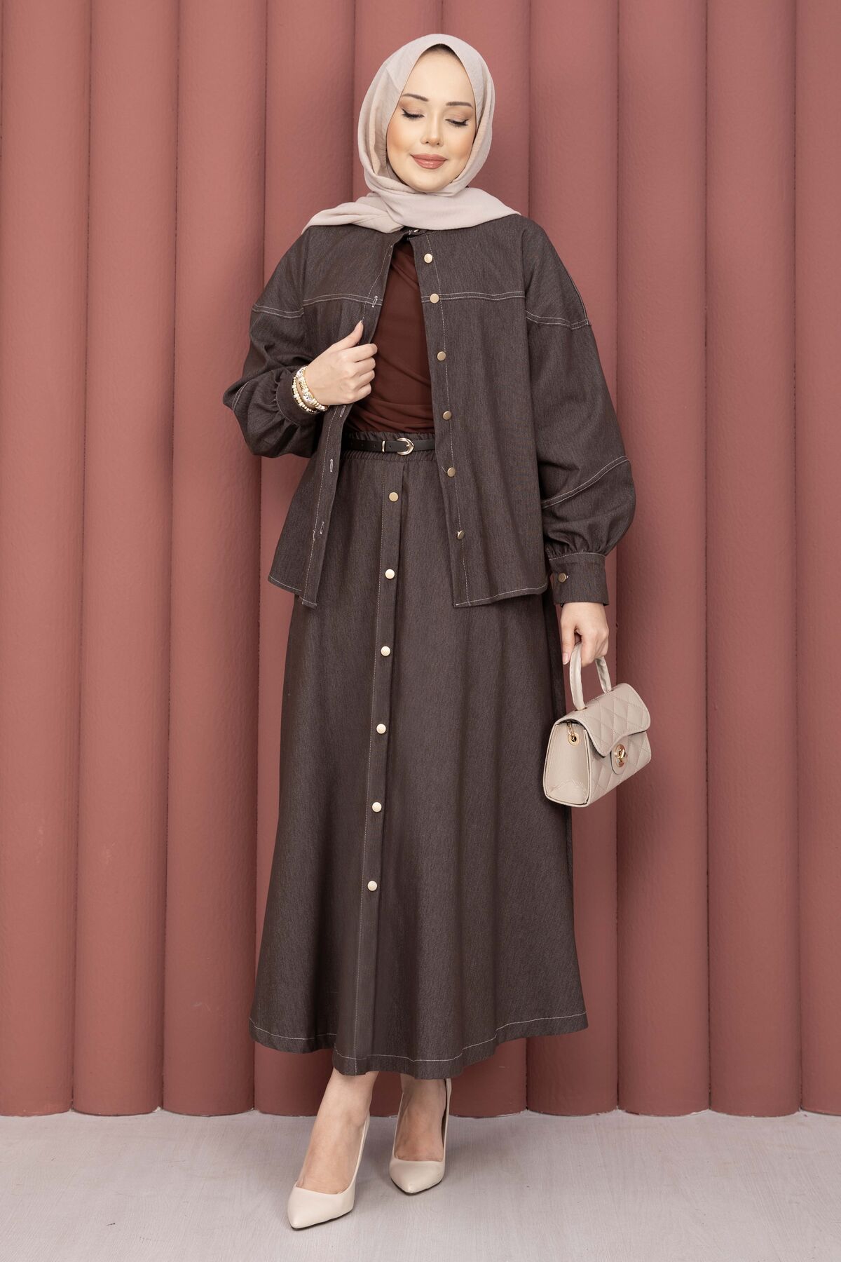 Gömlek & Etekli Tesettür Tensel Takım Kahve
