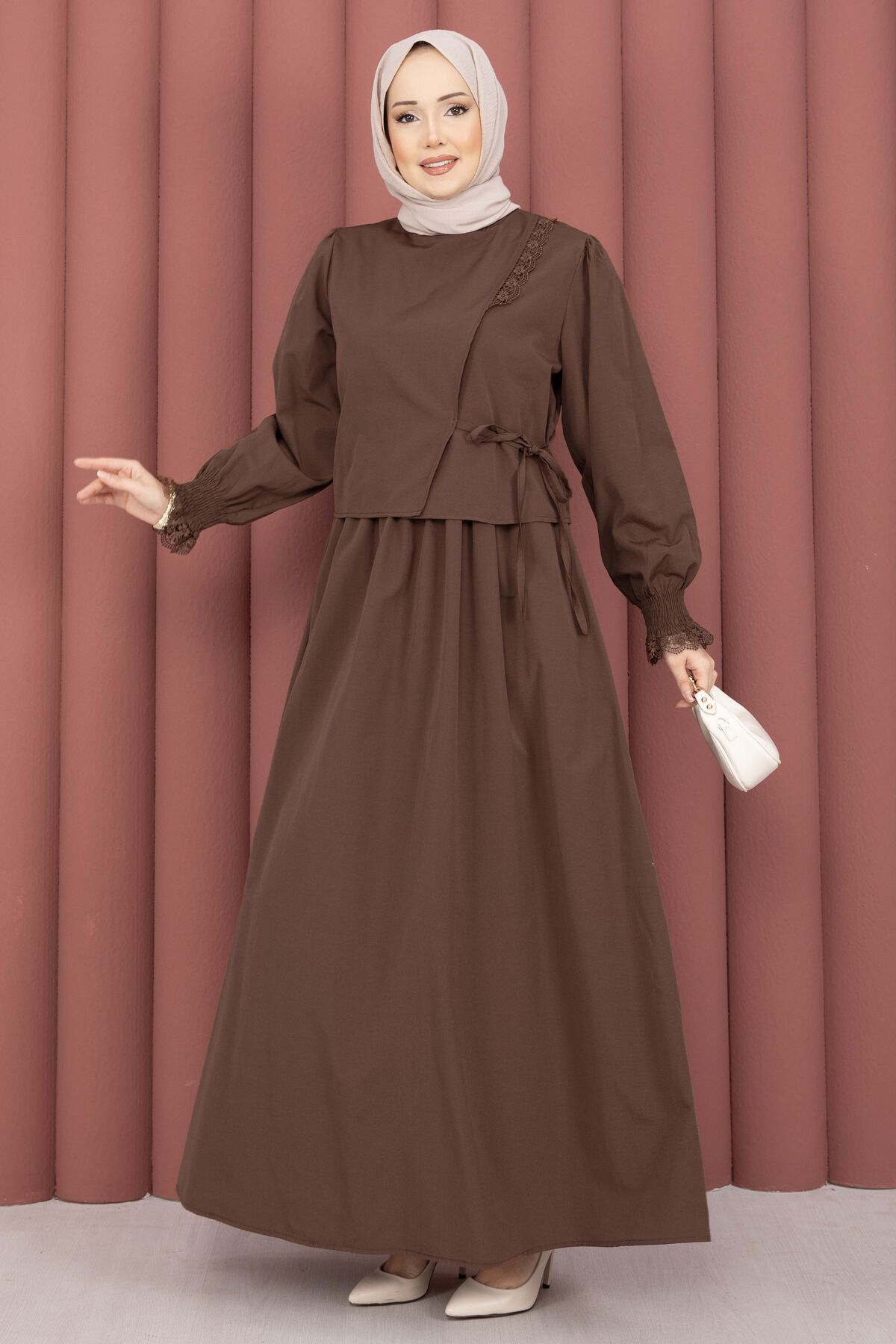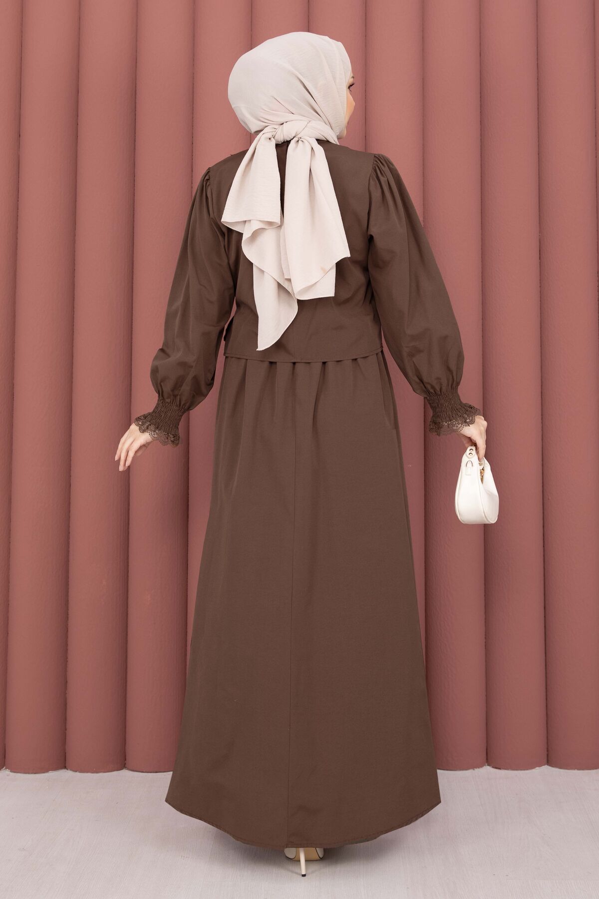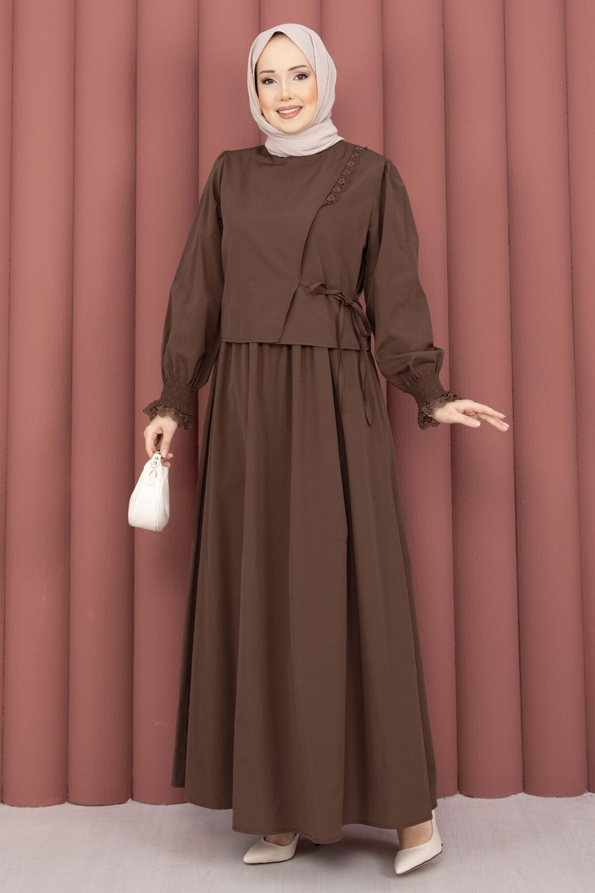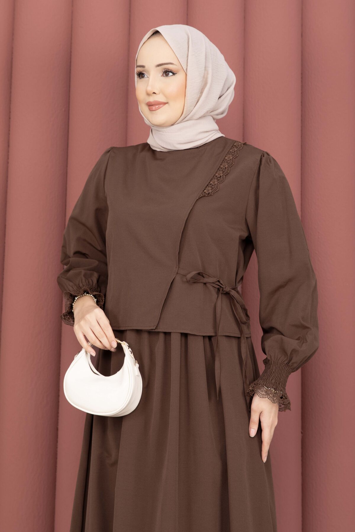 Güpür Şeritli Elbiseli İkili Takım Kahve