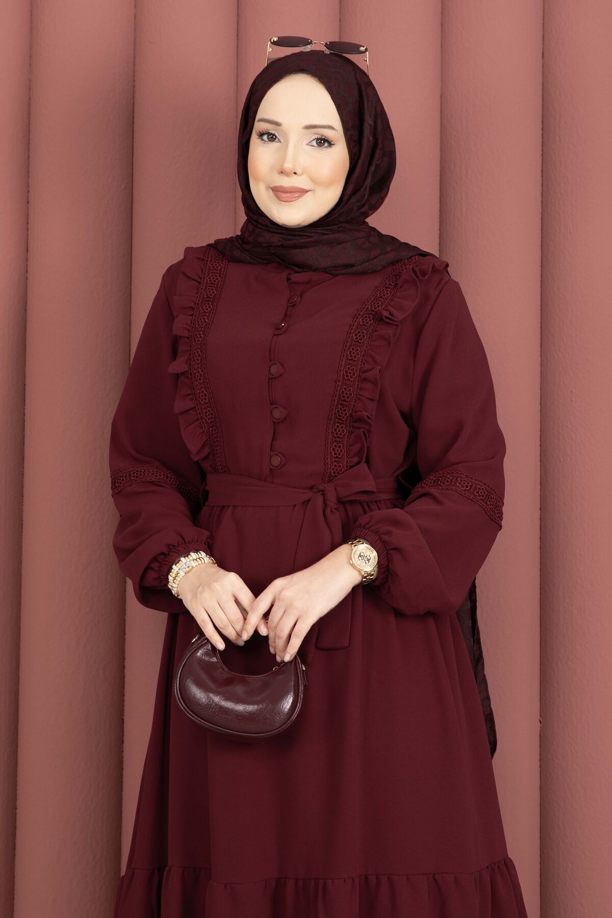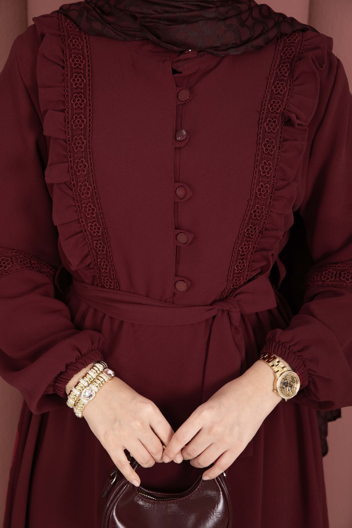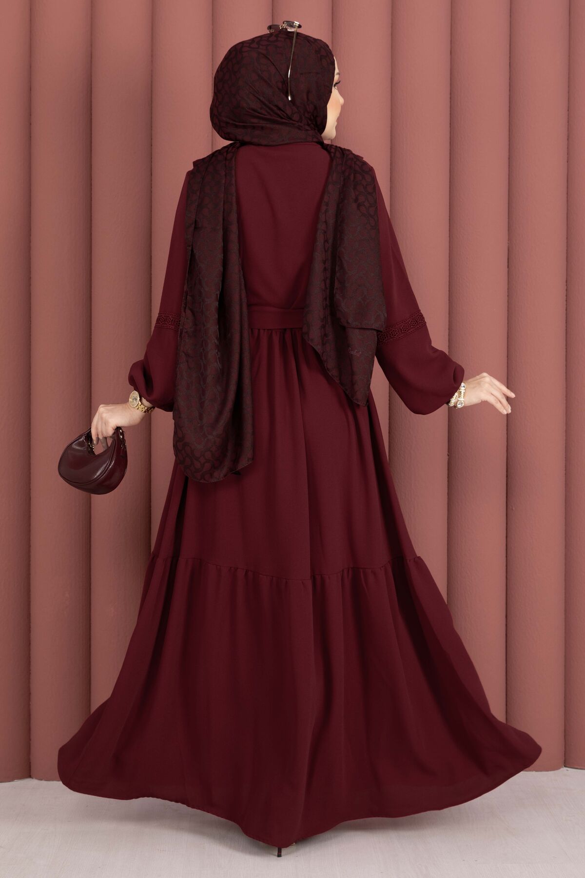Güpür Şeritli Kuşaklı Tesettür Elbise Bordo