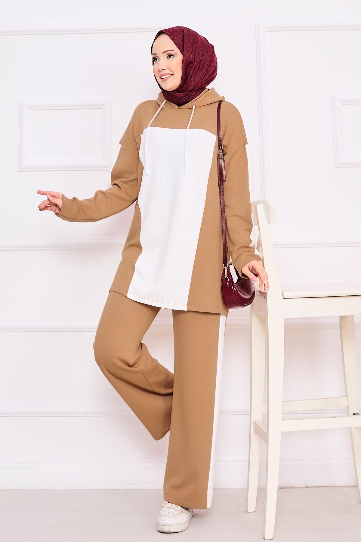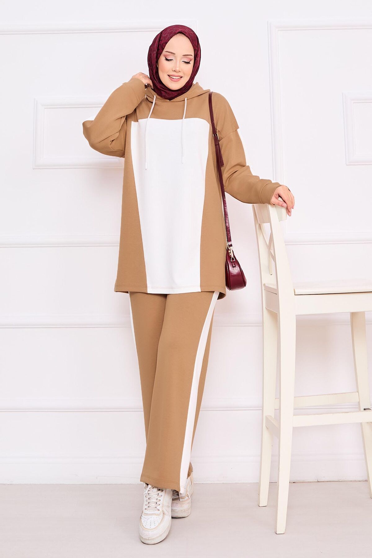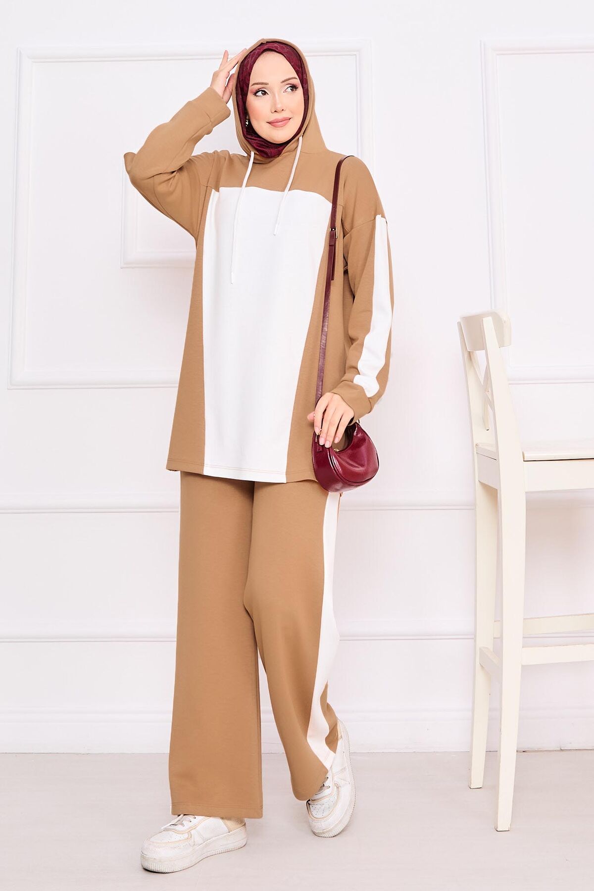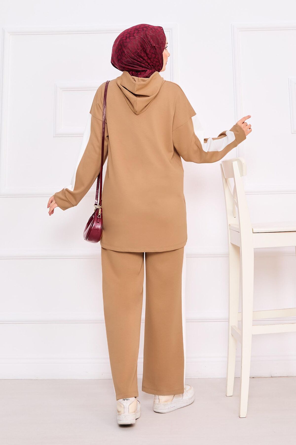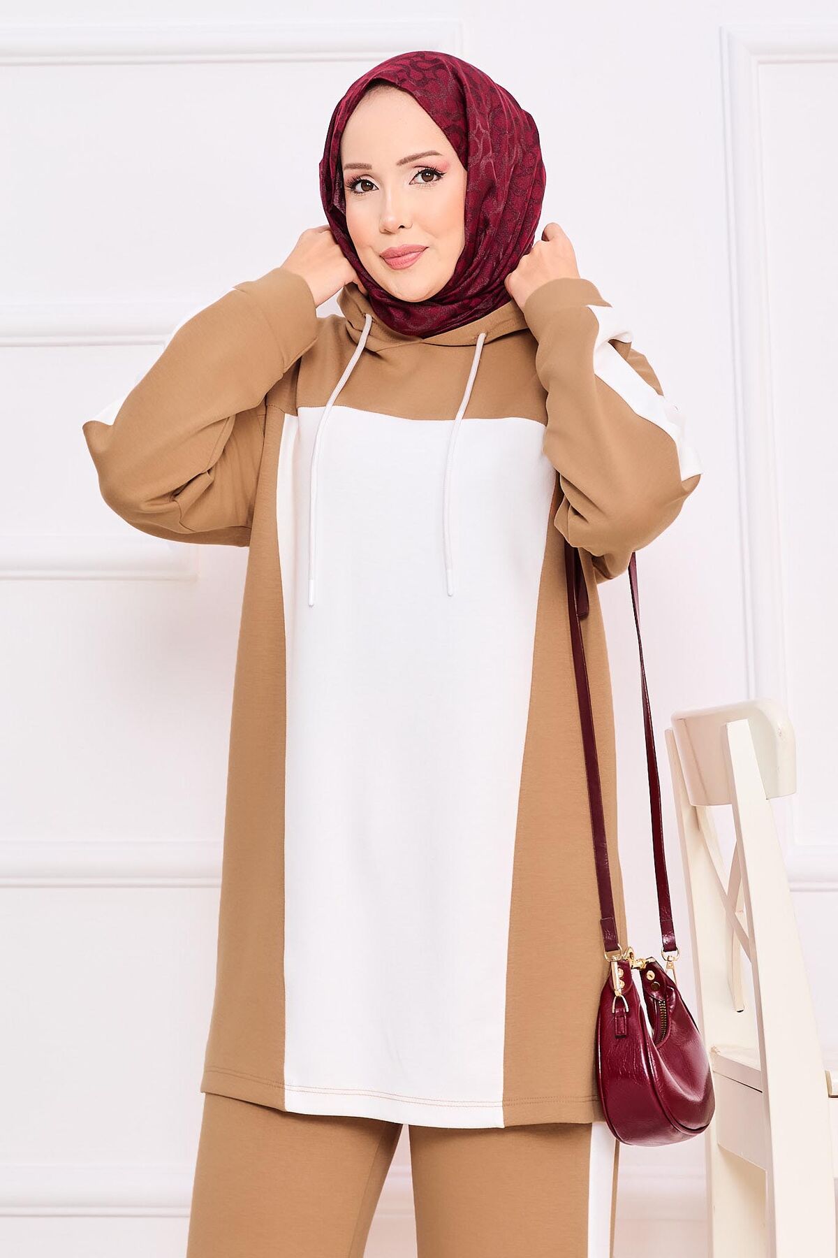 İki Renkli Kapüşonlu Tesettür İkili Takım Camel