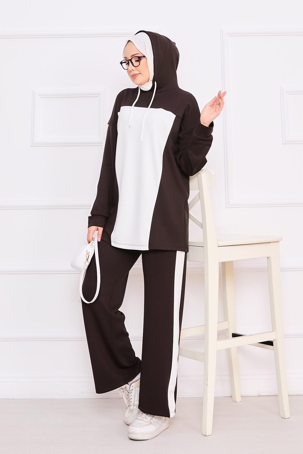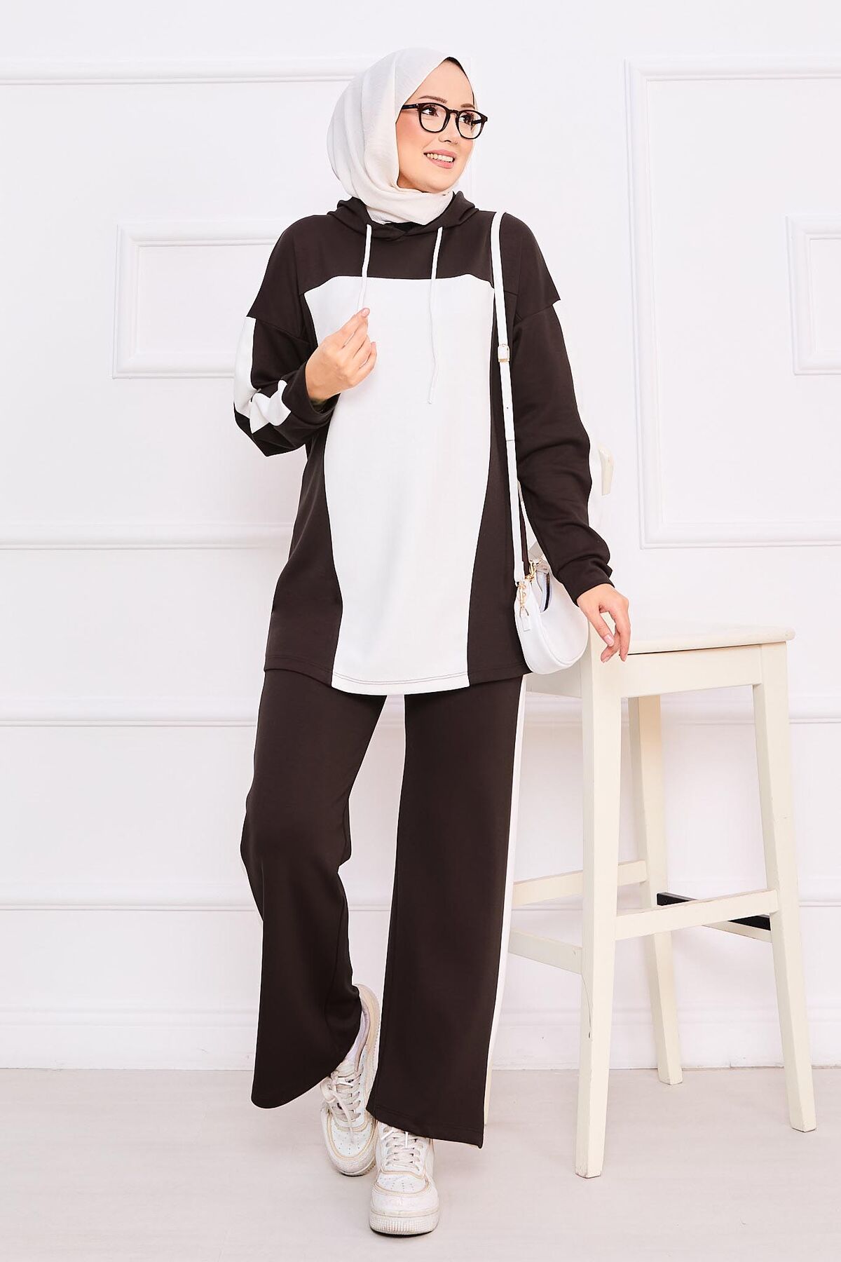 İki Renkli Kapüşonlu Tesettür İkili Takım Kahve