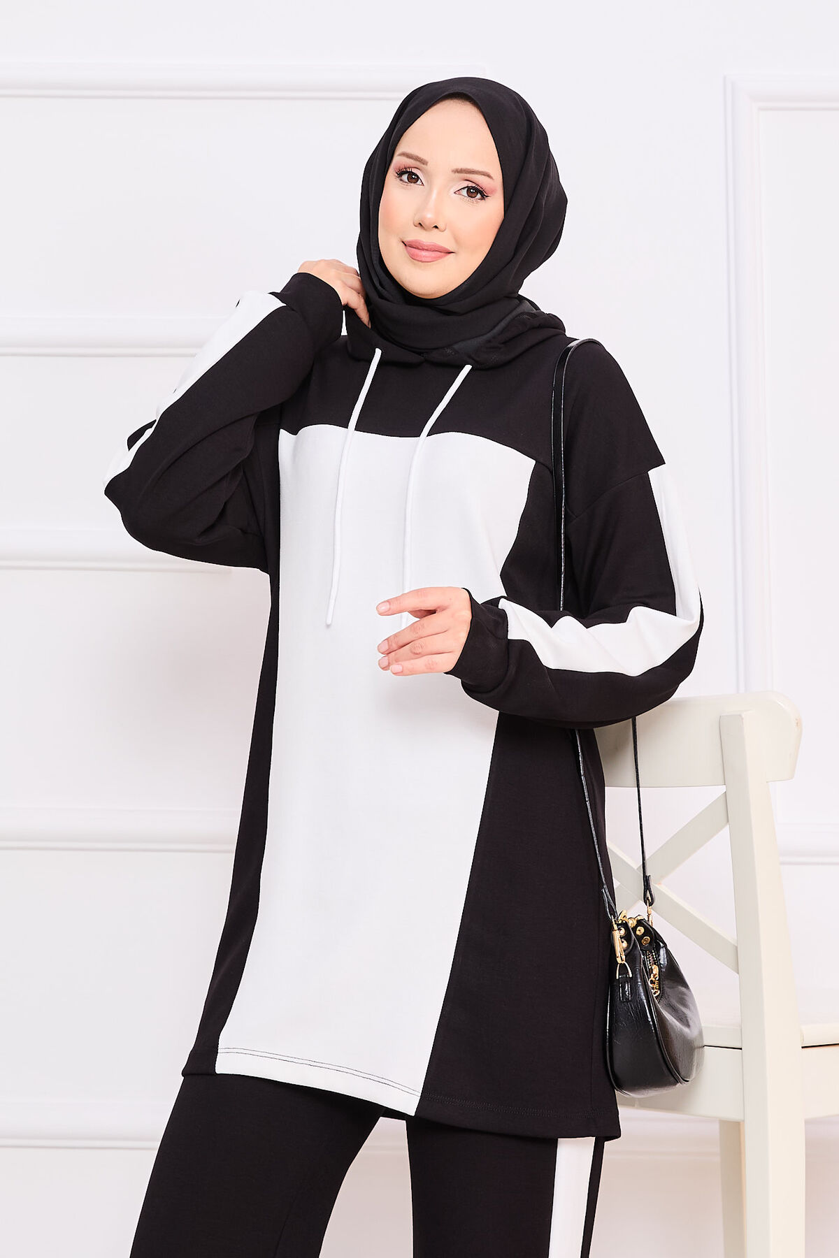İki Renkli Kapüşonlu Tesettür İkili Takım Siyah