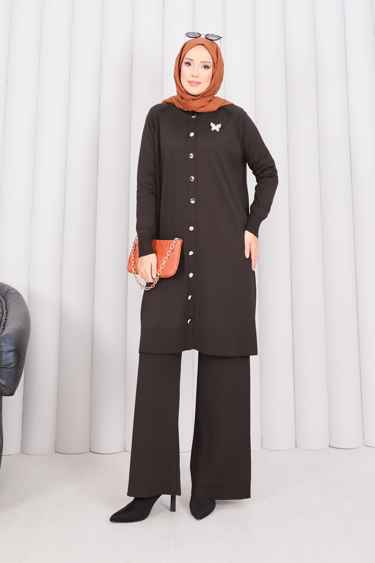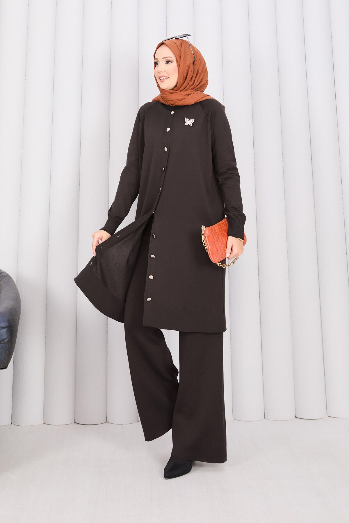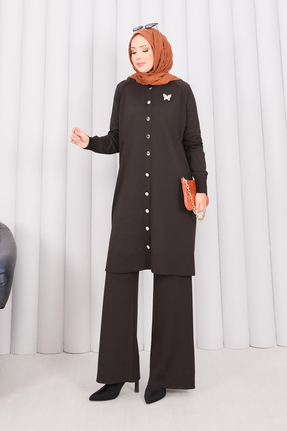 İnci Kelebek Broşlu Tesettür Triko Takım Kahve