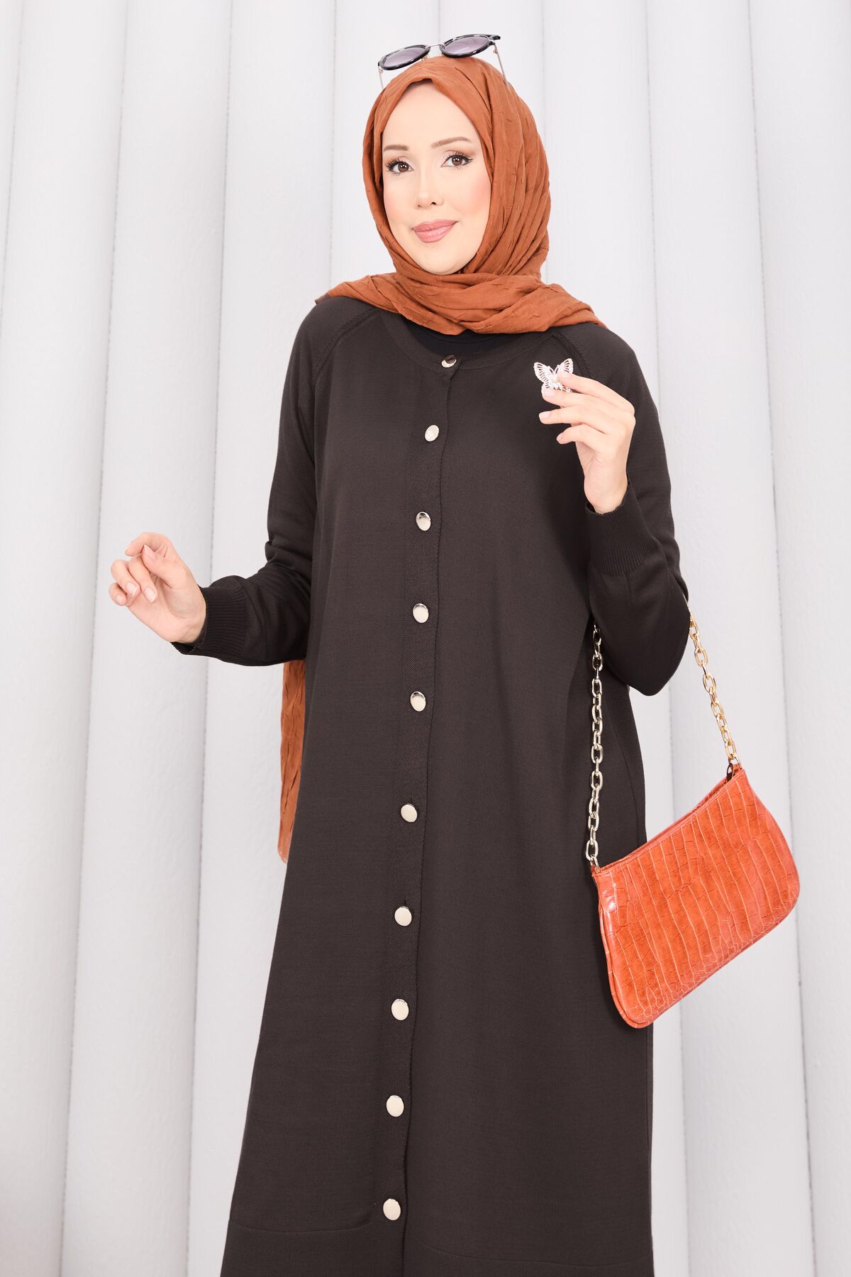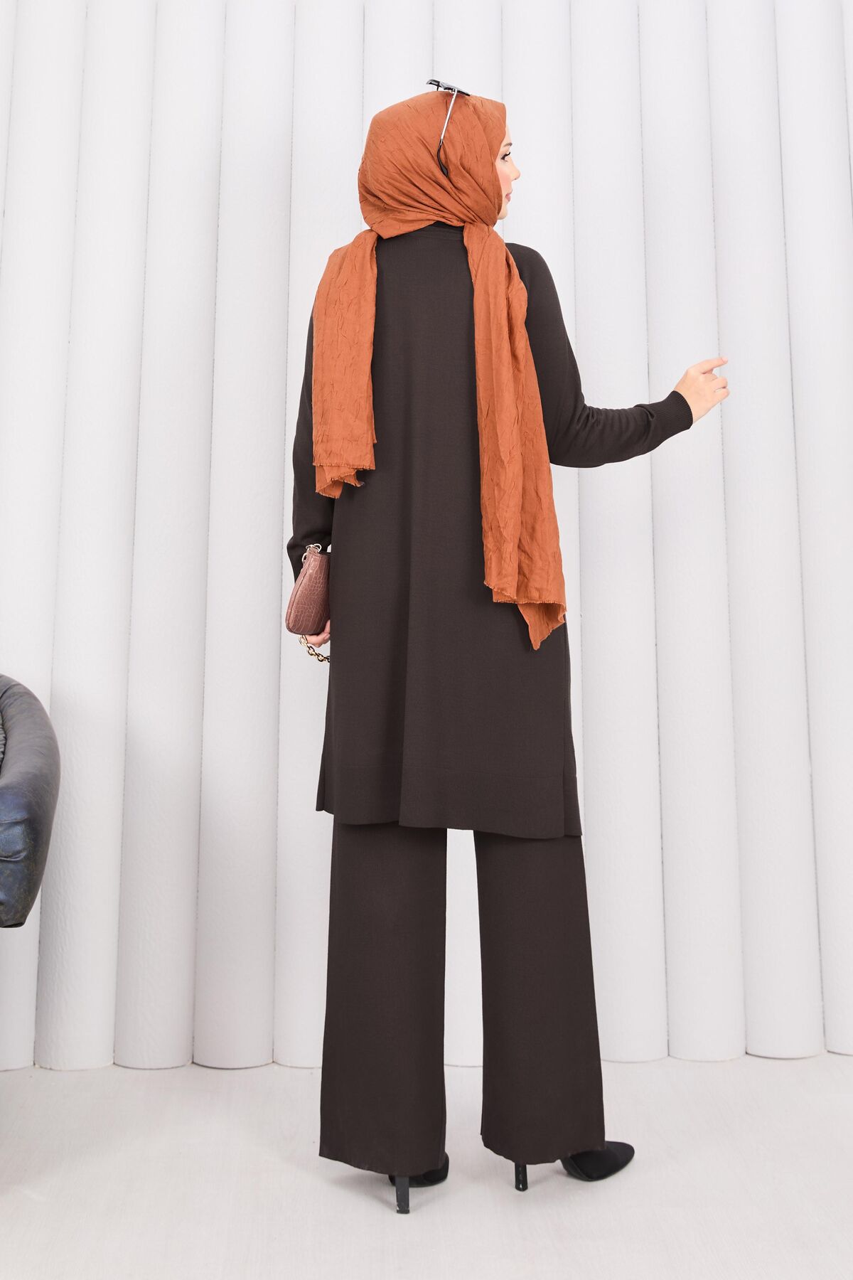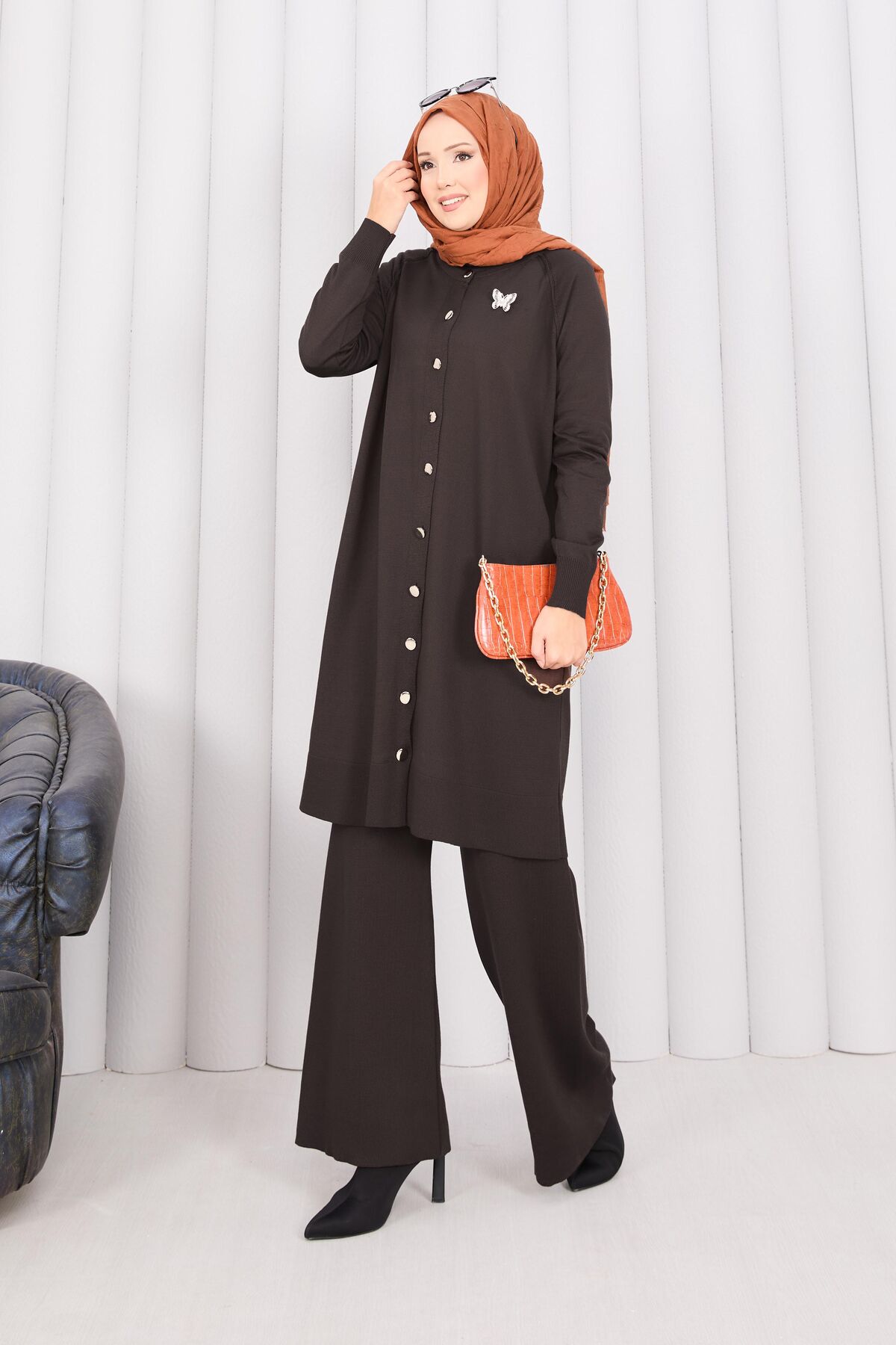 İnci Kelebek Broşlu Tesettür Triko Takım Kahve