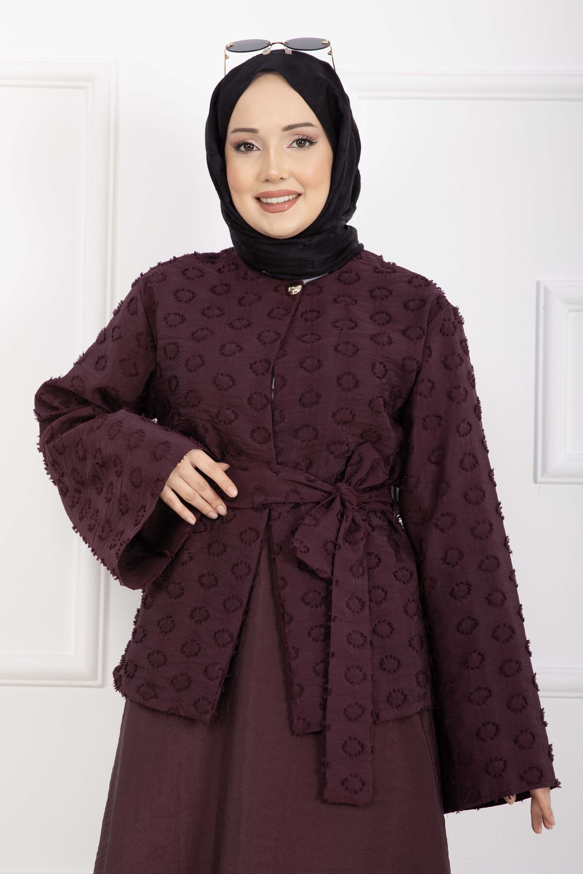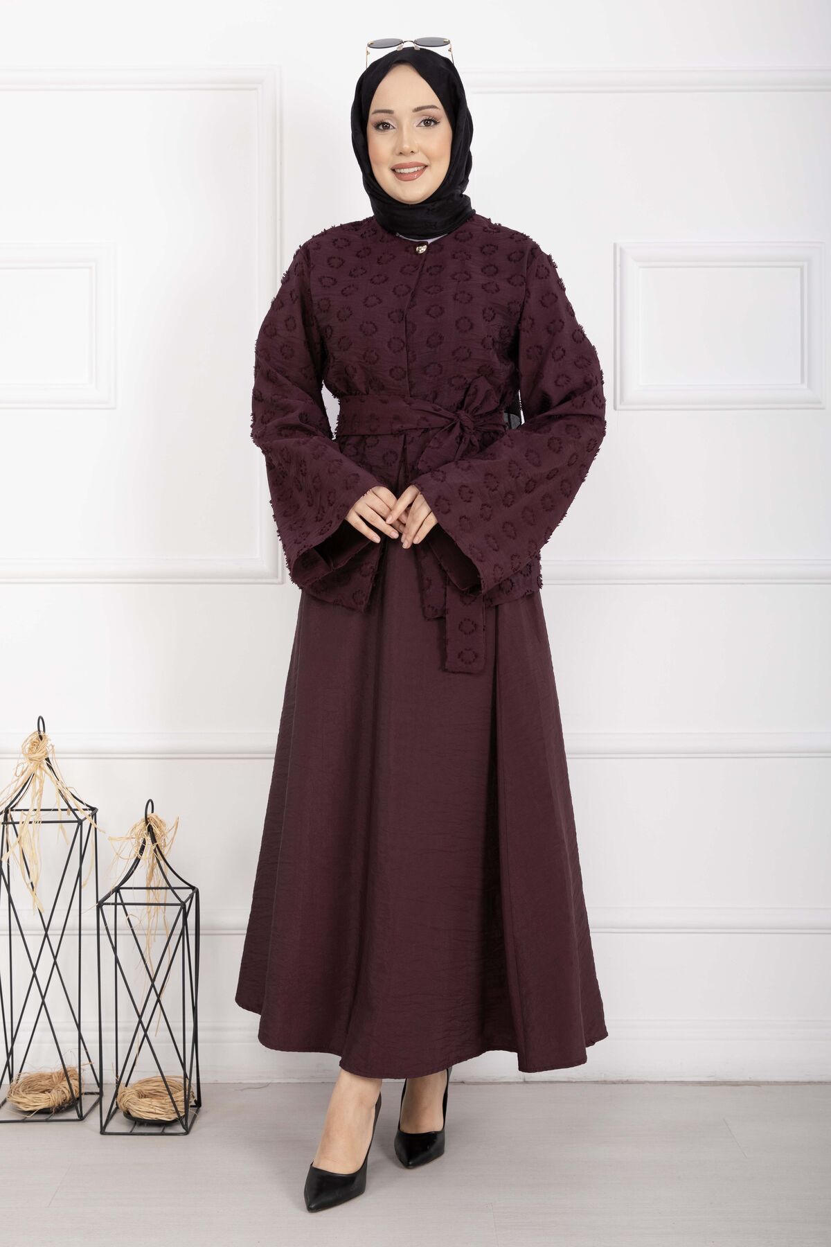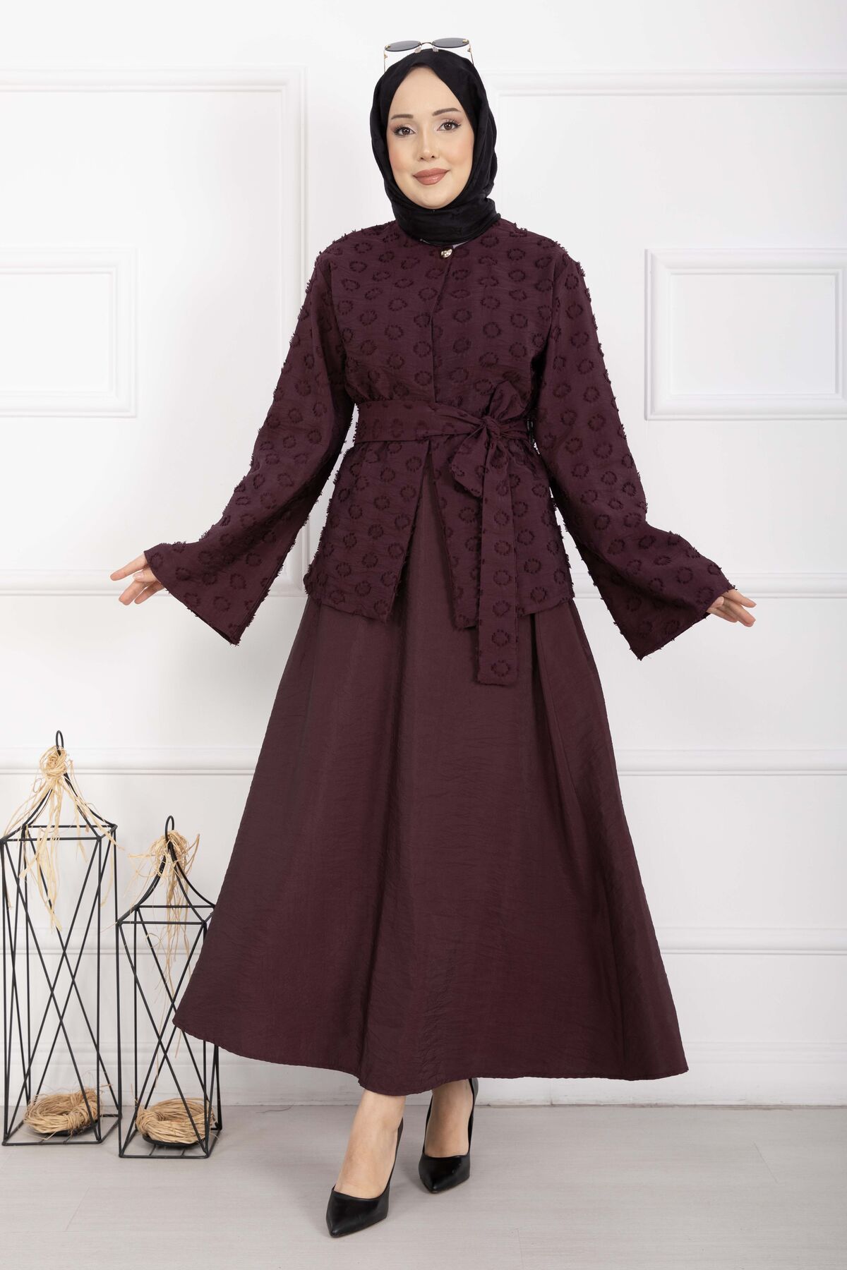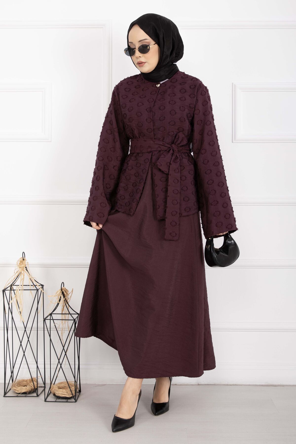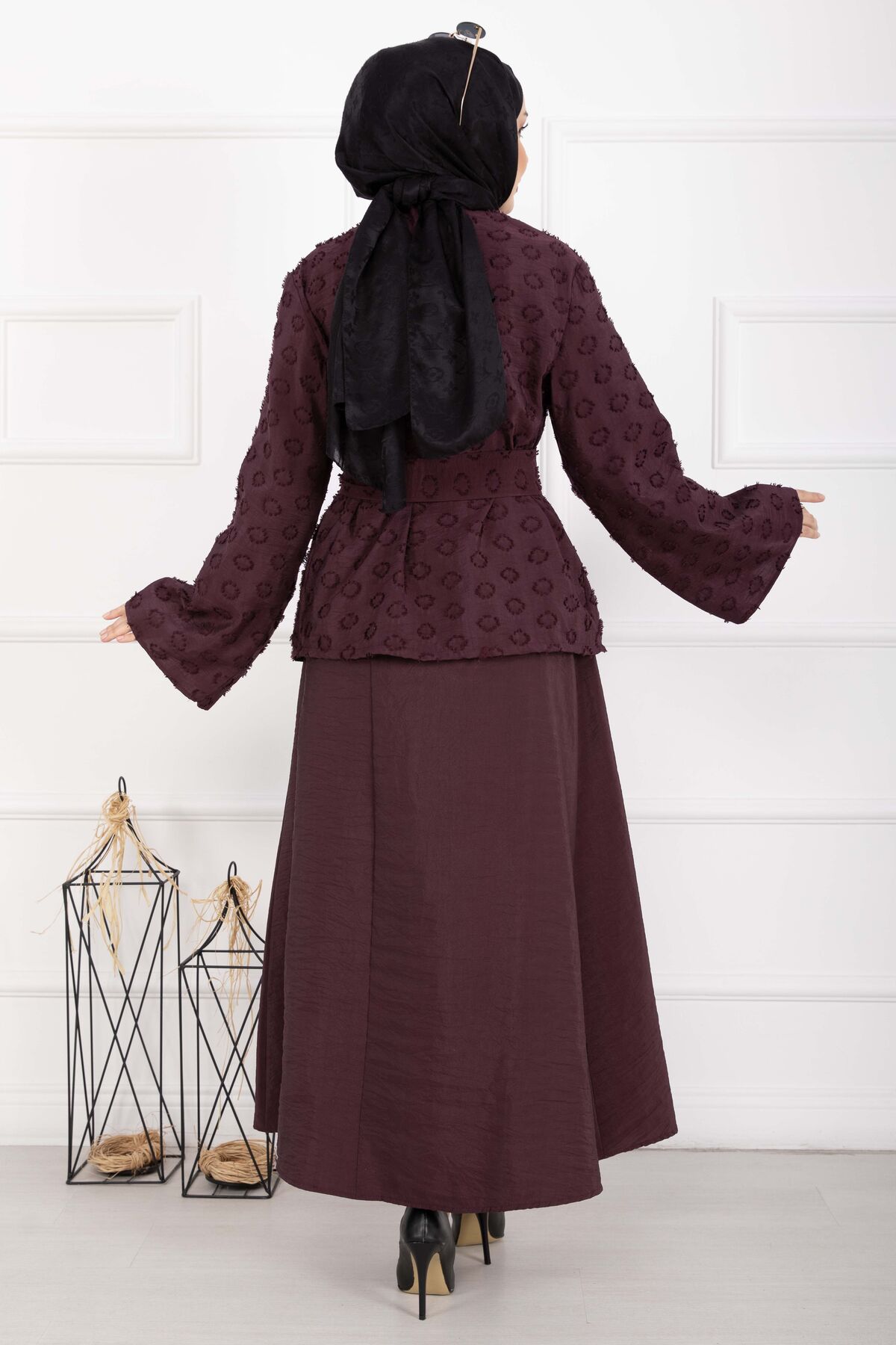 Kabartma Dokulu Kuşaklı Etek Takım Bordo