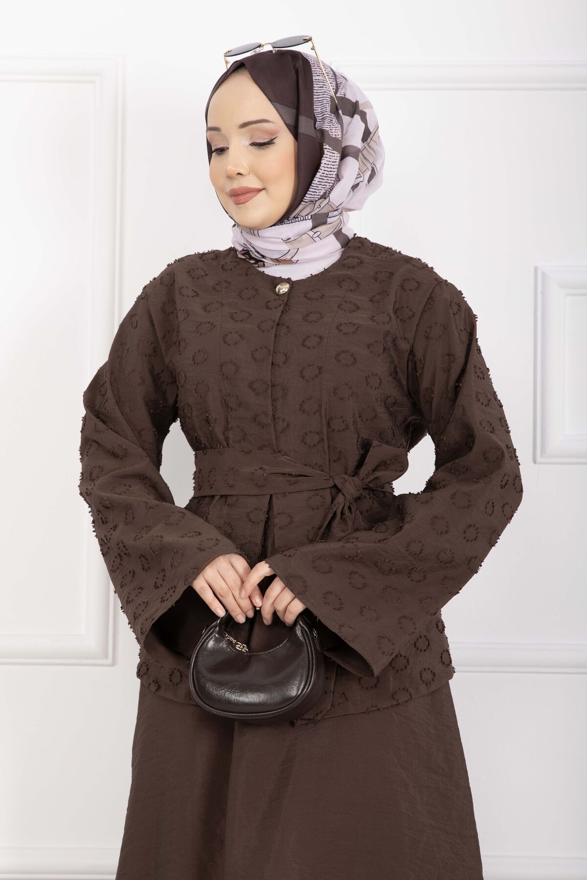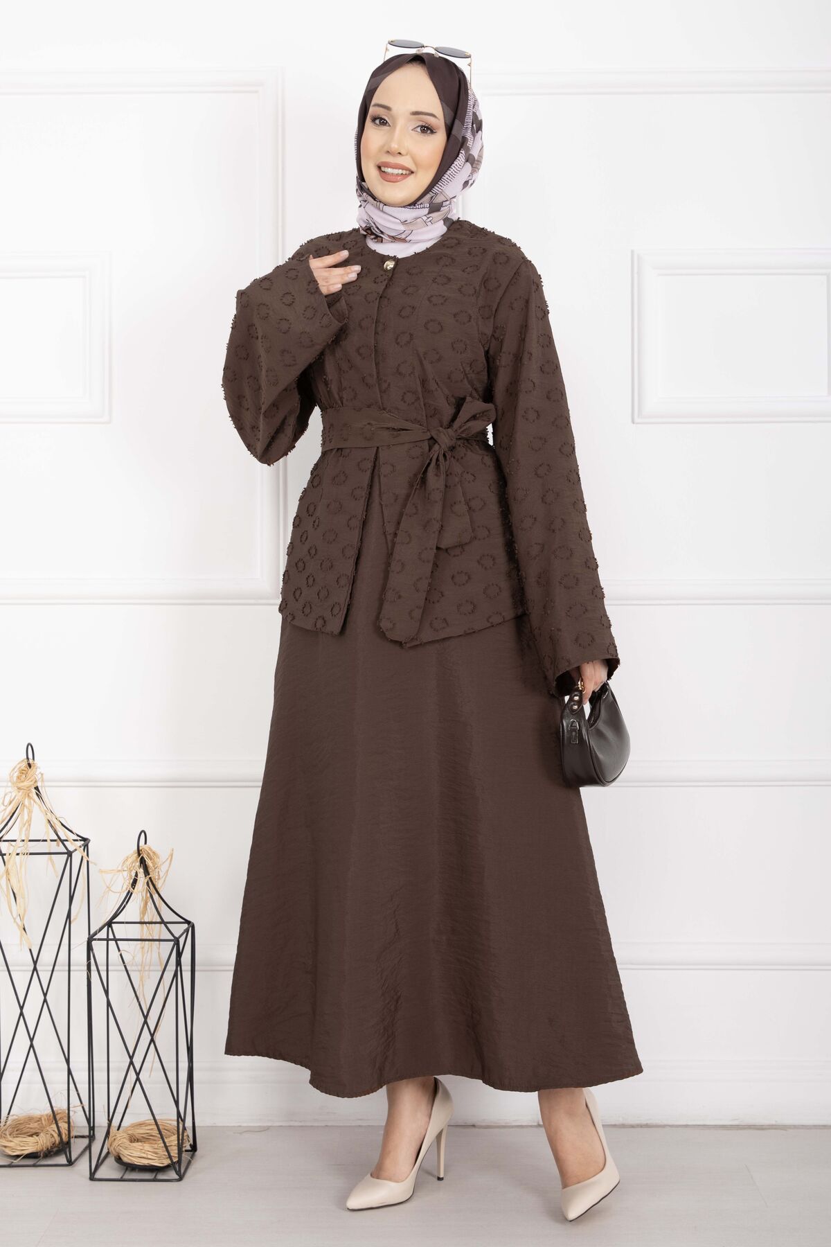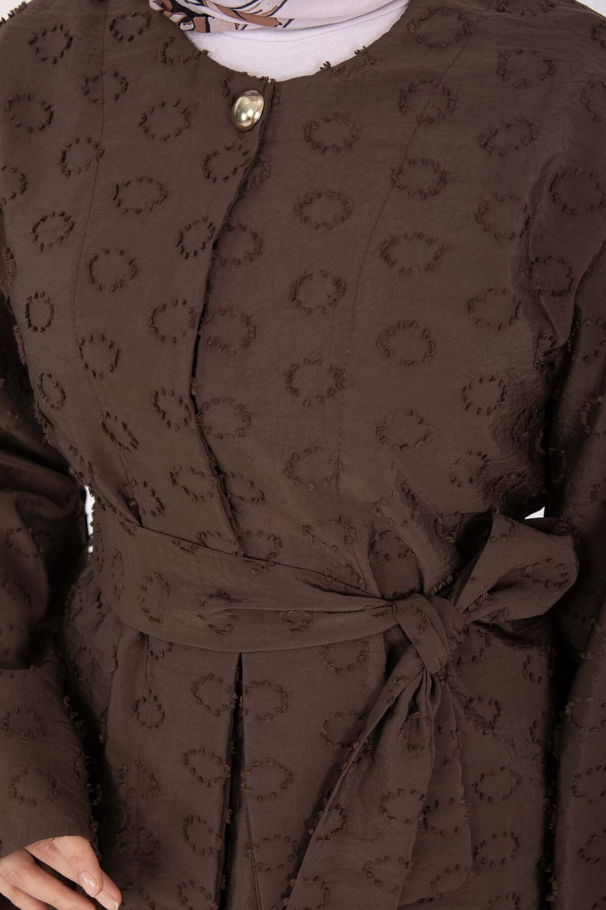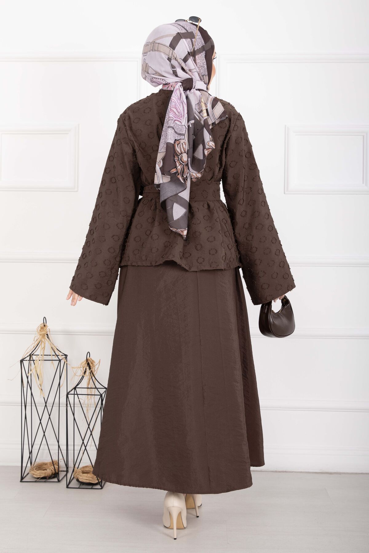 Kabartma Dokulu Kuşaklı Etek Takım Kahve