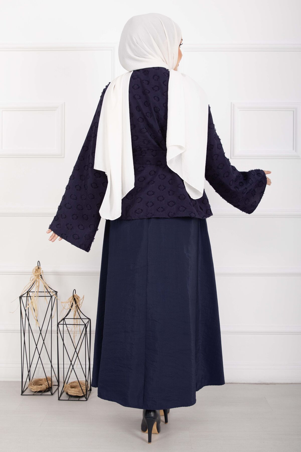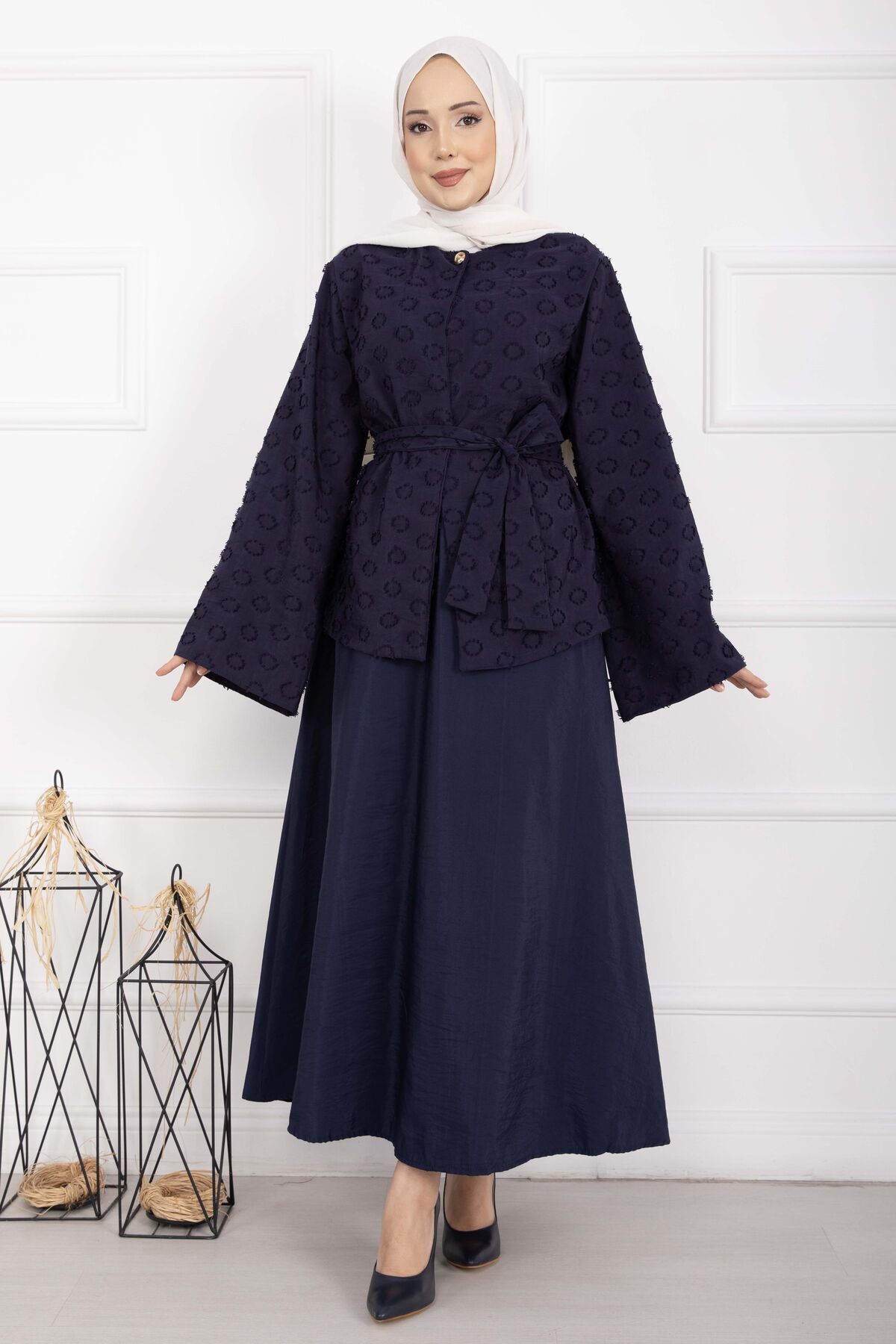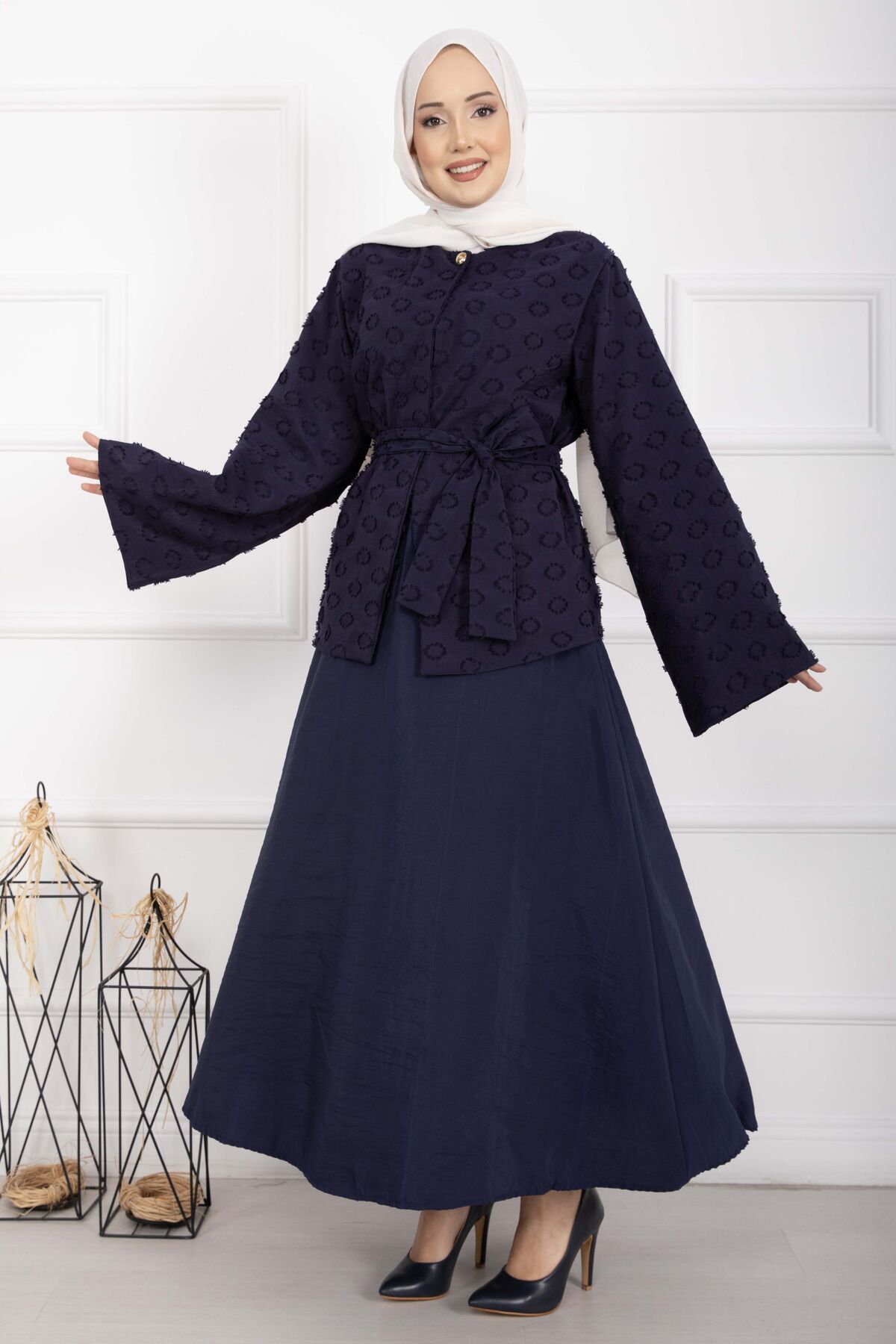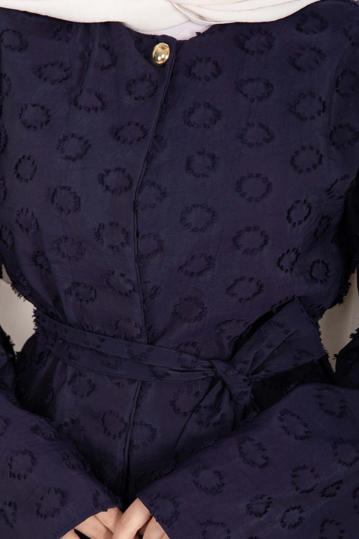Kabartma Dokulu Kuşaklı Etek Takım Lacivert