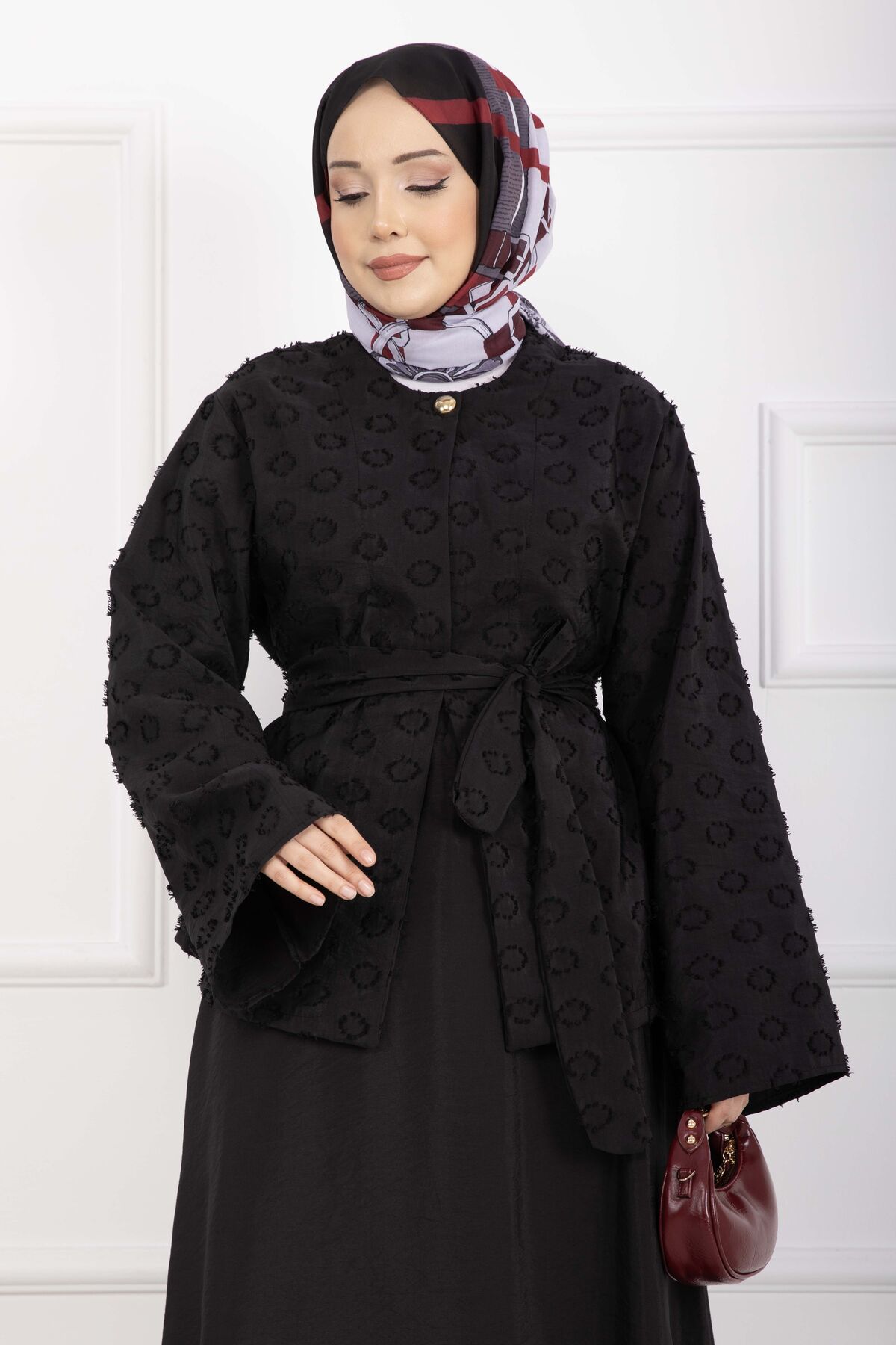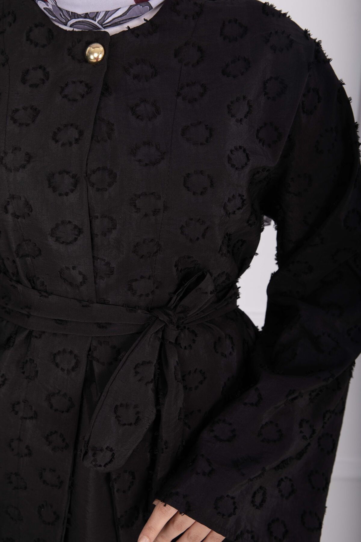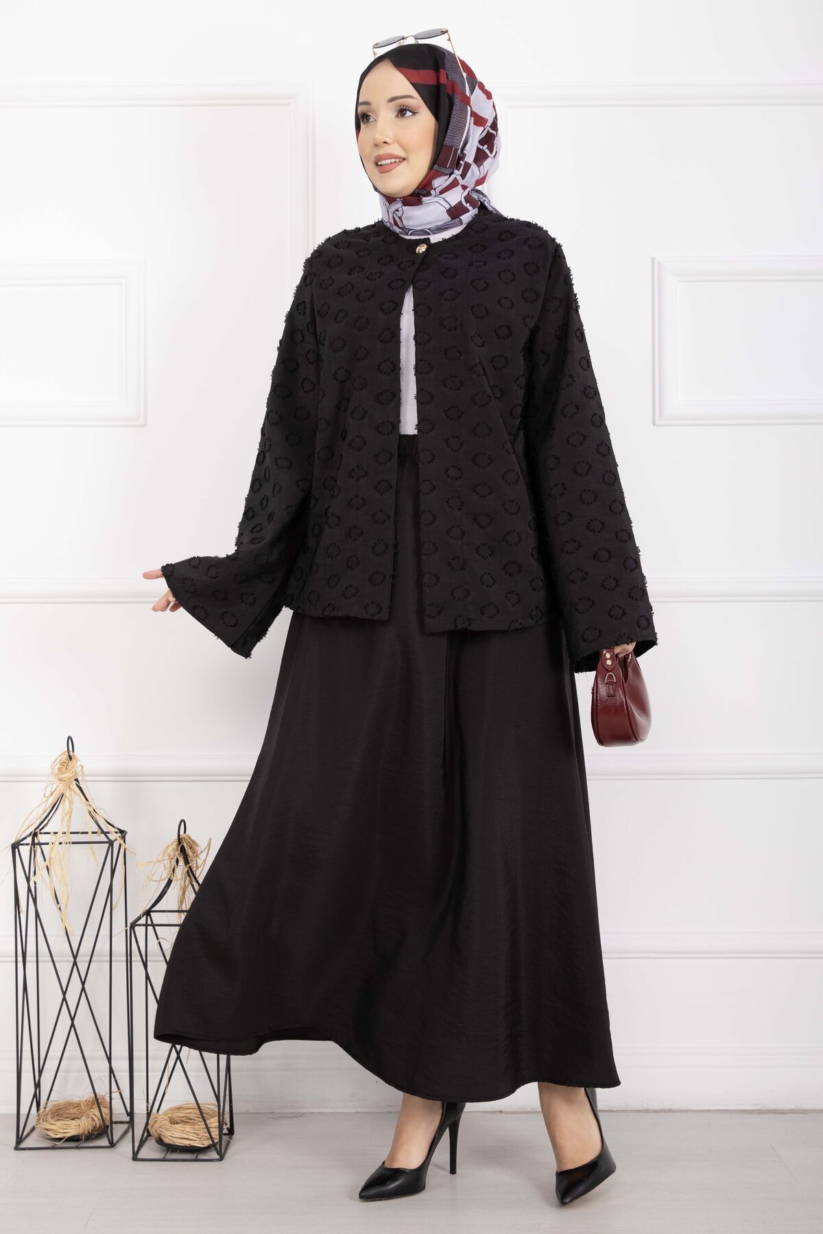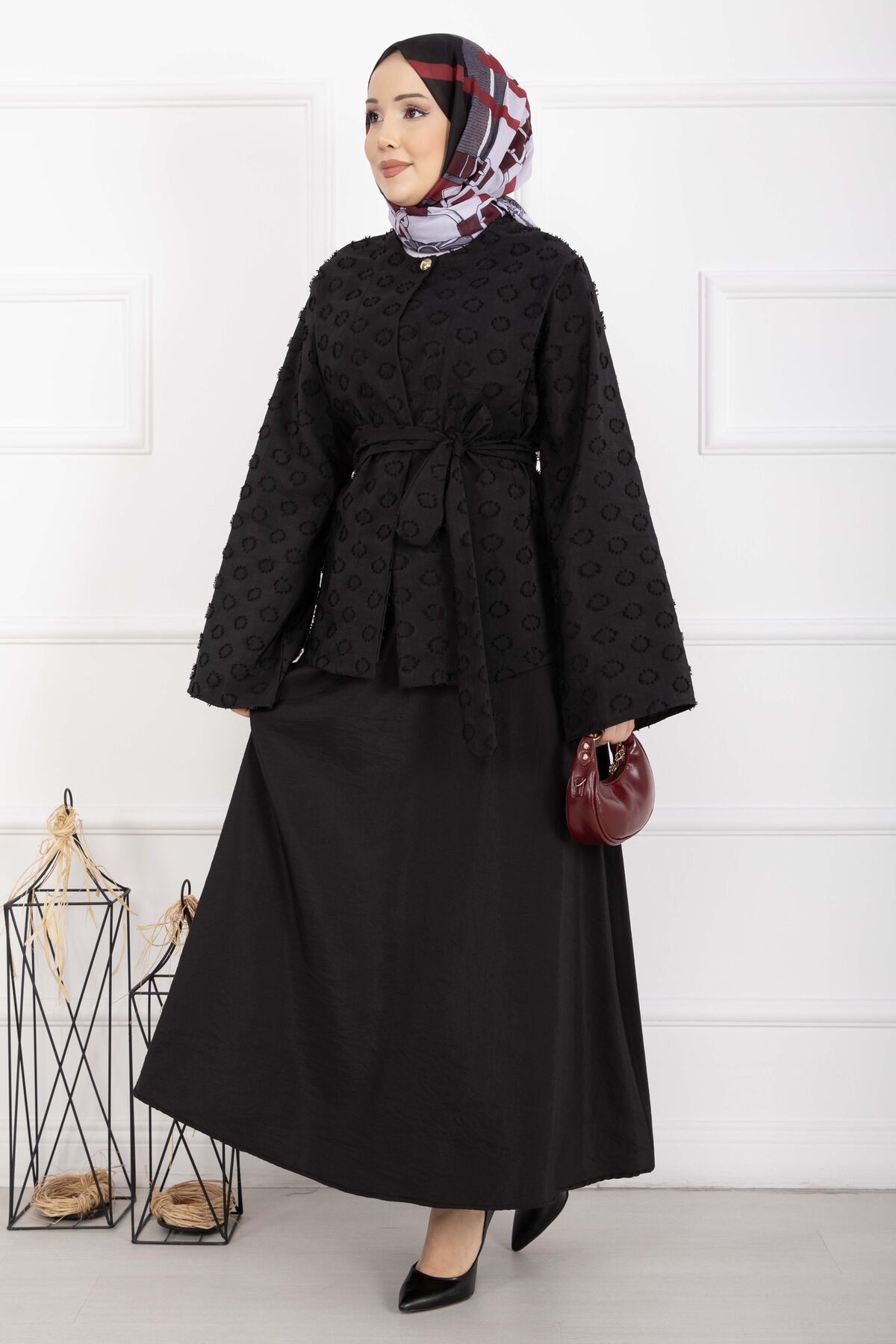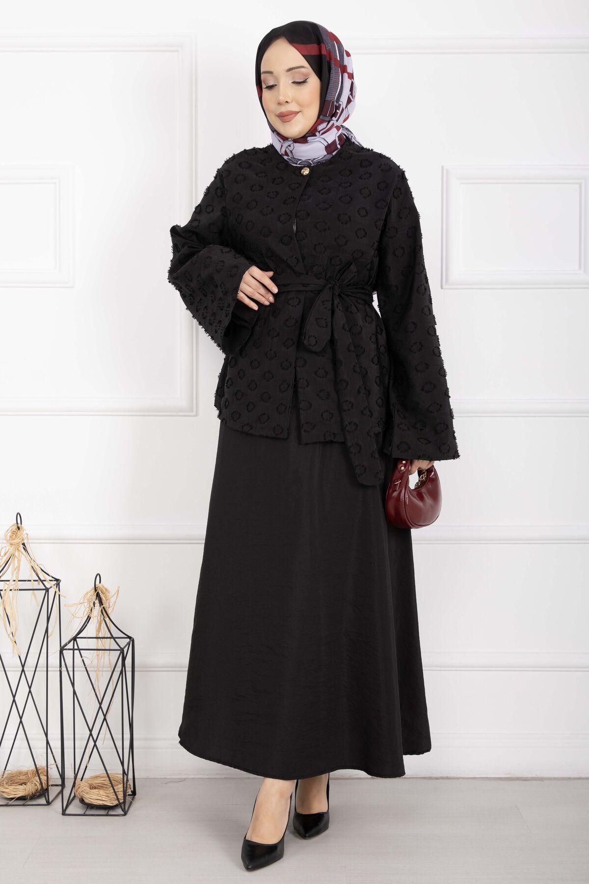 Kabartma Dokulu Kuşaklı Etek Takım Siyah