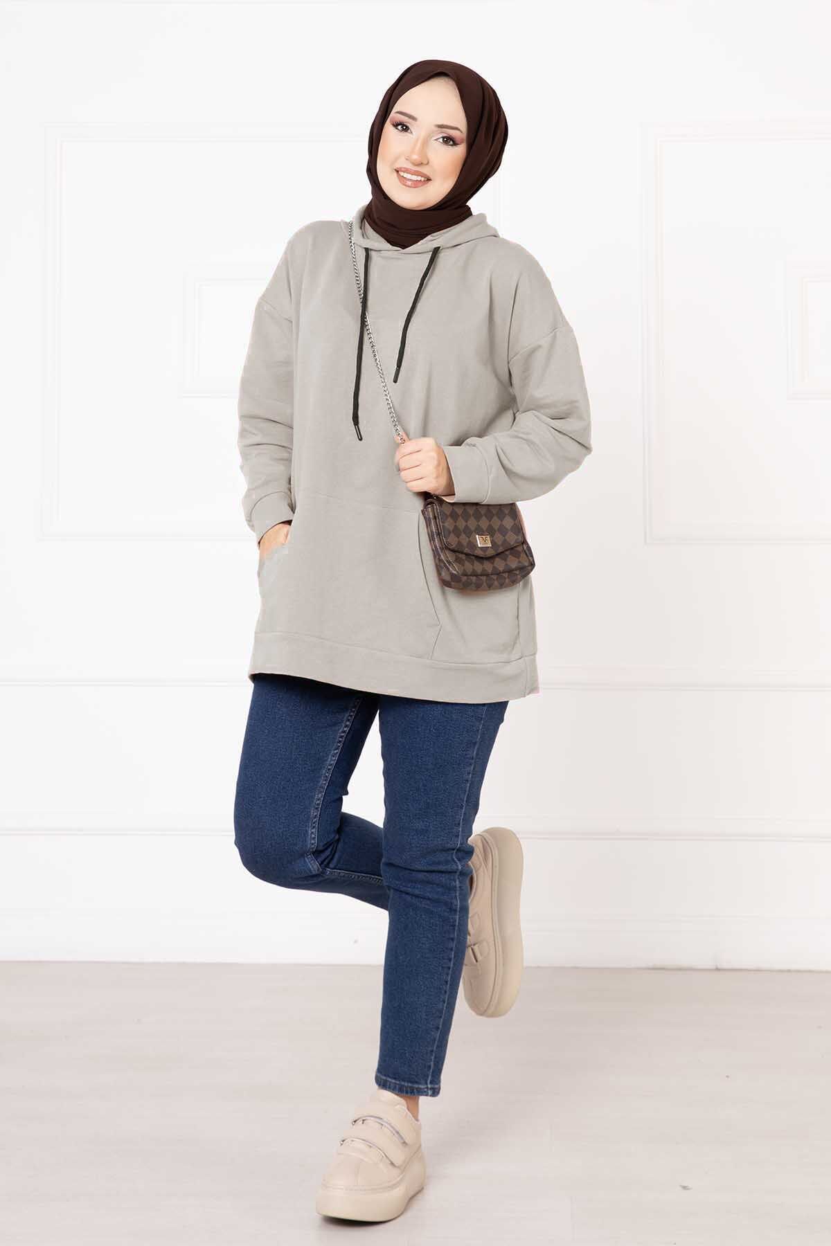 Kanguru Cepli Tesettür Sweatshirt Taş