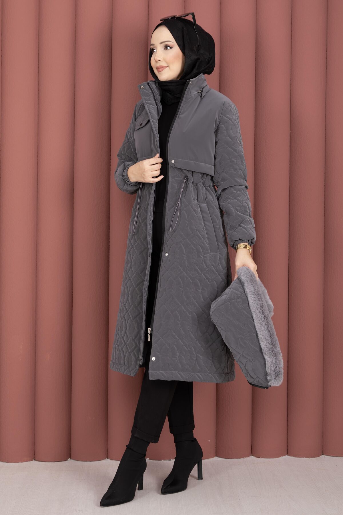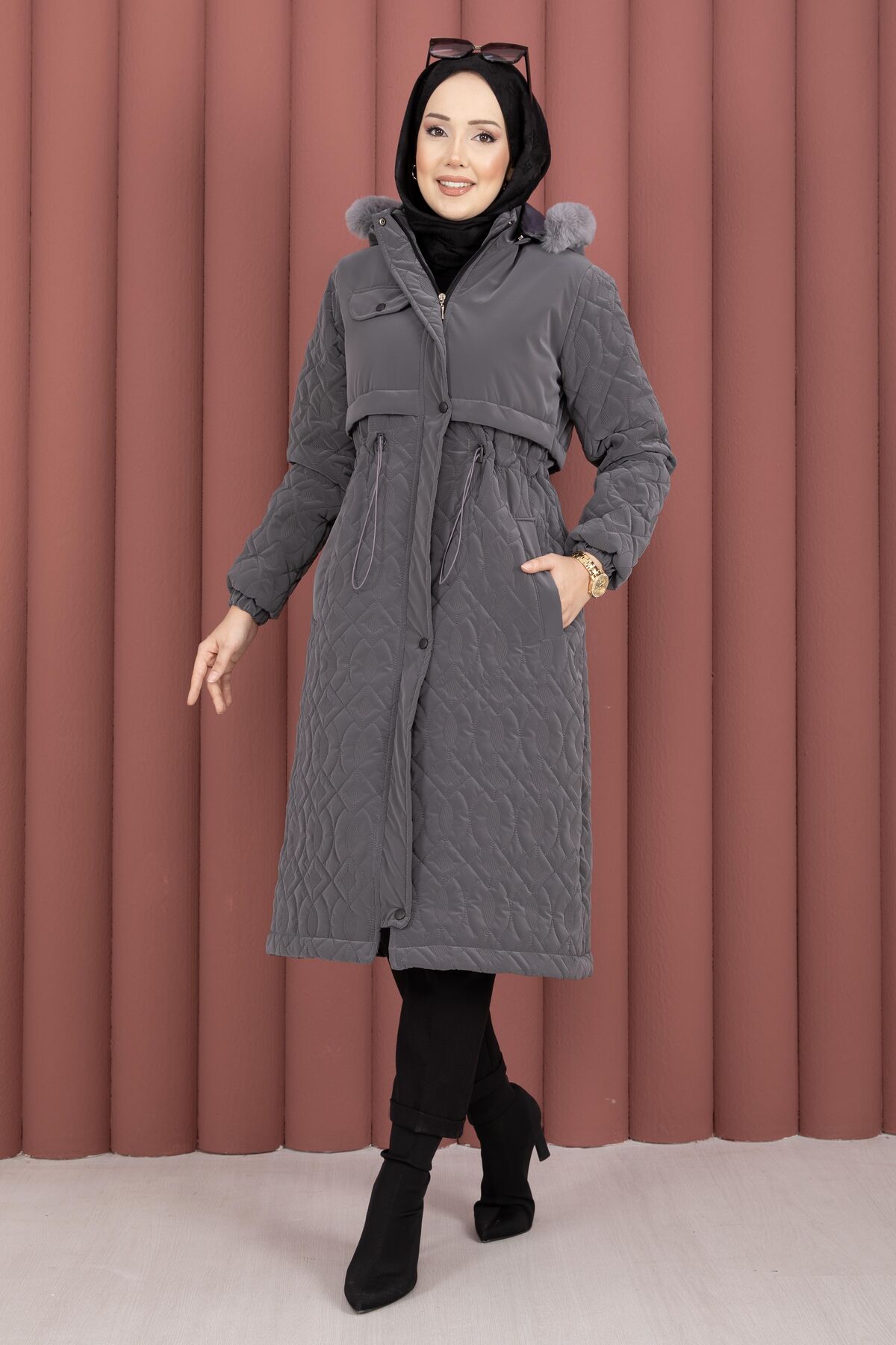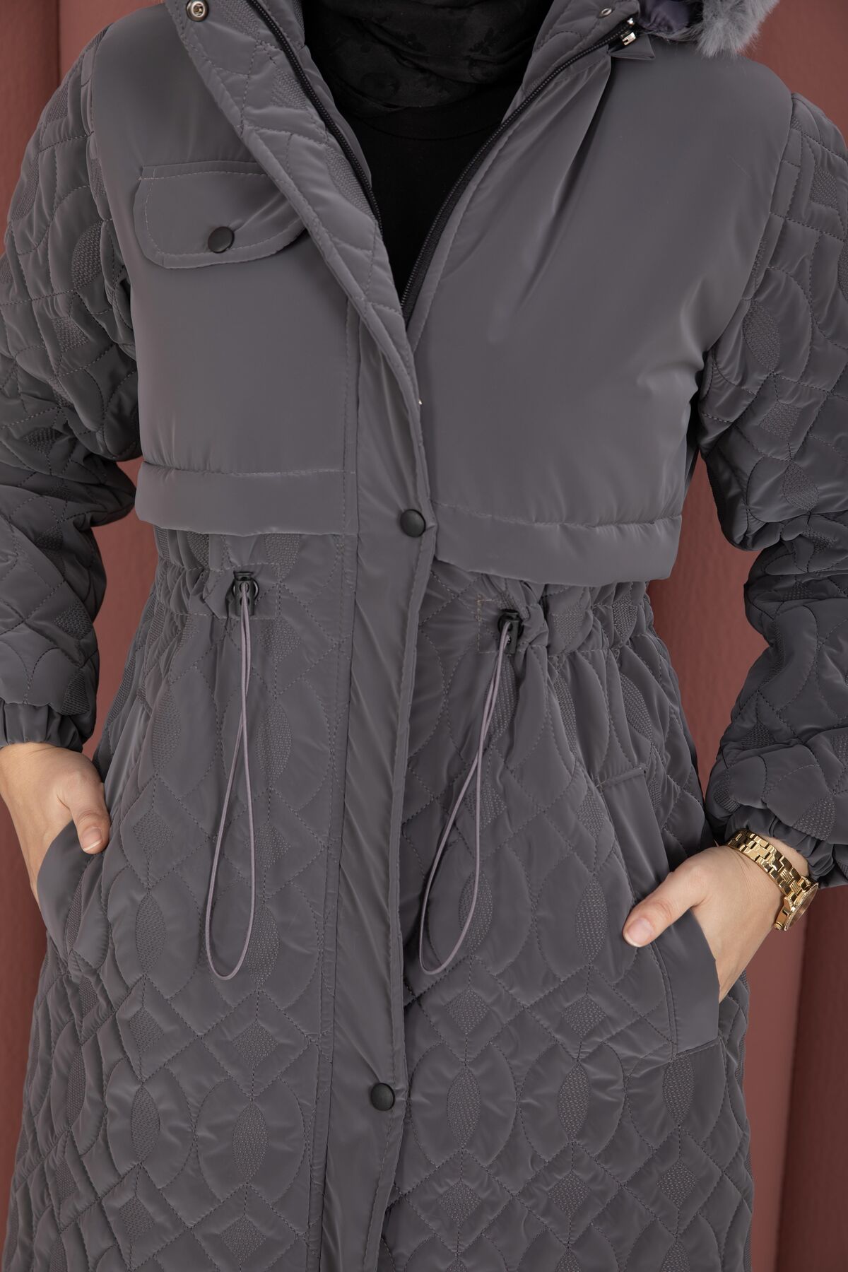 Kapitone Desen Kürk Kapüşonlu Nova Kaban, modern kapitone dokusu ve şık tasarımıyla soğuk havalarda hem konfor hem de stil sunar. Günlük kullanıma uygun formu, zarif detaylarıyla klasik kombinlerle de kolayca uyum sağlar. Kürklü kapüşonu çıkarılabilir, önden fermuarlı tasarımı ile hem fonksiyonel hem de estetik bir kullanım imkânı sunar.