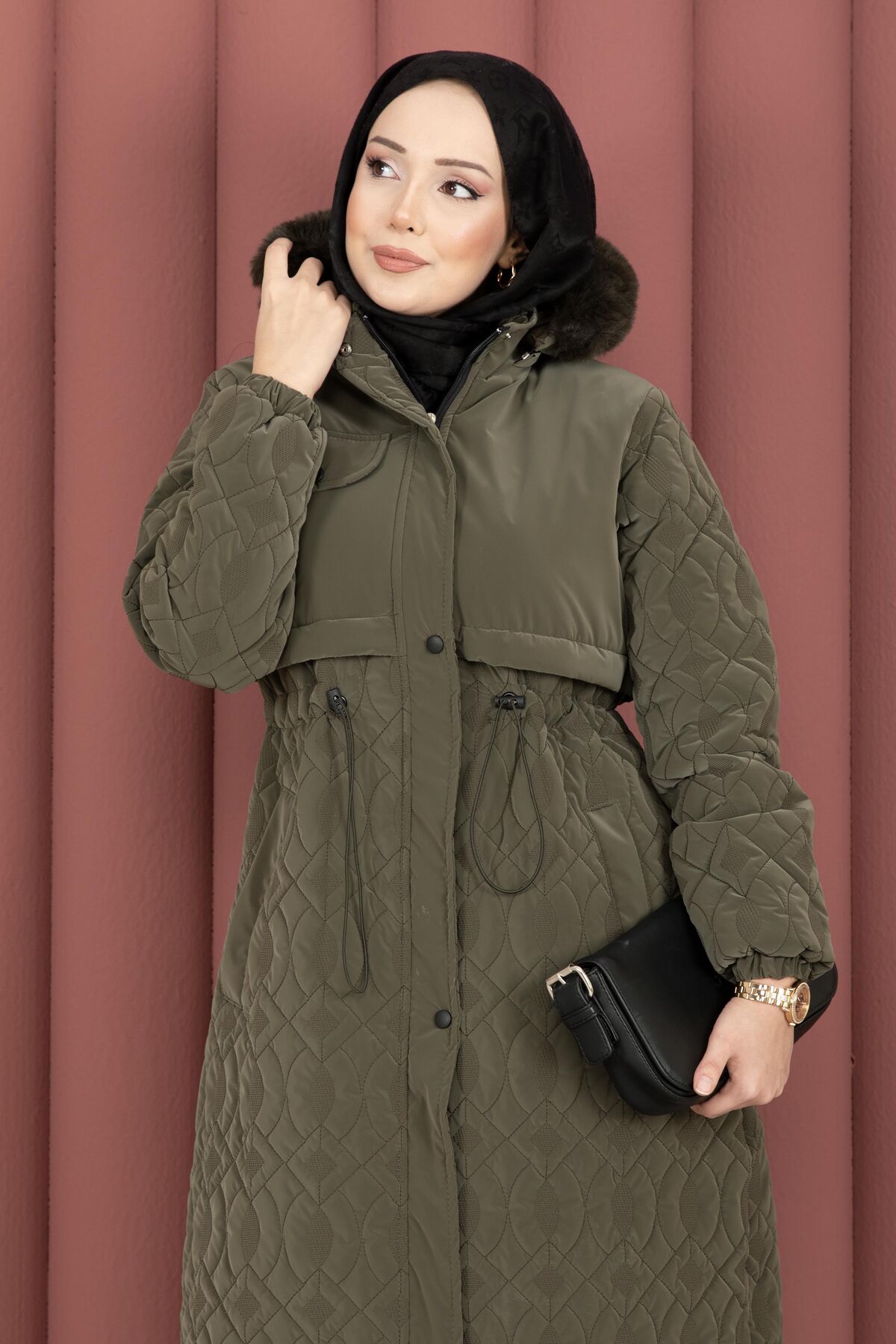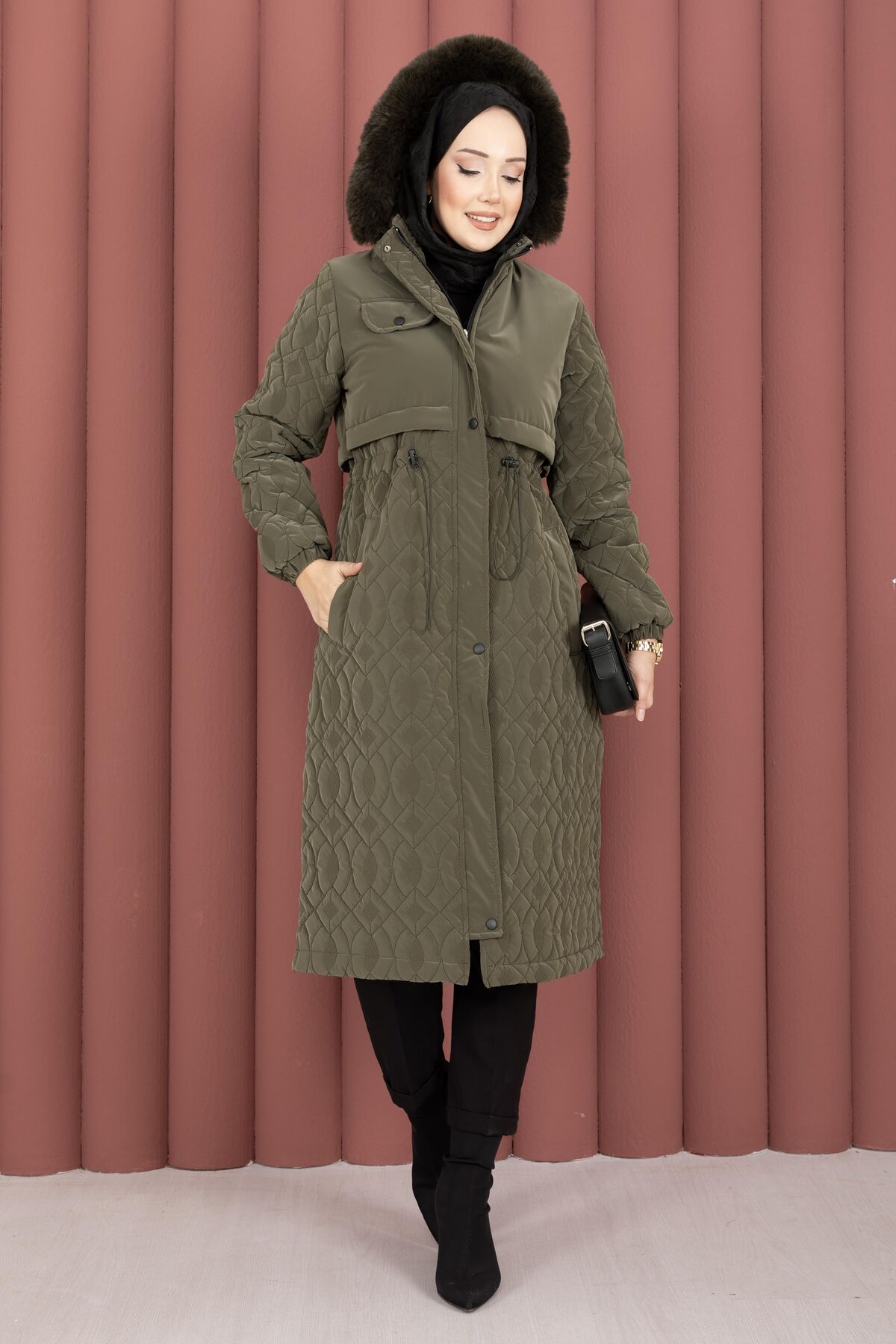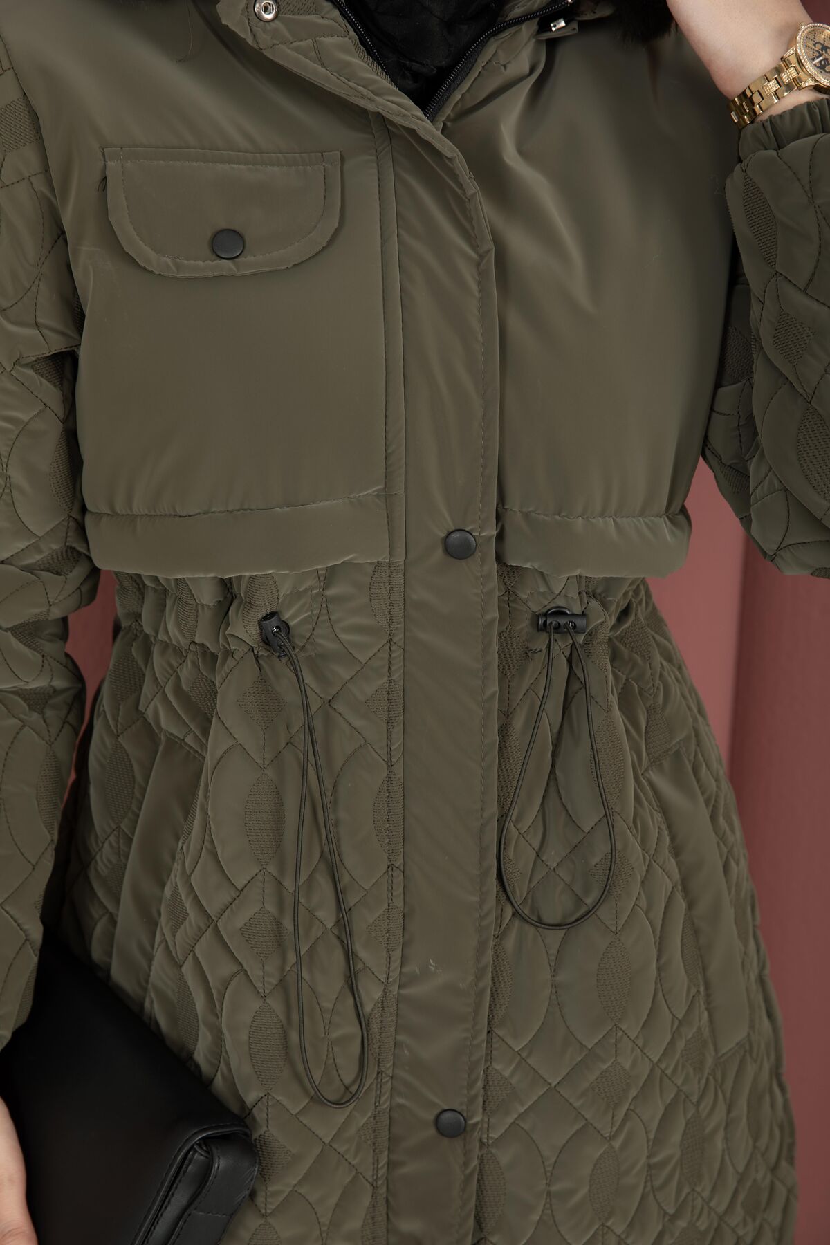 Kapitone Desen Kürk Kapüşonlu Nova Kaban Haki