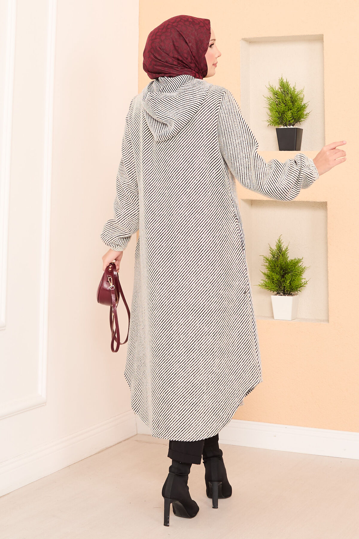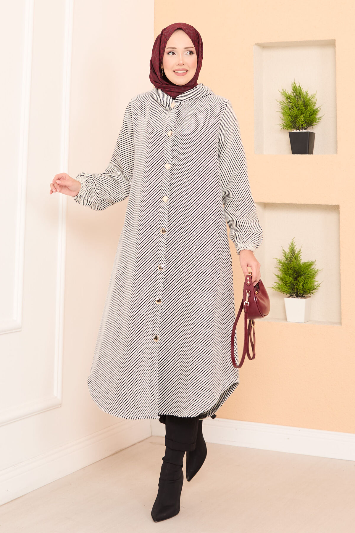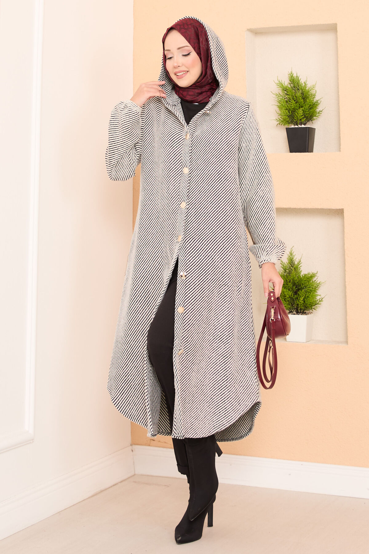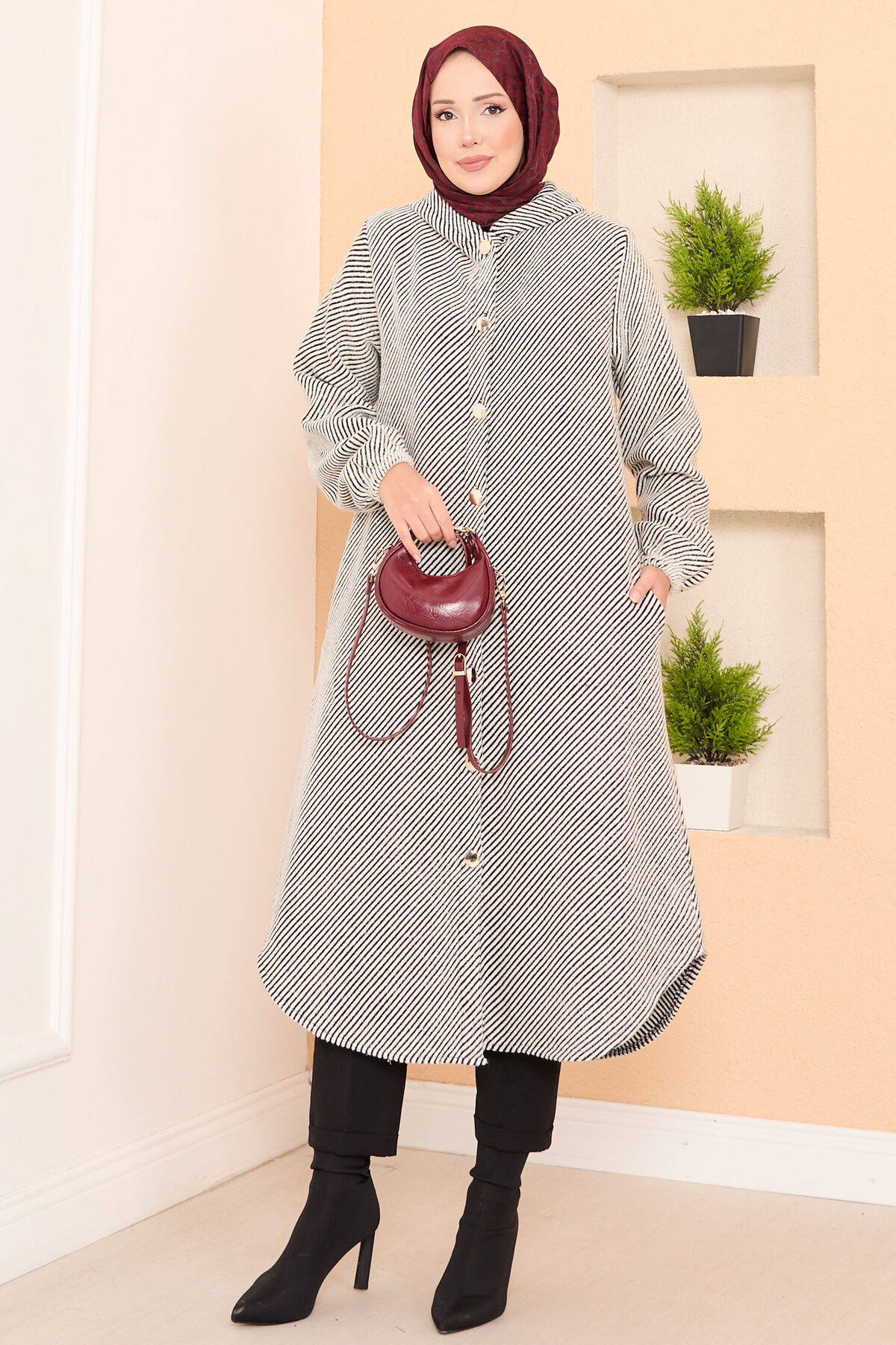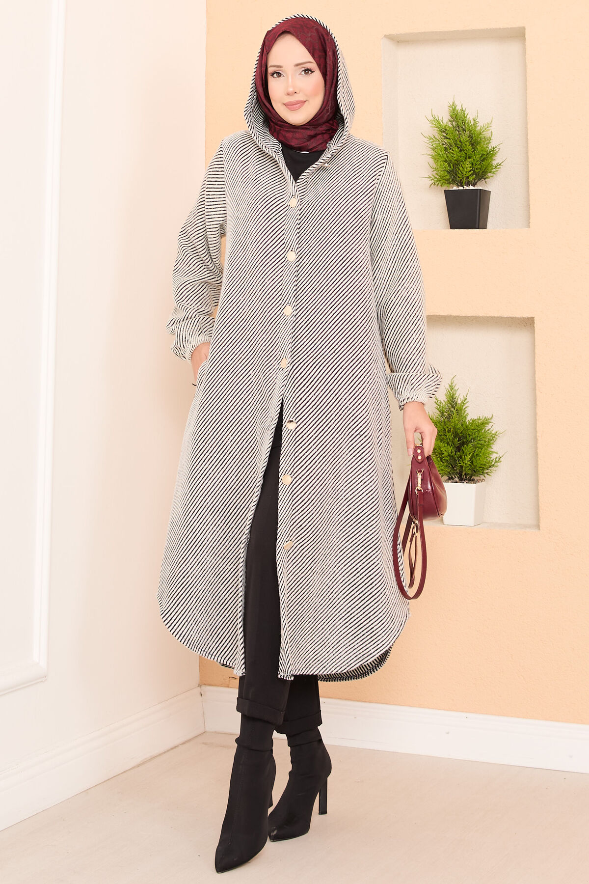 Kapüşon Detaylı Balıksırtı Tesettür Kaşe Kap Siyah Beyaz