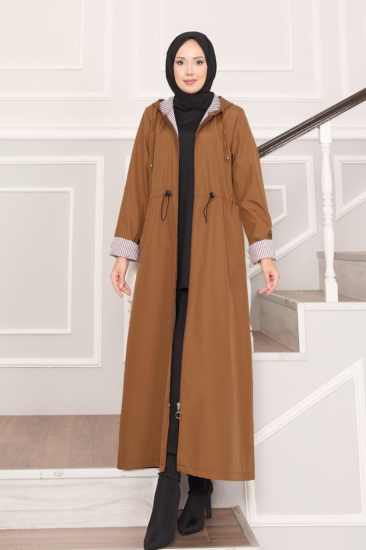 Kapüşonlu Beli Ayarlanabilir Battal Uzun Trençkot Taba