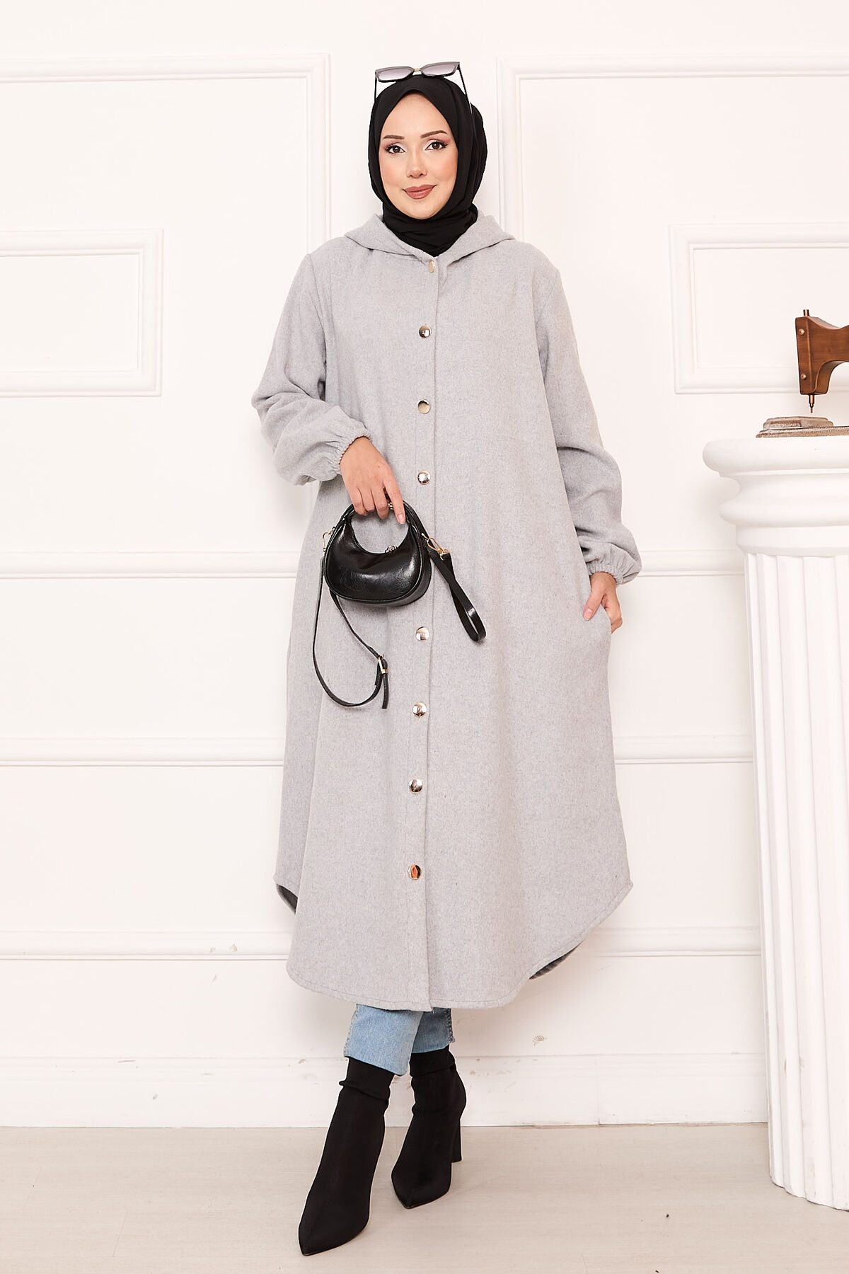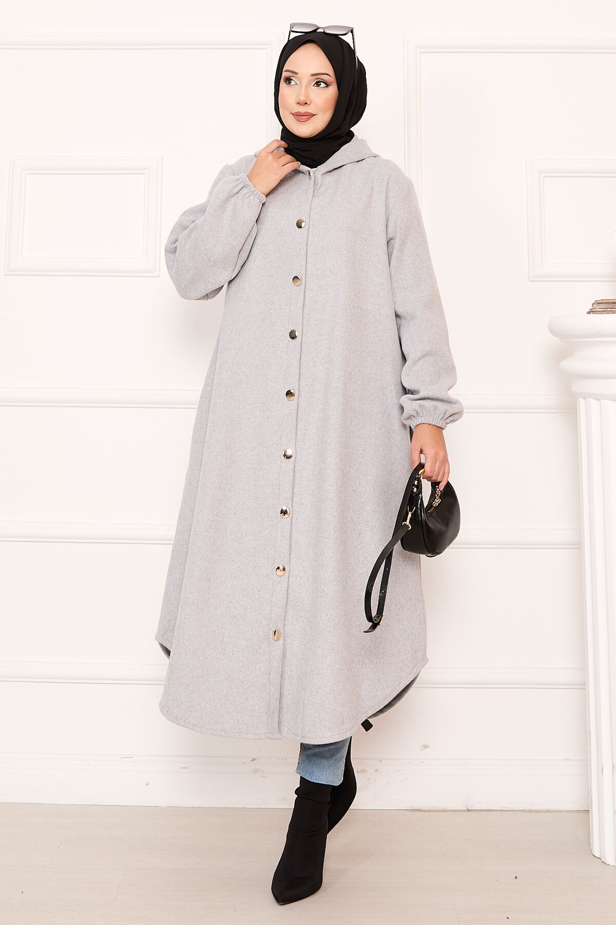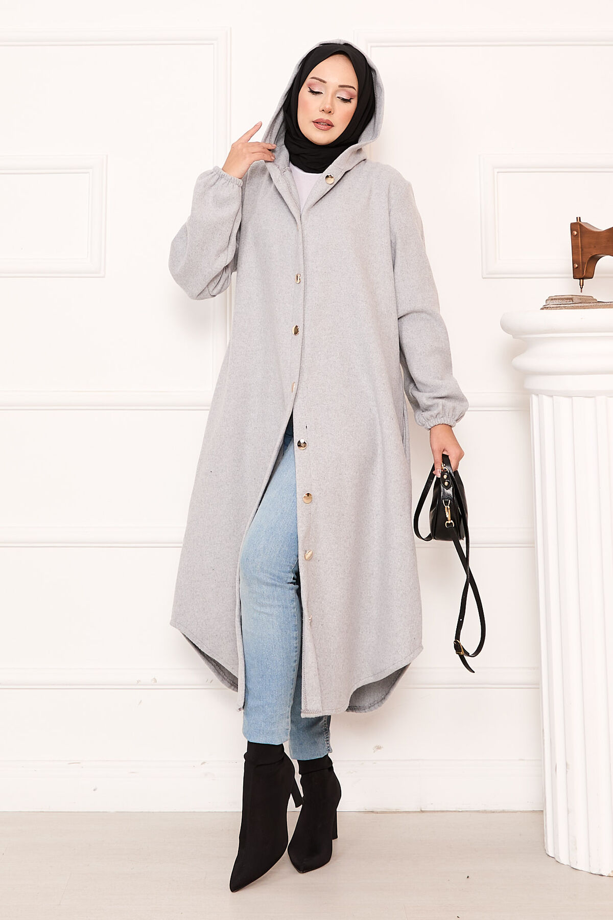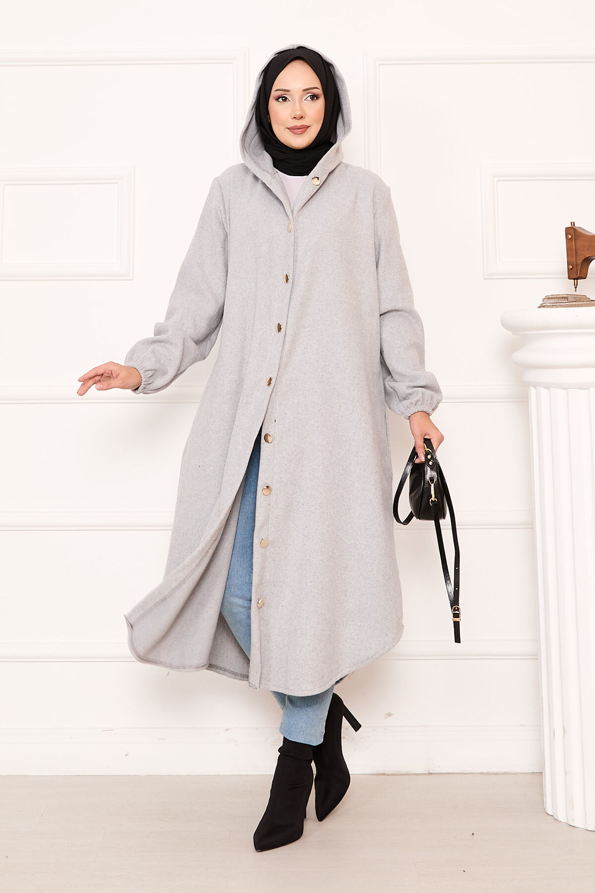Kapüşonlu Boydan Düğmeli Kaşe Kap Gri