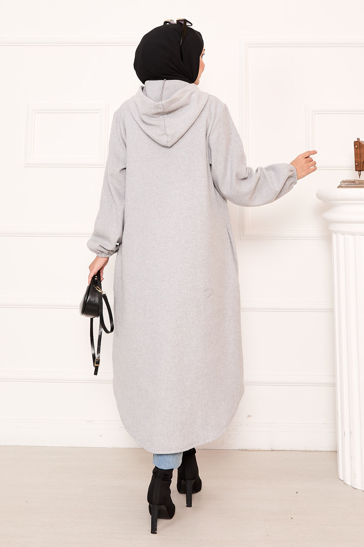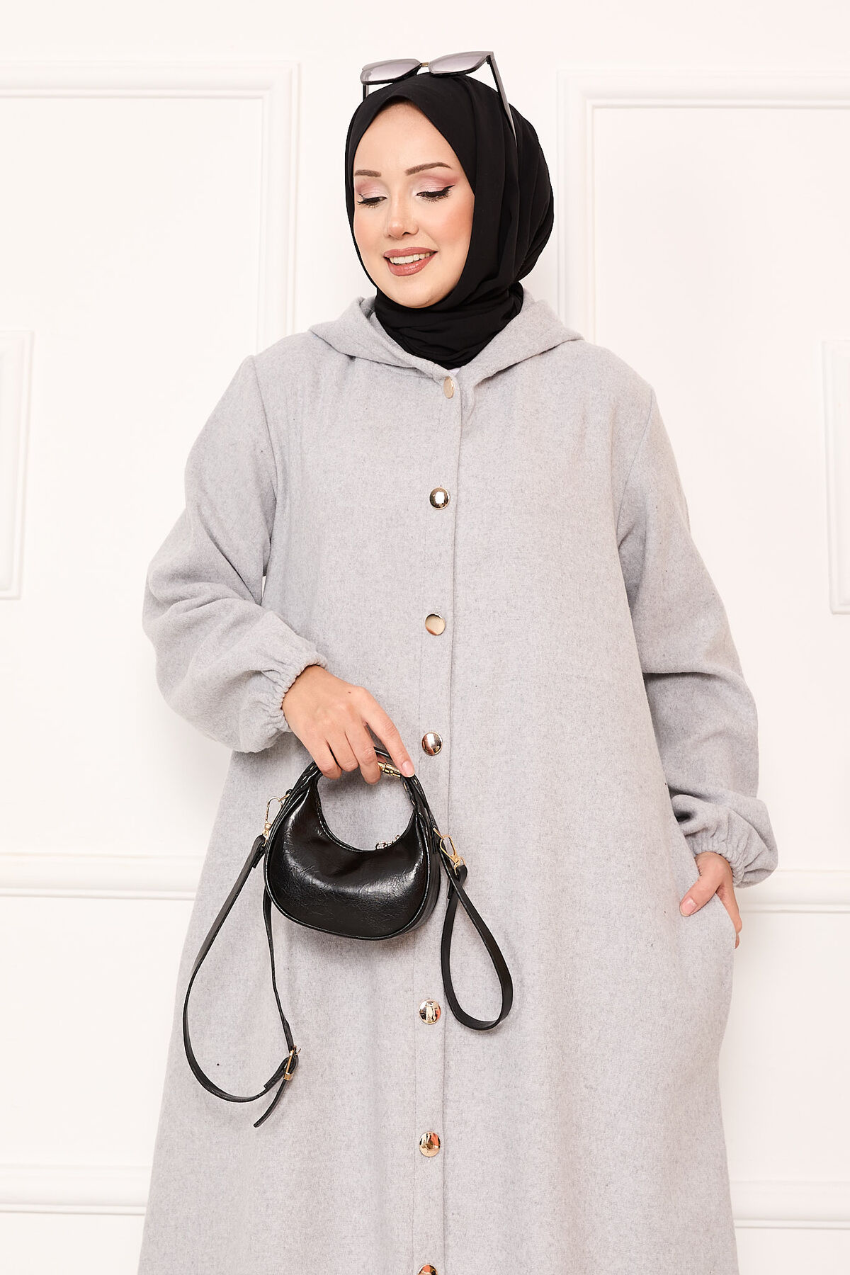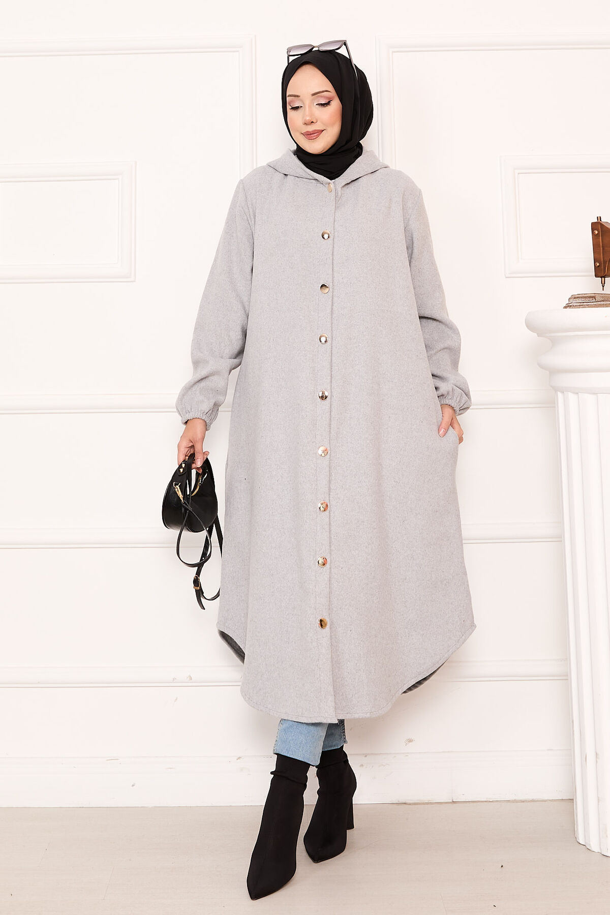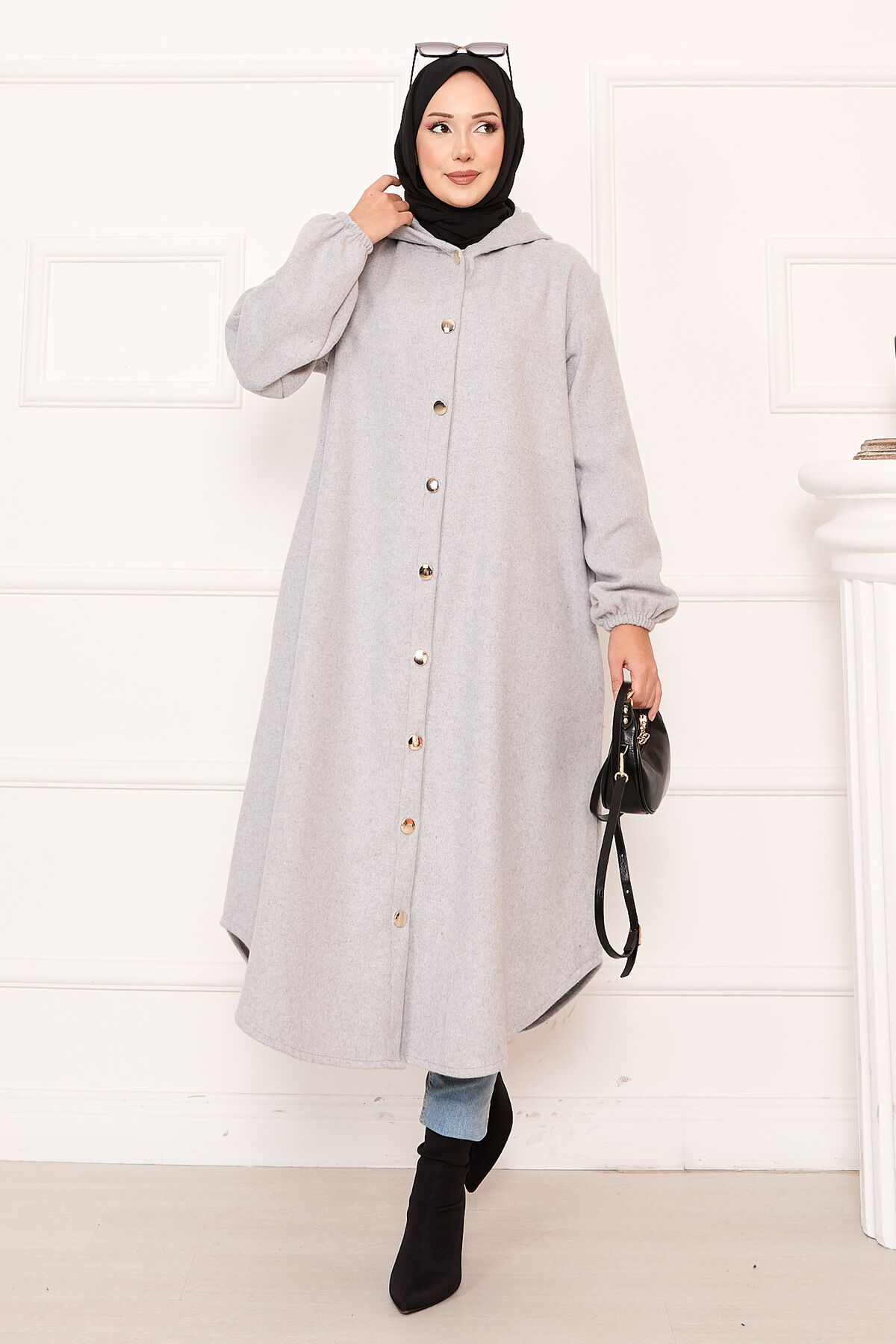 Kapüşonlu Boydan Düğmeli Kaşe Kap Gri