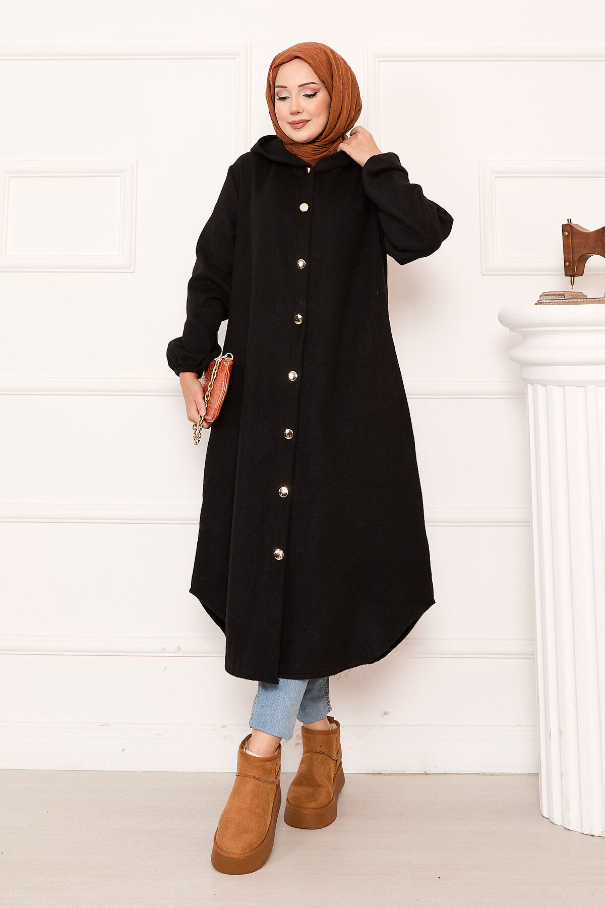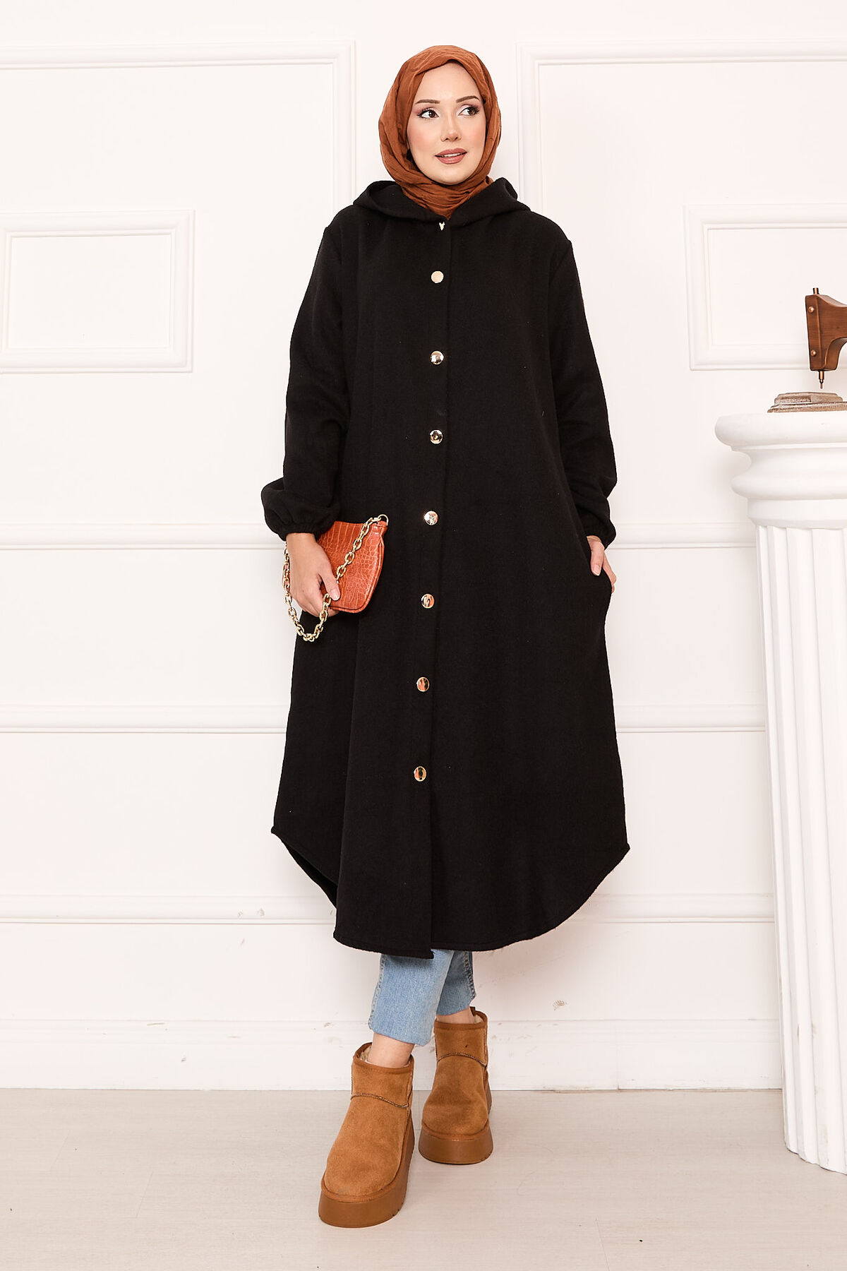 Kapüşonlu Boydan Düğmeli Kaşe Kap Siyah