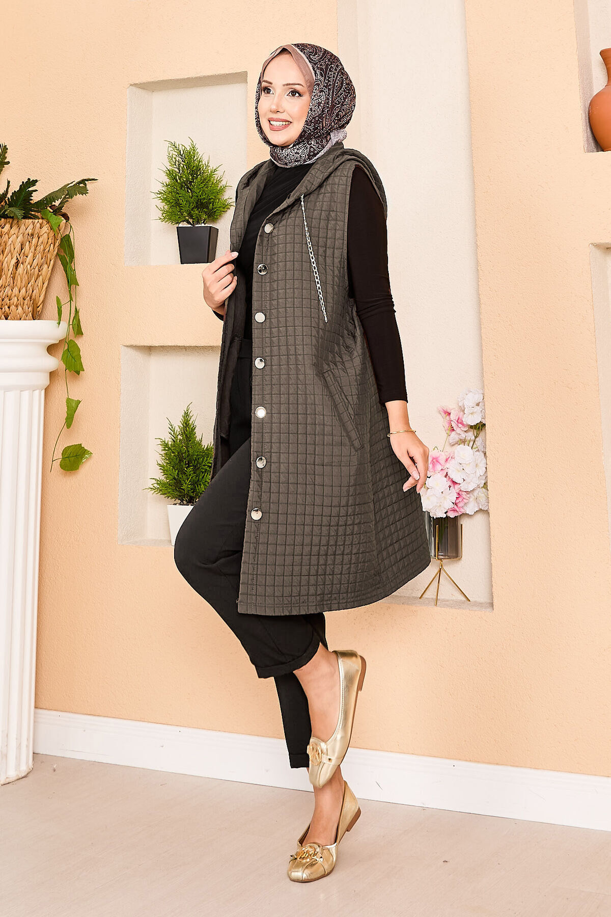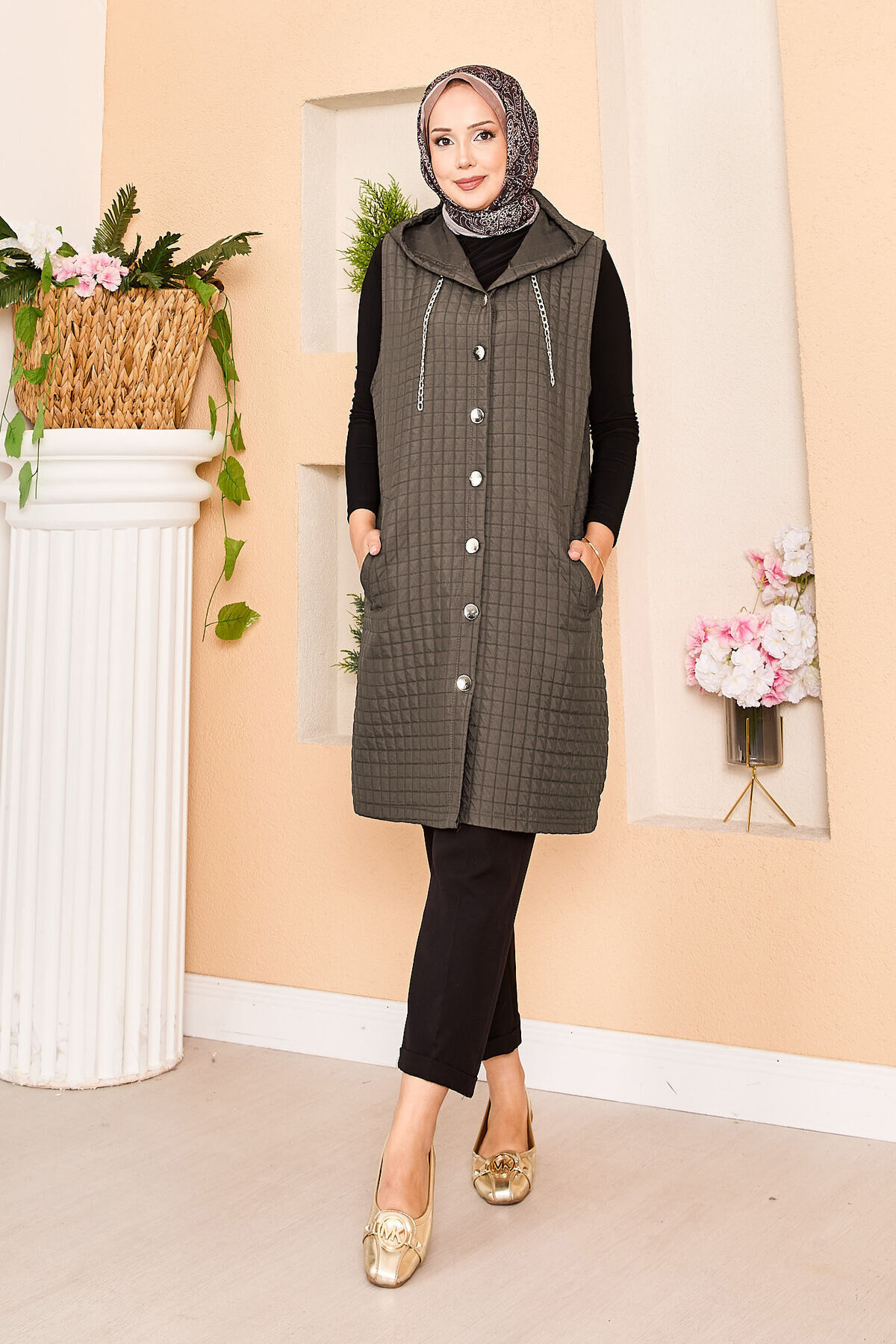 - Ürün mevsimliktir. Boydan düğmeli ve kapüşonlu yandan cepli ve kapüşonesi zincir detaylı kapitone yelek