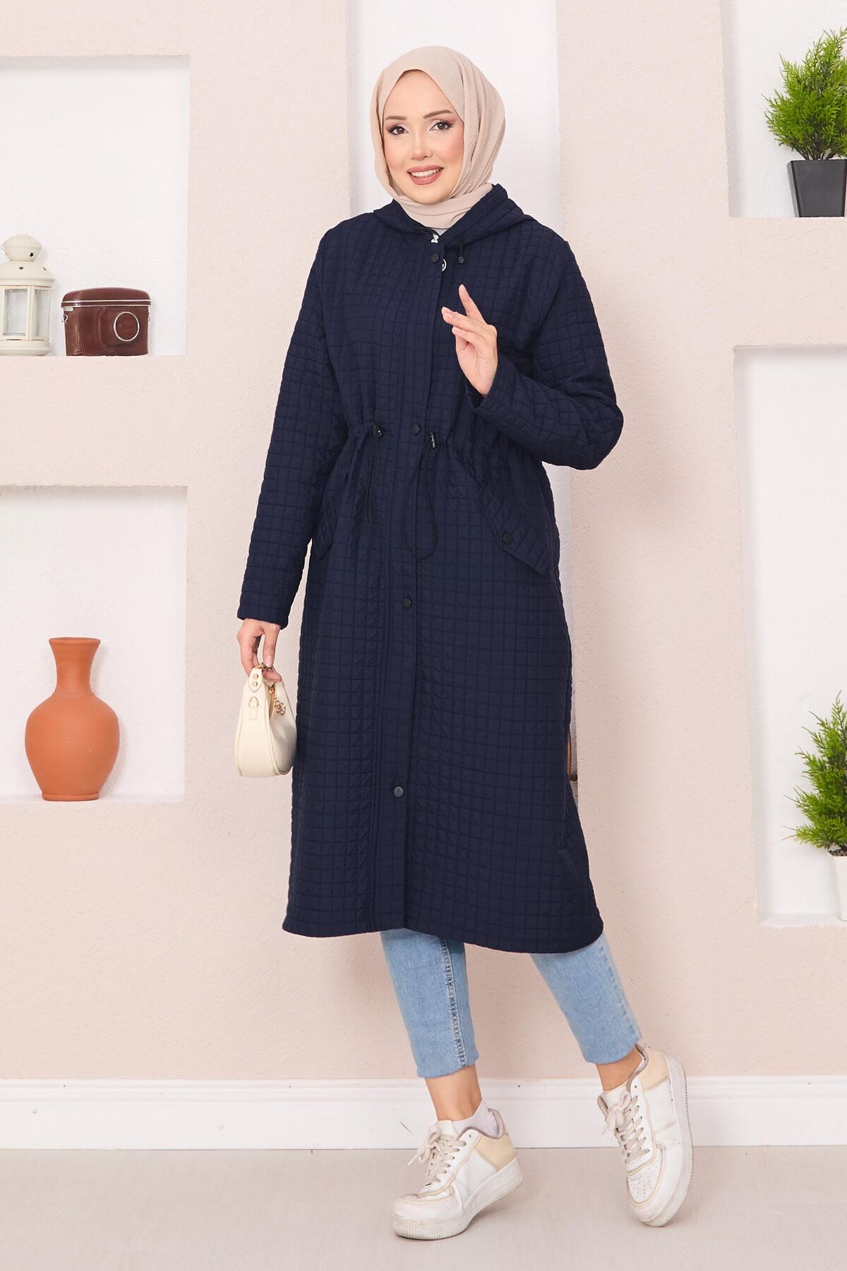 Kapüşonlu Kapitone Tesettür Trenç Lacivert