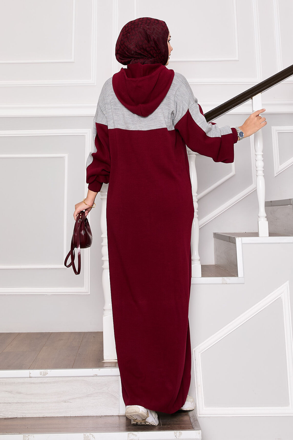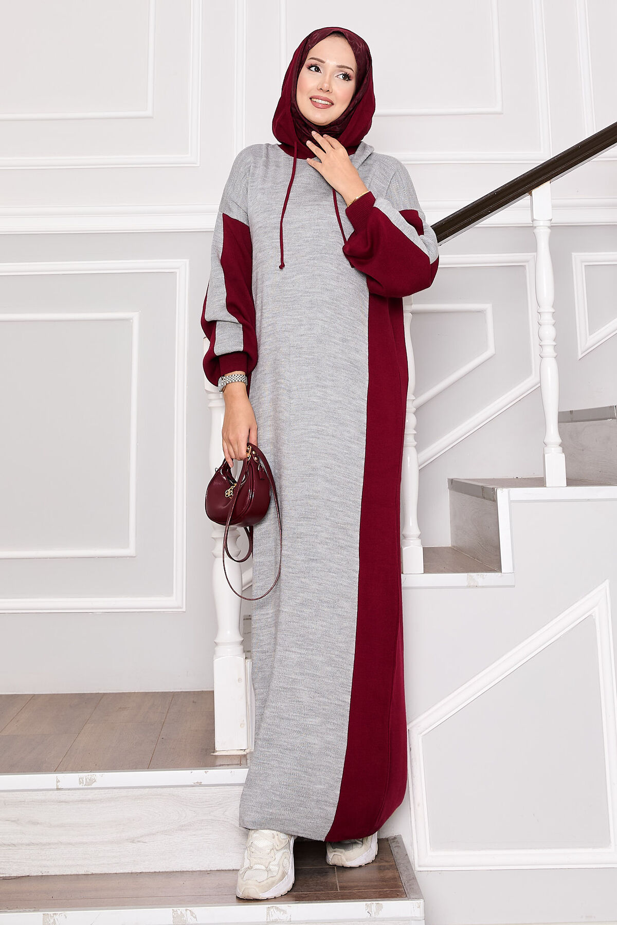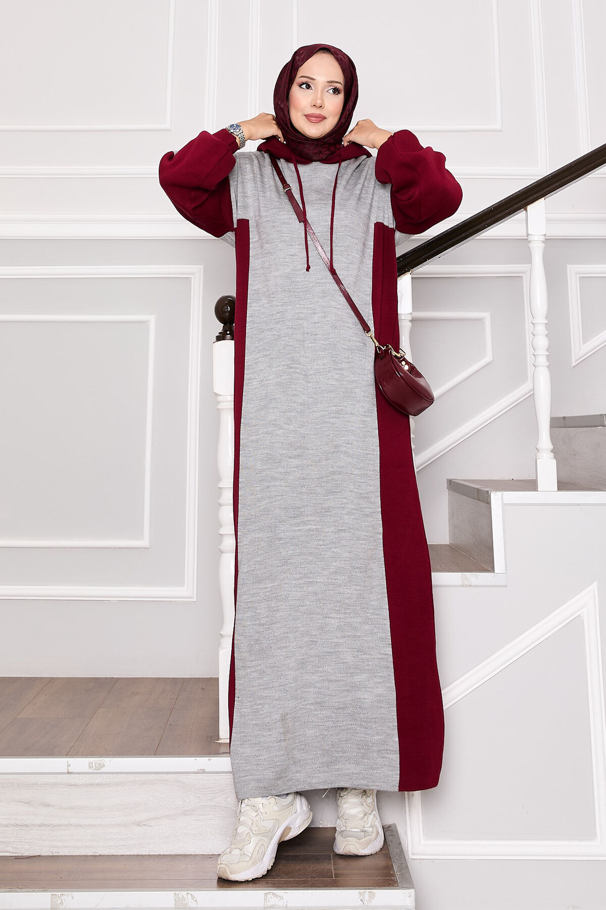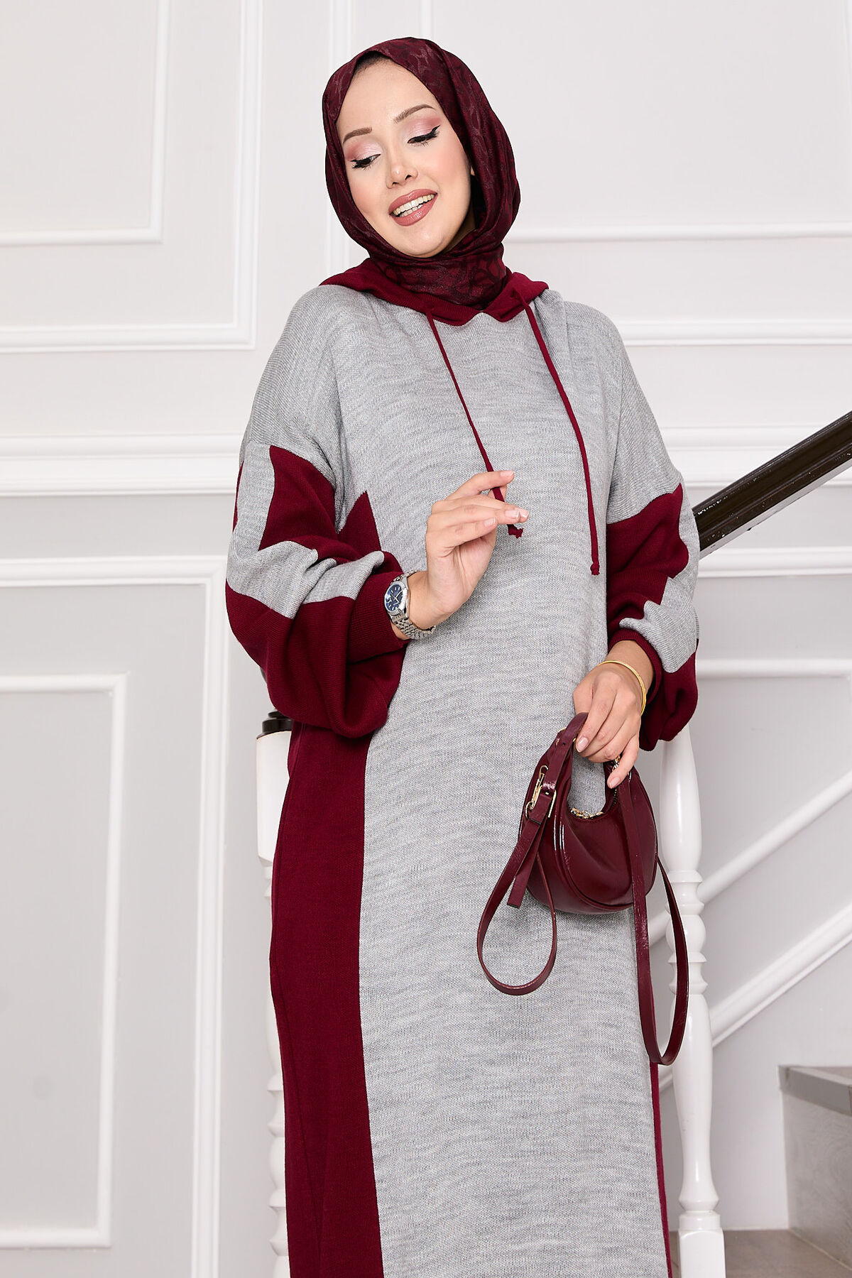Kapüşonlu Spor Triko Elbise Bordo-Gri
