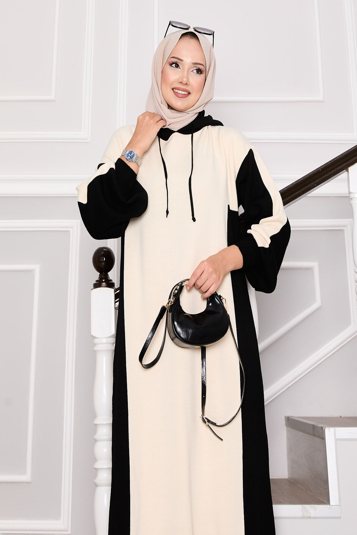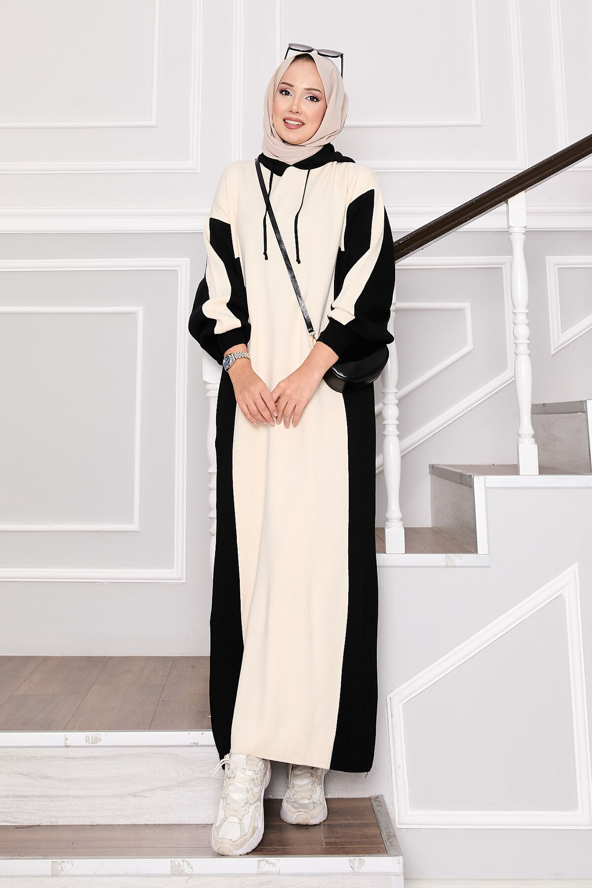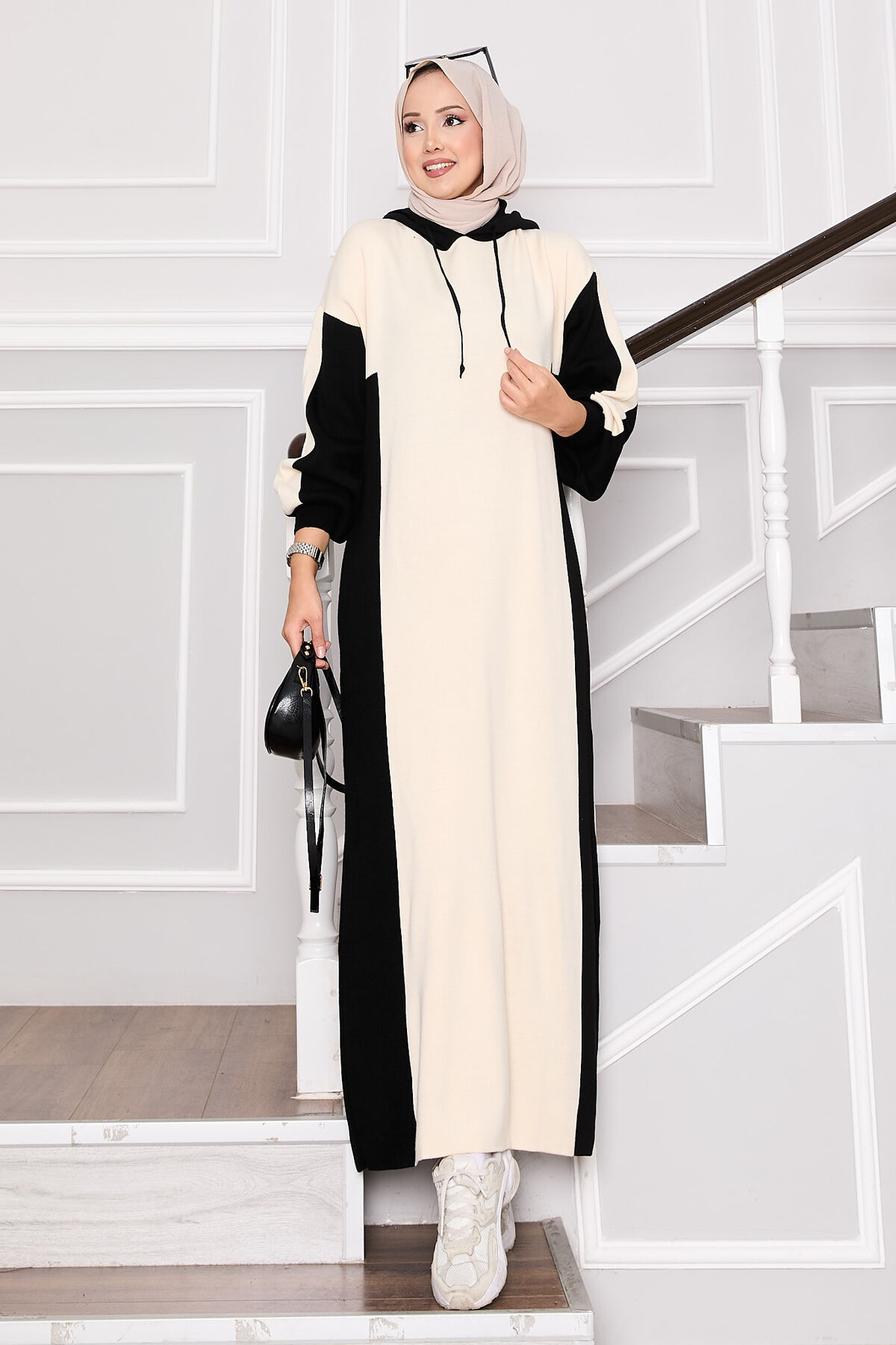 Kapüşonlu Spor Triko Elbise Siyah-Ekru Yorumları