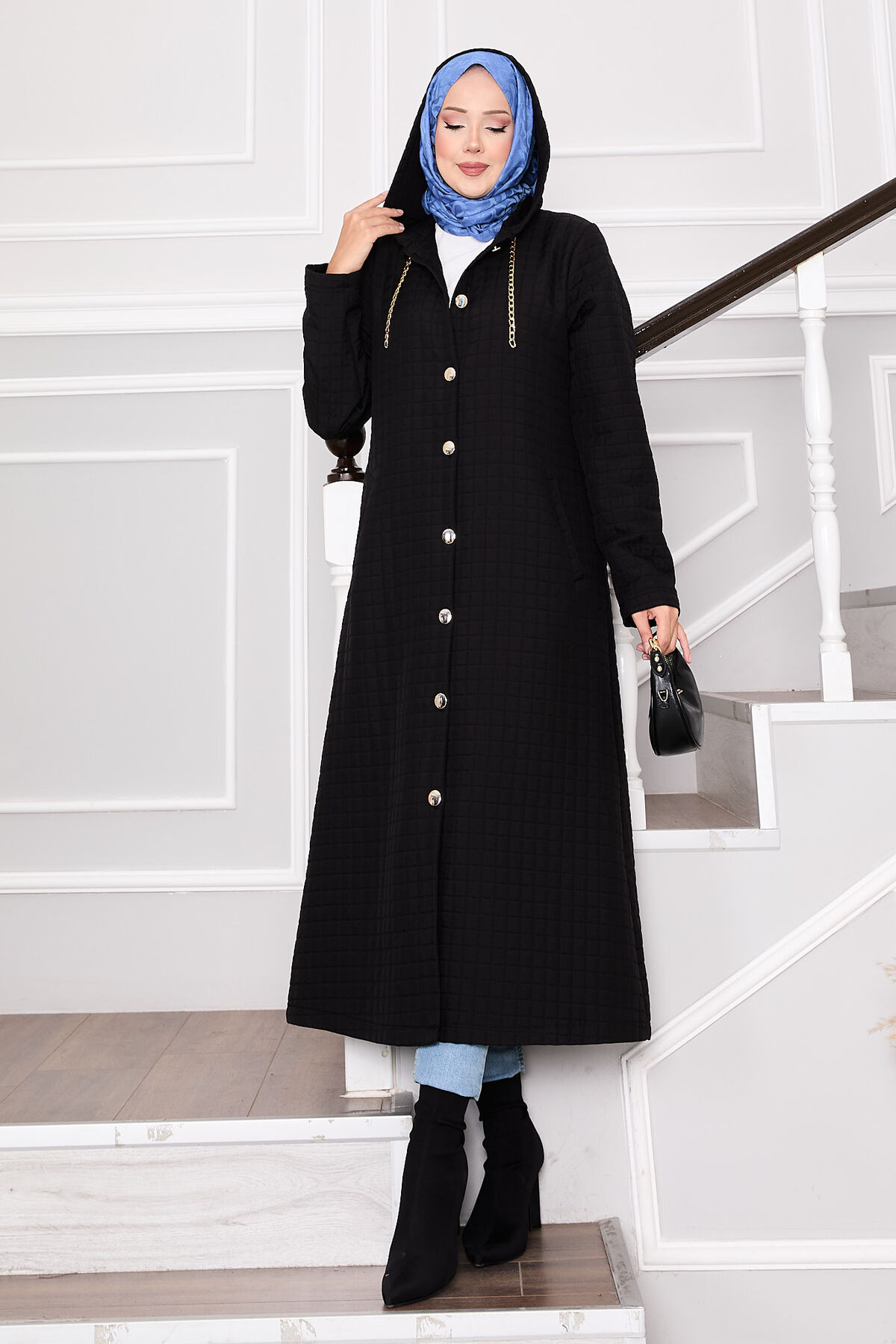 - Ürün mevsimliktir. Boydan düğmeli ve kapüşonlu yandan cepli ve kapüşonesi zincir detaylı kapitone kap ( Astarsızdır.)