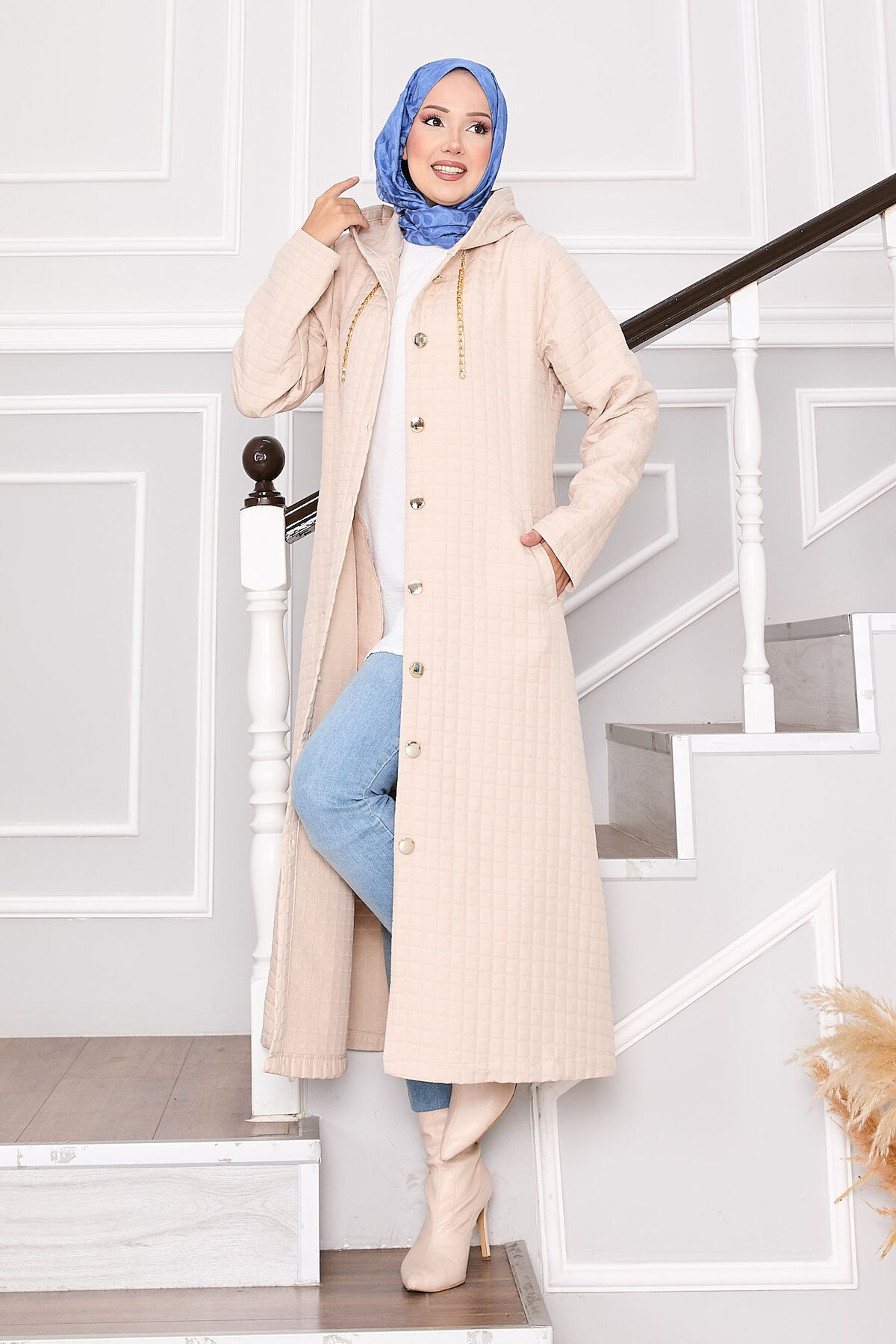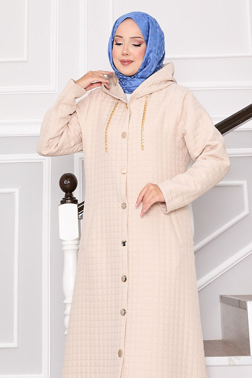 - Ürün mevsimliktir. Boydan düğmeli ve kapüşonlu yandan cepli ve kapüşonesi zincir detaylı kapitone kap ( Astarsızdır.)