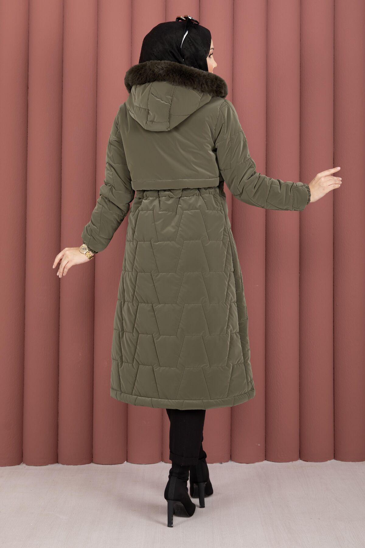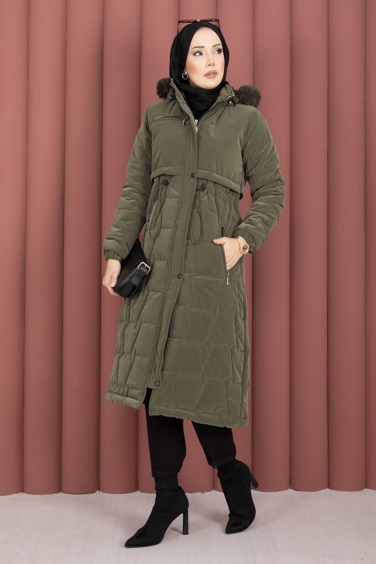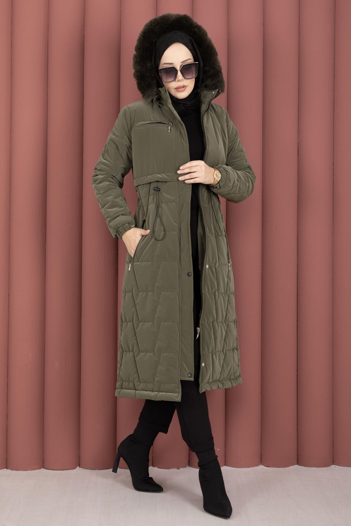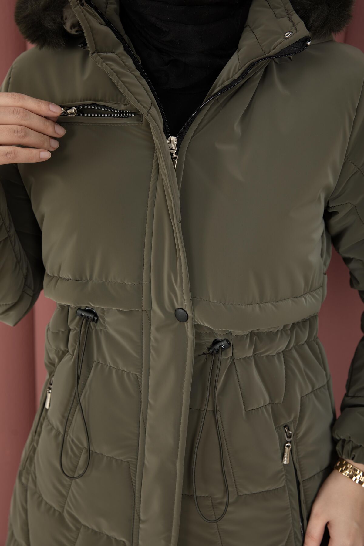 Kapüşonu Kürklü Fermuarlı Nova Kaban Haki