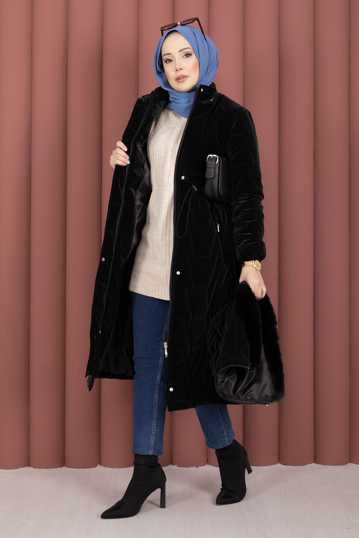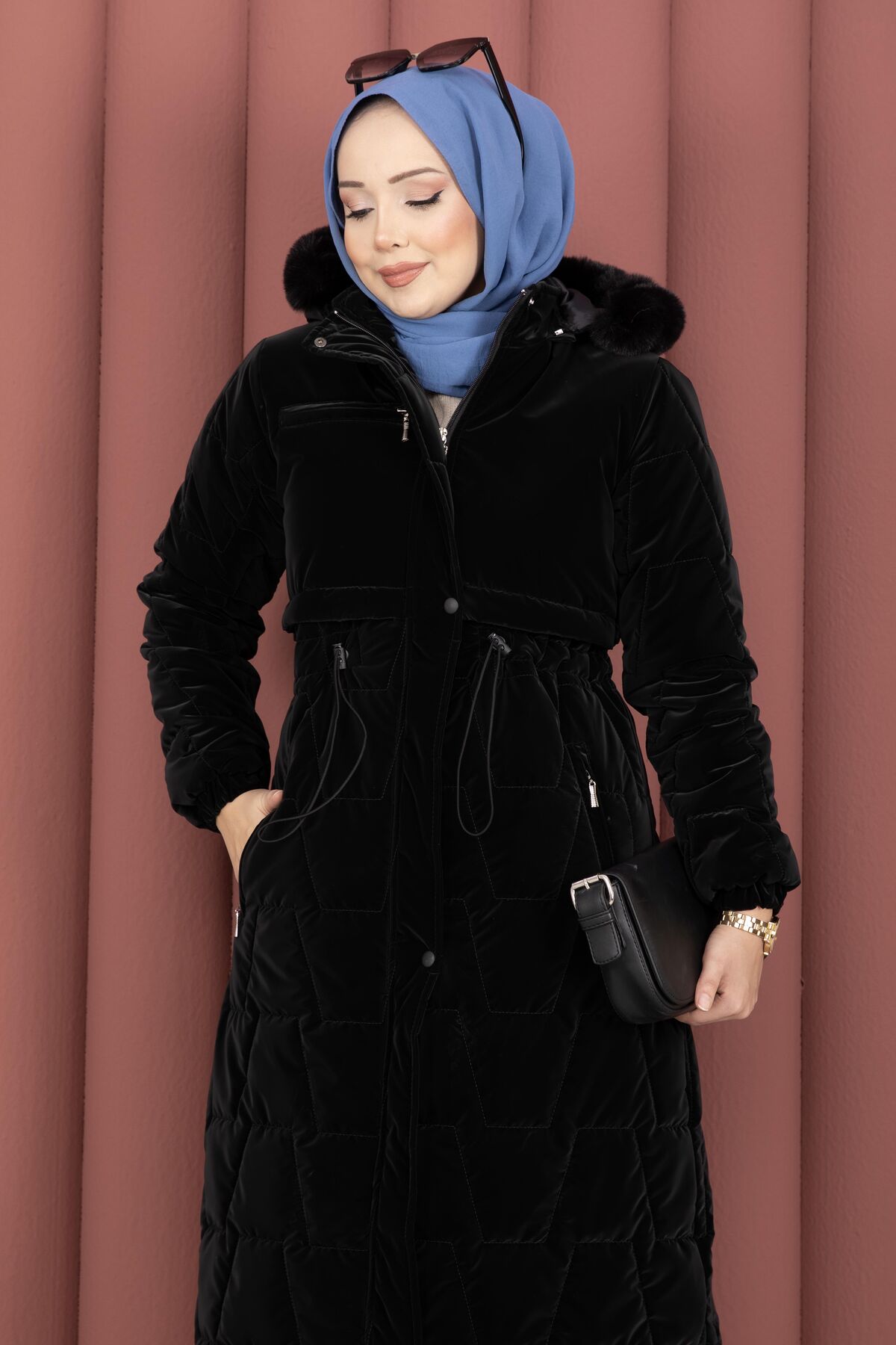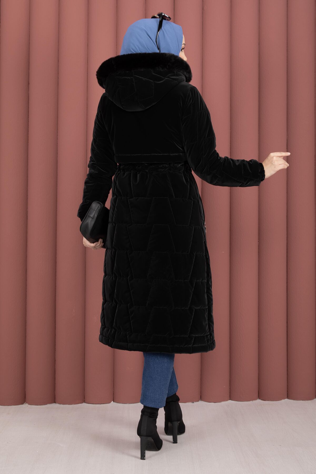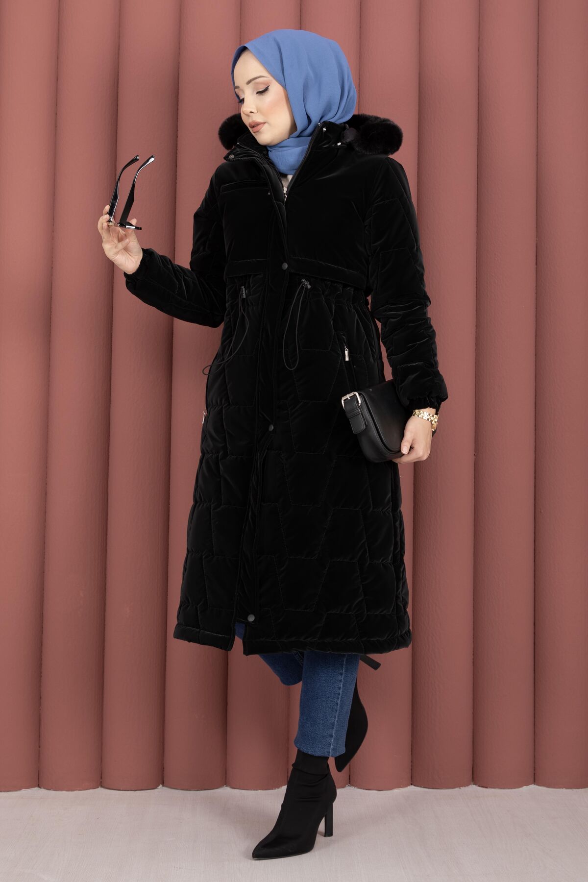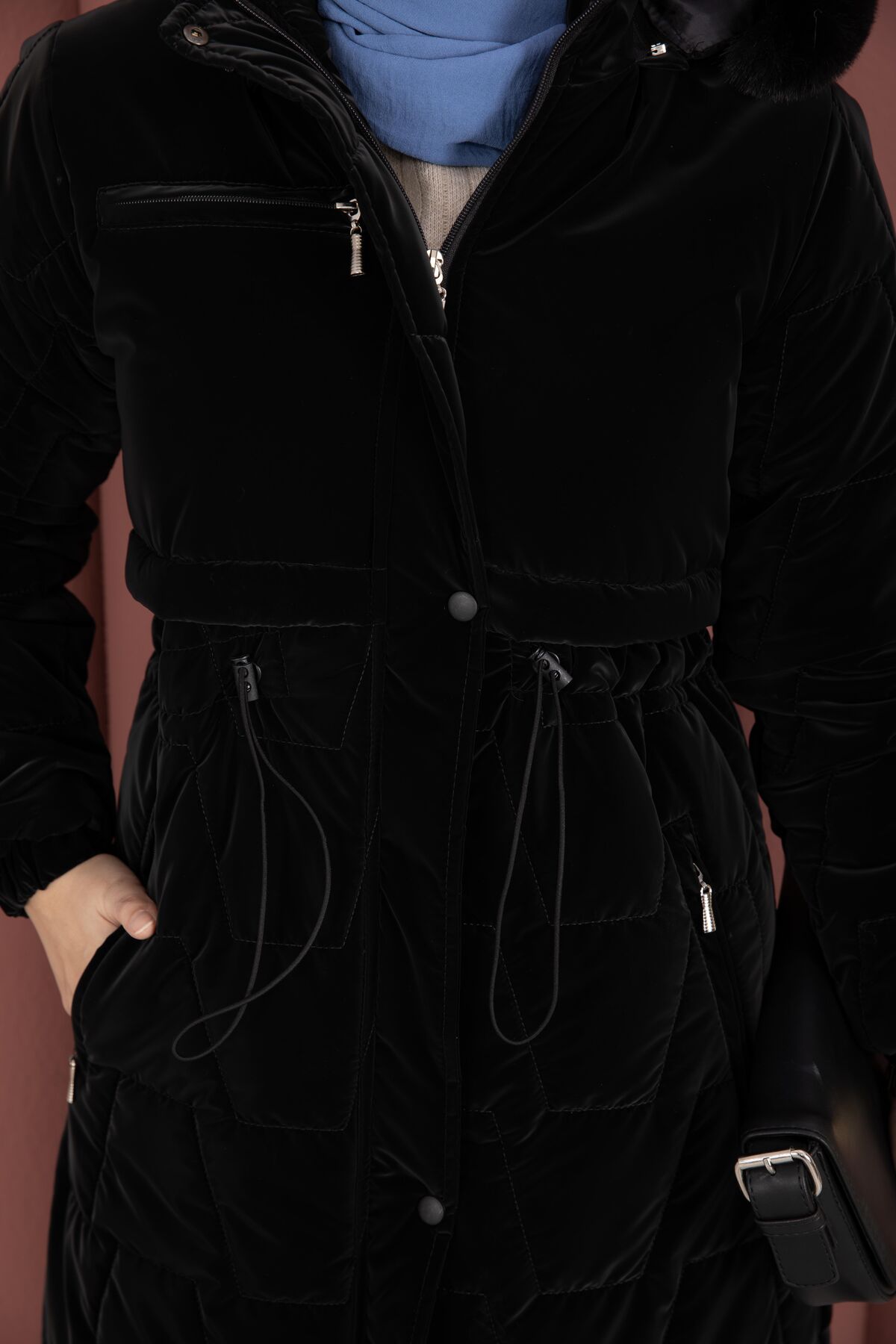 Kapüşonu Kürklü Fermuarlı Nova Kaban Siyah