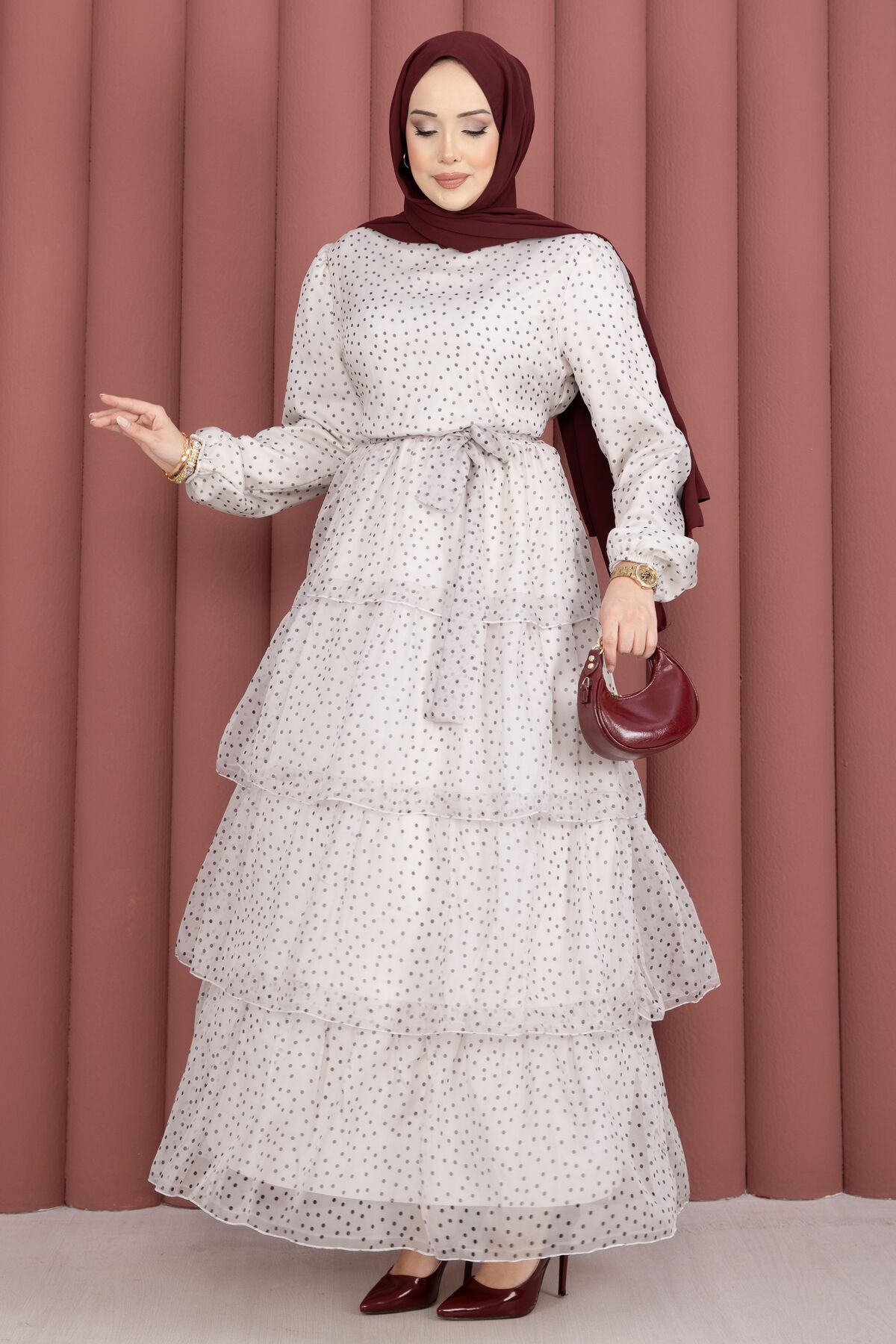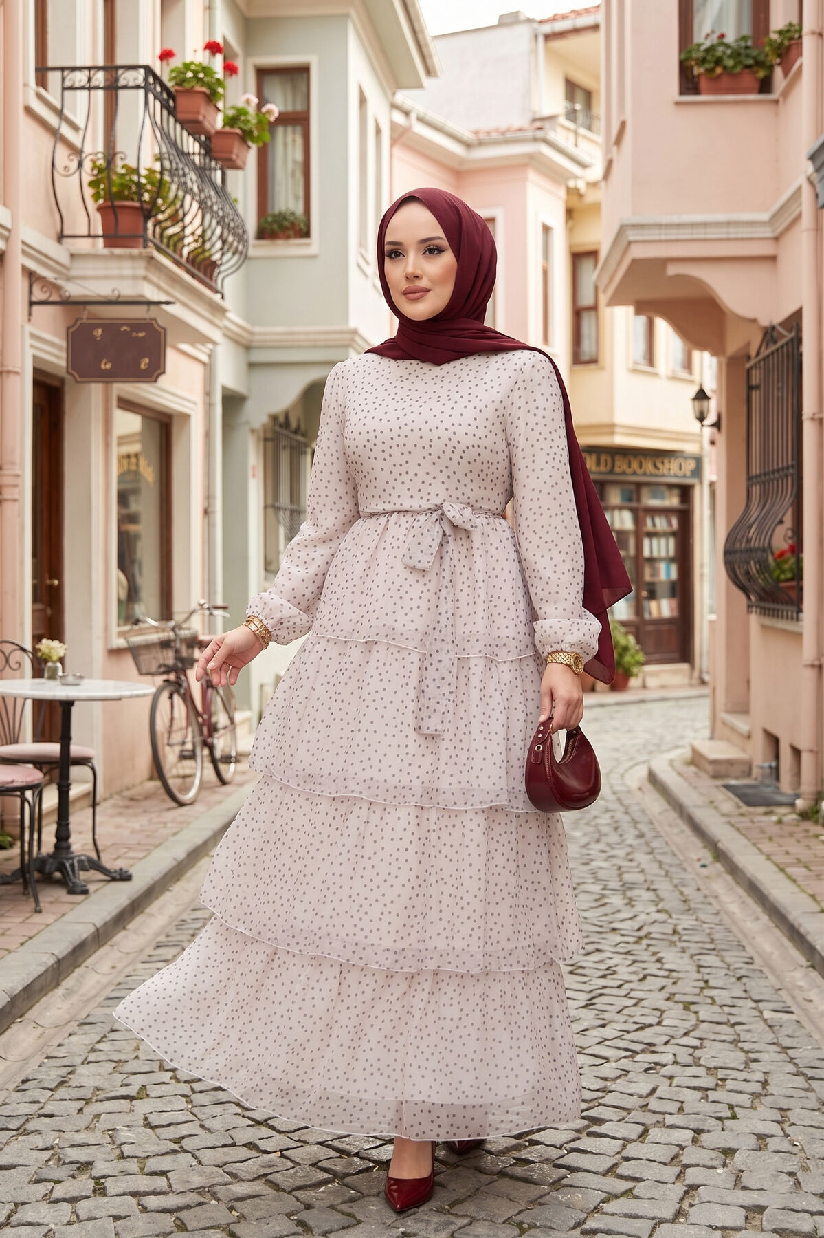 Kat Kat Beli Kuşaklı Puantiyeli Elbise Ekru
