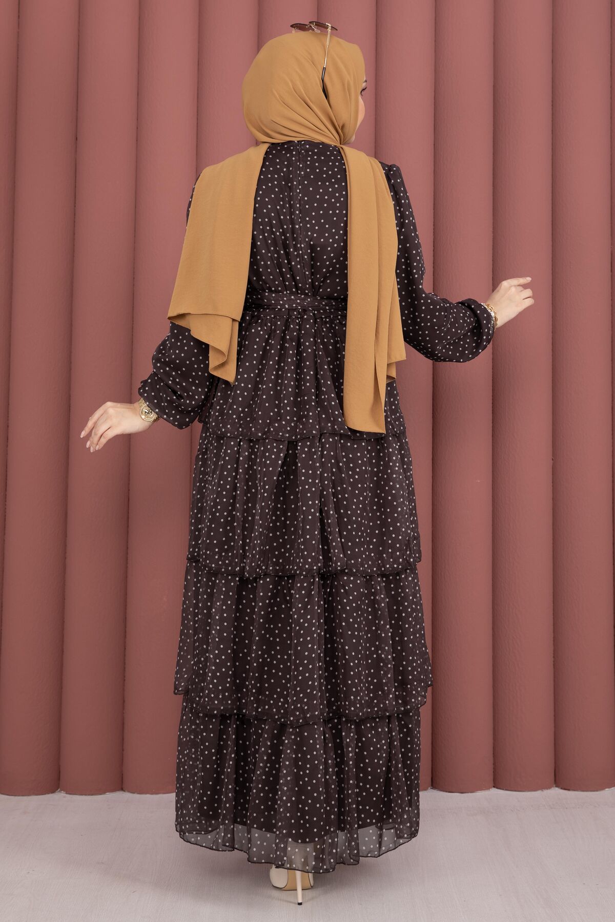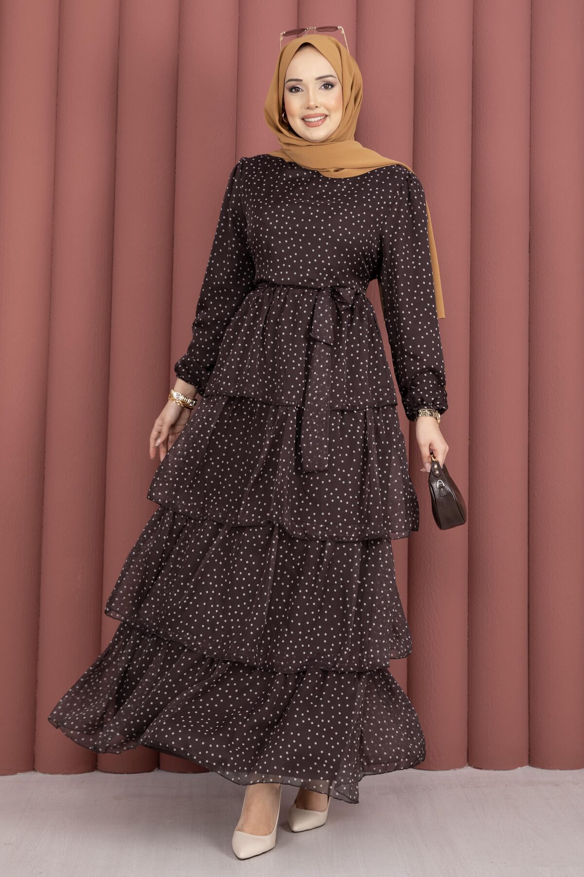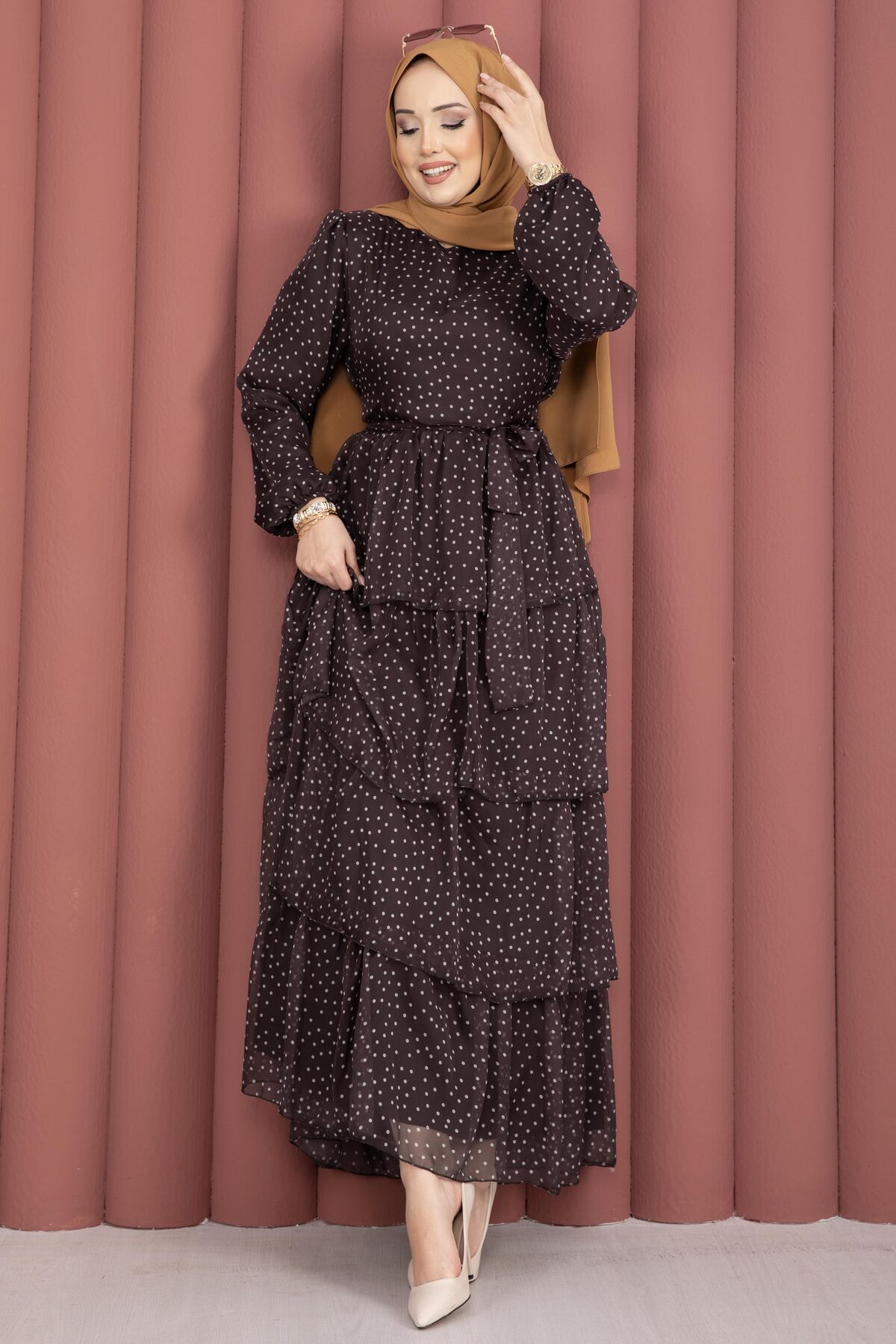 Kat Kat Beli Kuşaklı Puantiyeli Elbise Kahve