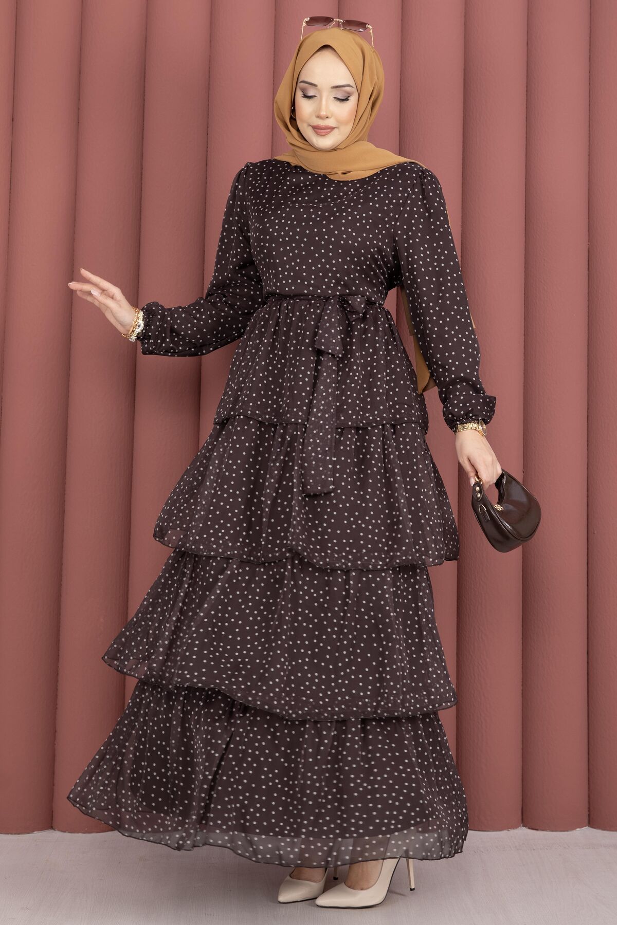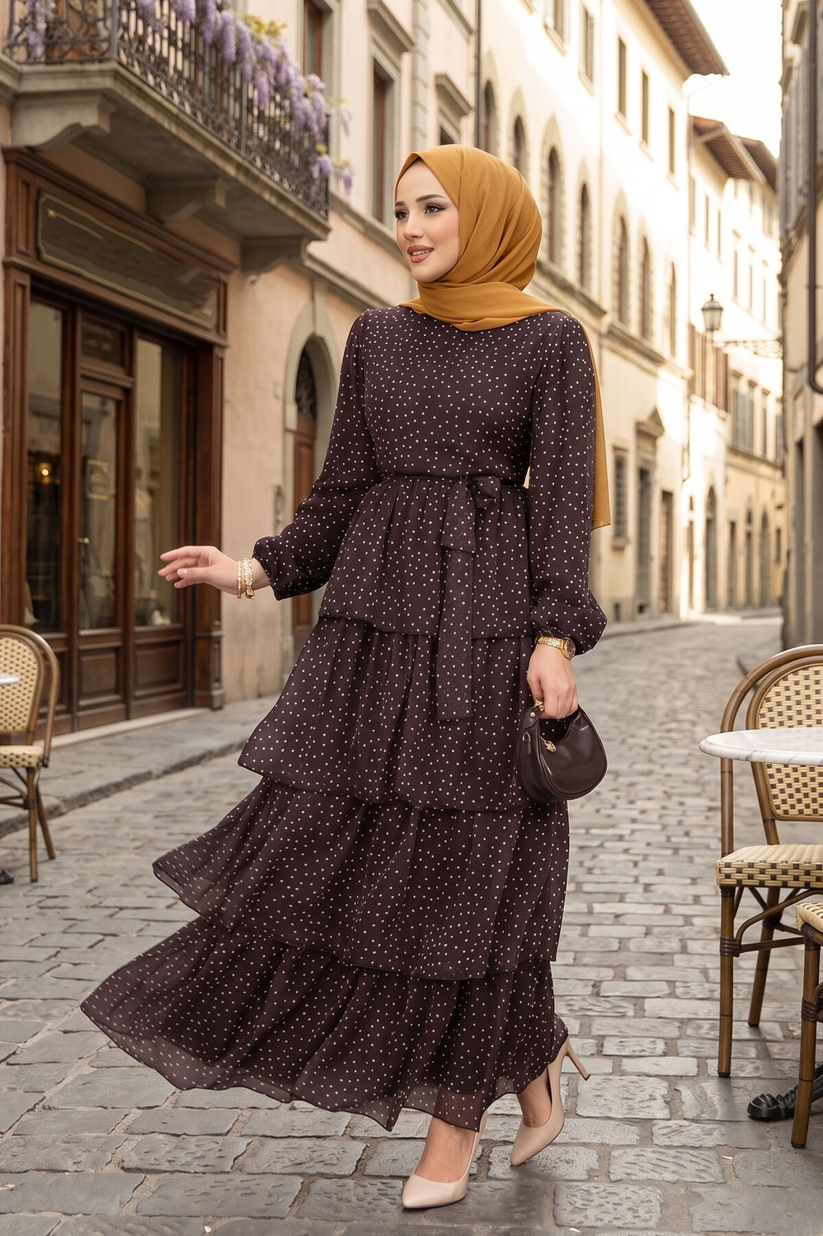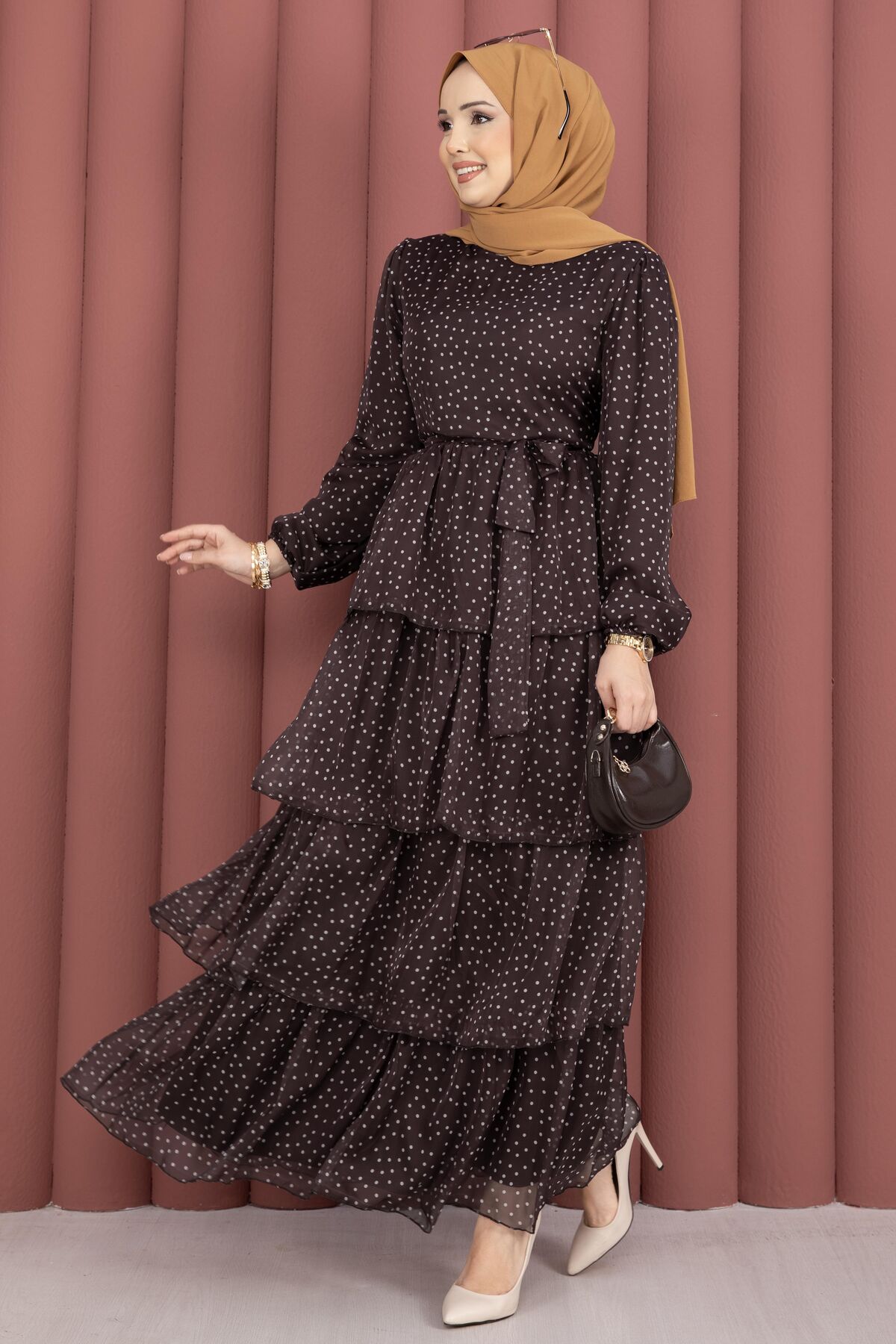 Kat Kat Beli Kuşaklı Puantiyeli Elbise Kahve