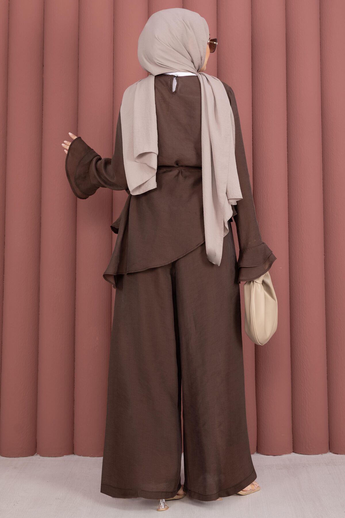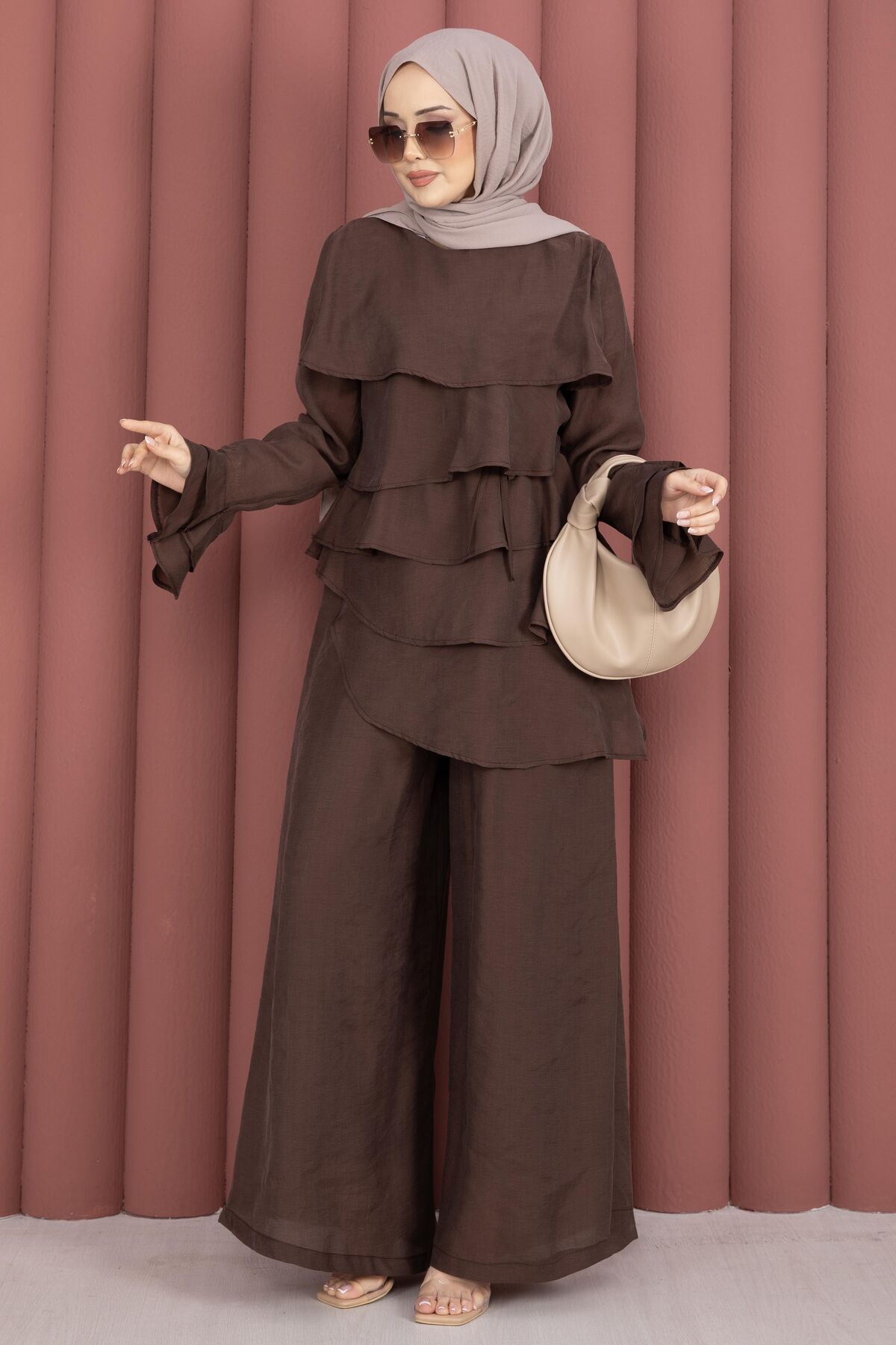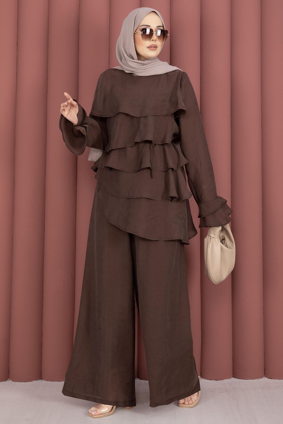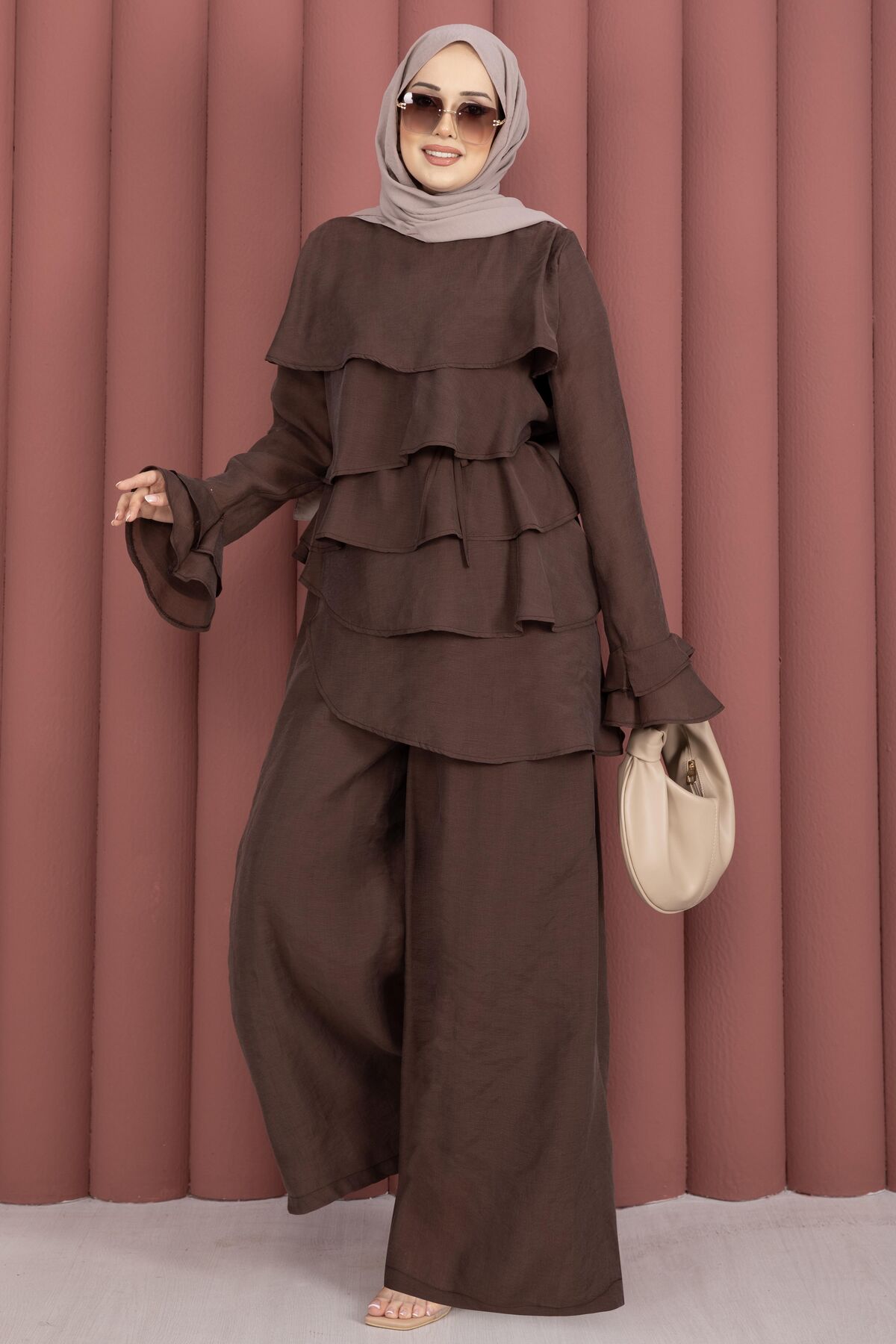 Kat Kat Fırfırlı Tunik Pantolon İkili Takım Kahve